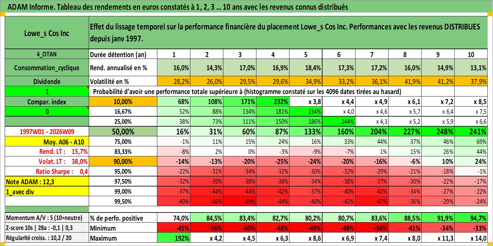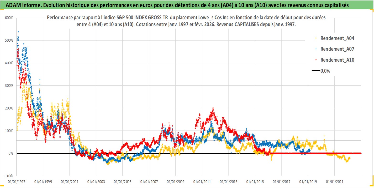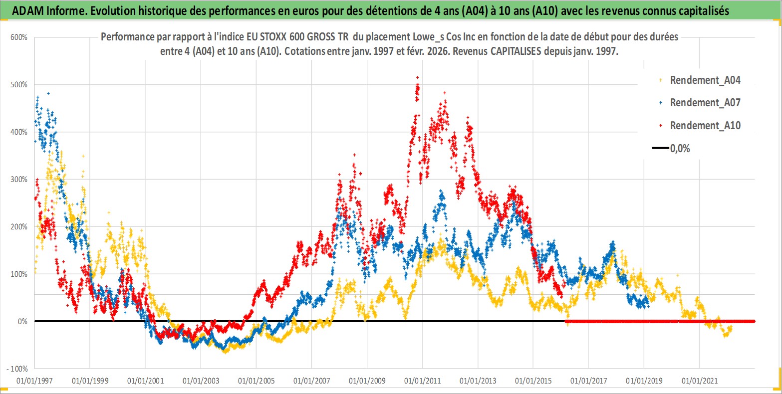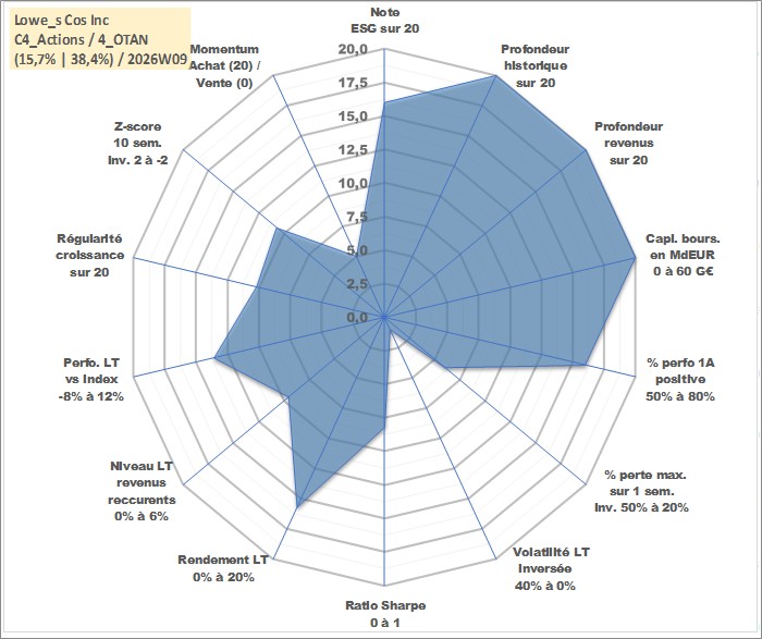 Site dédié aux investisseursPage dédiée sur site financeAnalyse des valorisations hebdomadaires de l'action Lowe_s Cos Inc. Cet actif est cote en USD. Les valorisations sont en contrevaleur EURO et couvrent les semaines 1997W01 a 2026W09. Les revenus de cet actif financier sont pris en compte depuis la semaine 1997W03. La note globale ESG de cet actif est estimee a 16.0 (apres rebasage entre 0 et 20).