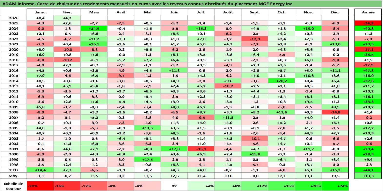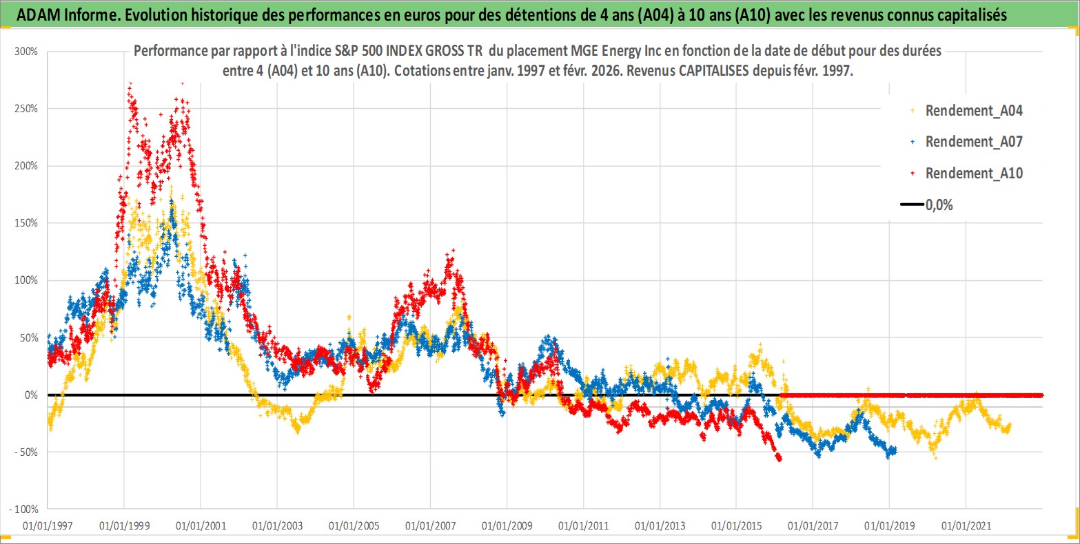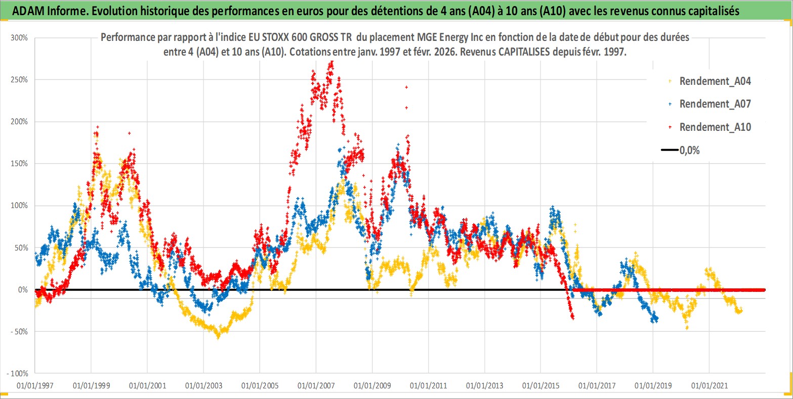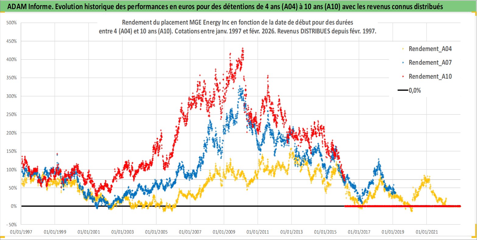 Site dédié aux investisseursPage dédiée sur site financeAnalyse des valorisations hebdomadaires de l'action MGE Energy Inc. Cet actif est cote en USD. Les valorisations sont en contrevaleur EURO et couvrent les semaines 1997W01 a 2026W09. Les revenus de cet actif financier sont pris en compte depuis la semaine 1997W09. La note ESG de cet actif n'est pas connue.