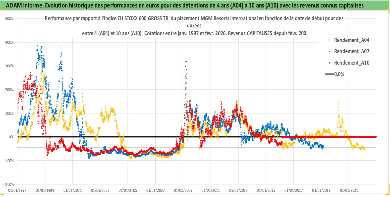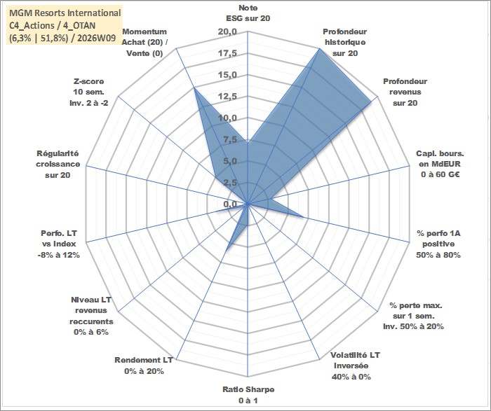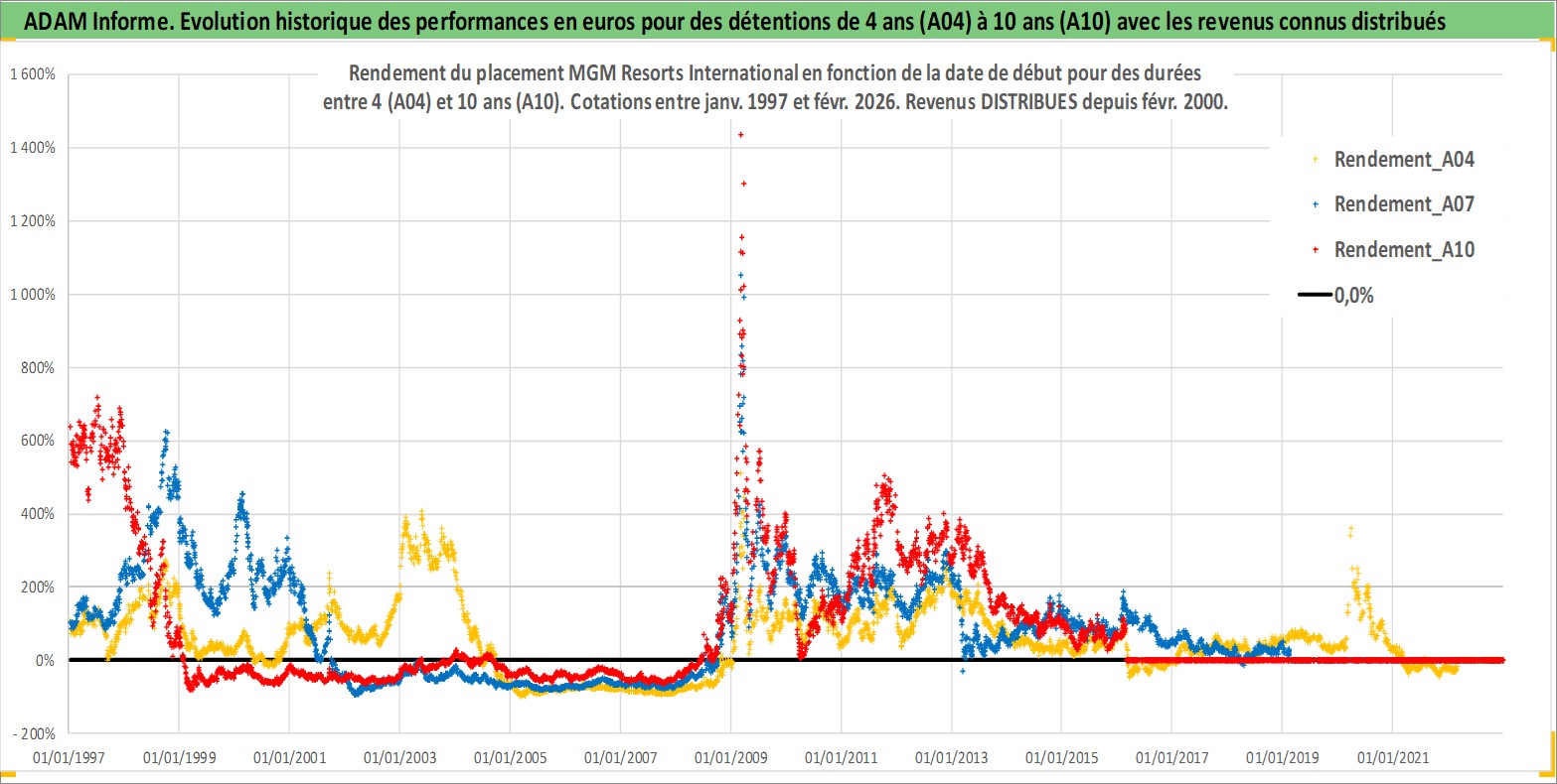 Site dédié aux investisseursPage dédiée sur site financeAnalyse des valorisations hebdomadaires de l'action MGM Resorts International. Cet actif est cote en USD. Les valorisations sont en contrevaleur EURO et couvrent les semaines 1997W01 a 2026W09. Les revenus de cet actif financier sont pris en compte depuis la semaine 2000W06. La note globale ESG de cet actif est estimee a 7.0 (apres rebasage entre 0 et 20).