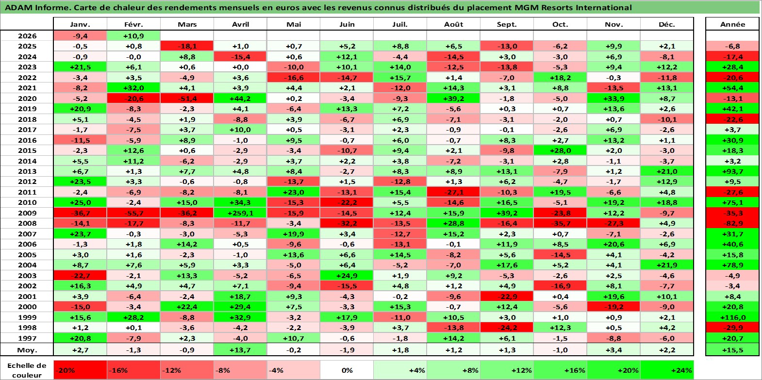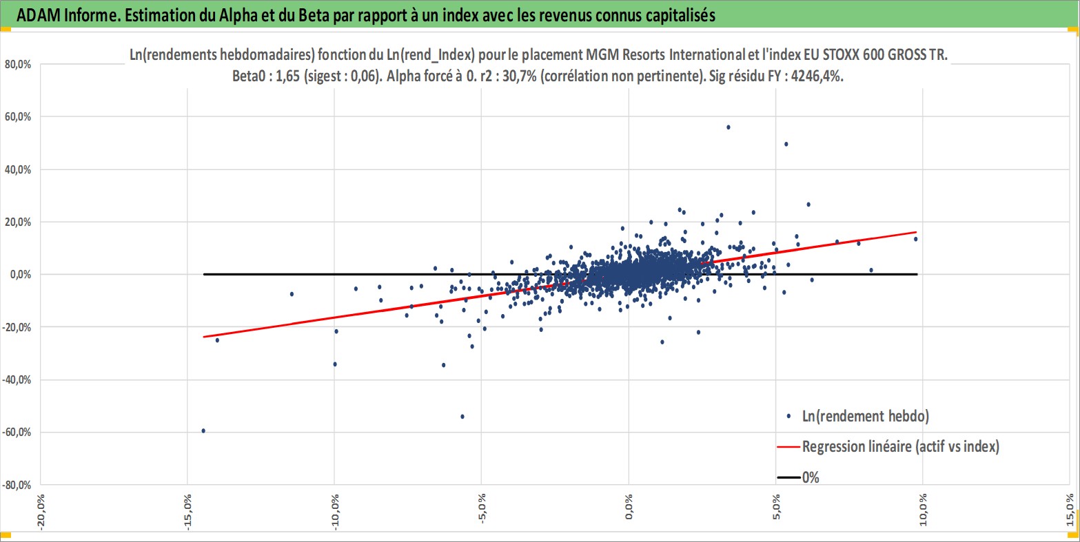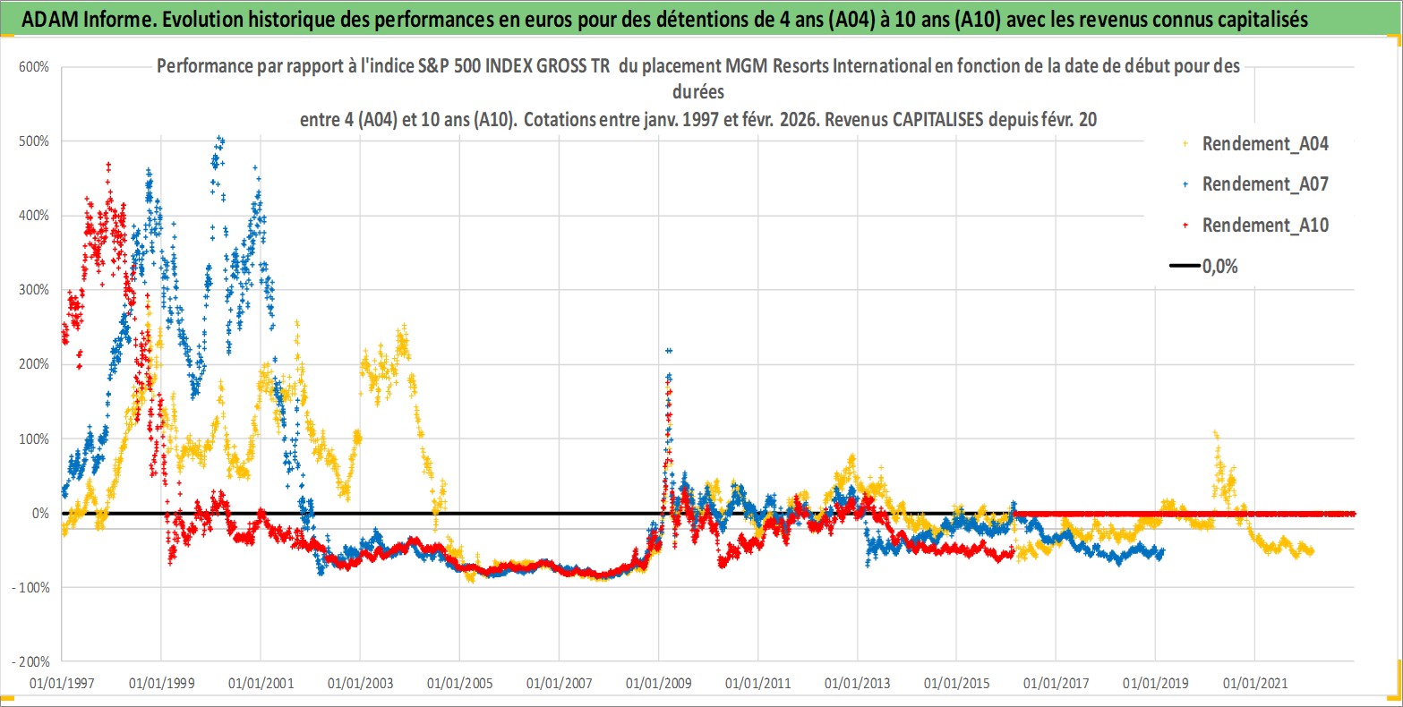 Site dédié aux investisseursPage dédiée sur site financeAnalyse des valorisations hebdomadaires de l'action MGM Resorts International. Cet actif est cote en USD. Les valorisations sont en contrevaleur EURO et couvrent les semaines 1997W01 a 2026W09. Les revenus de cet actif financier sont pris en compte depuis la semaine 2000W06. La note globale ESG de cet actif est estimee a 7.0 (apres rebasage entre 0 et 20).
