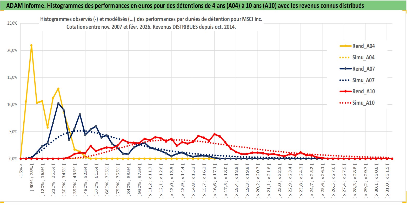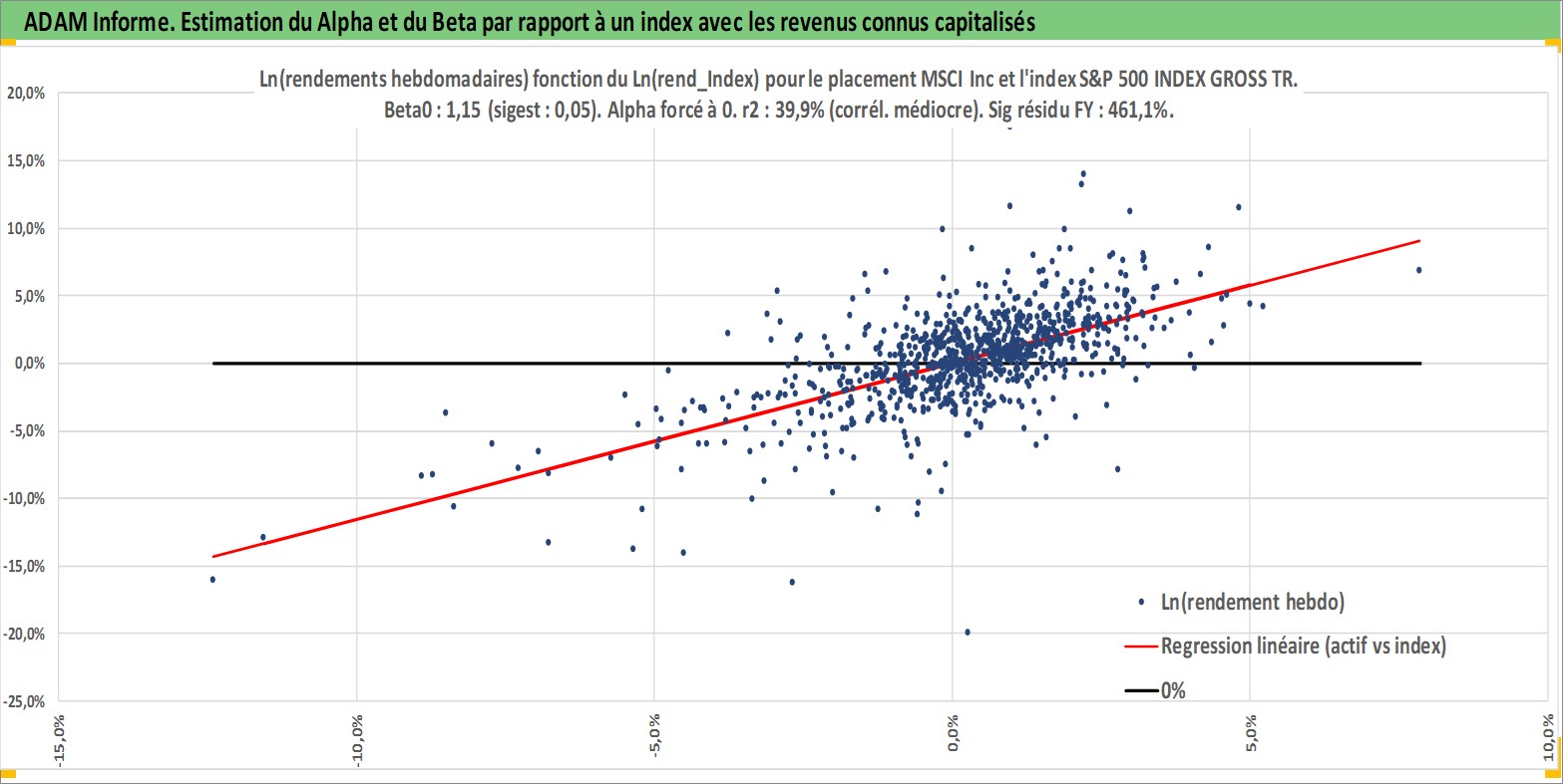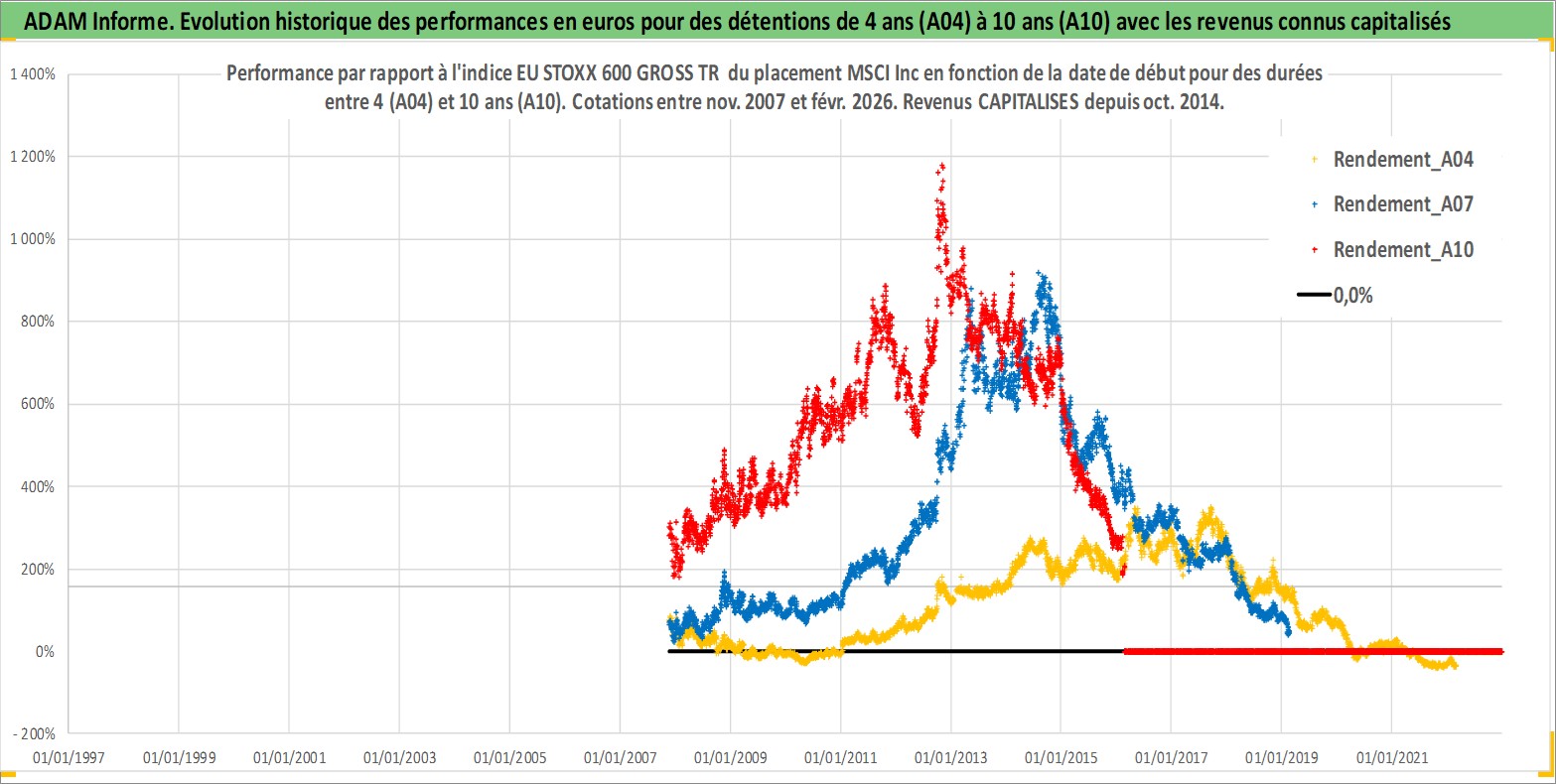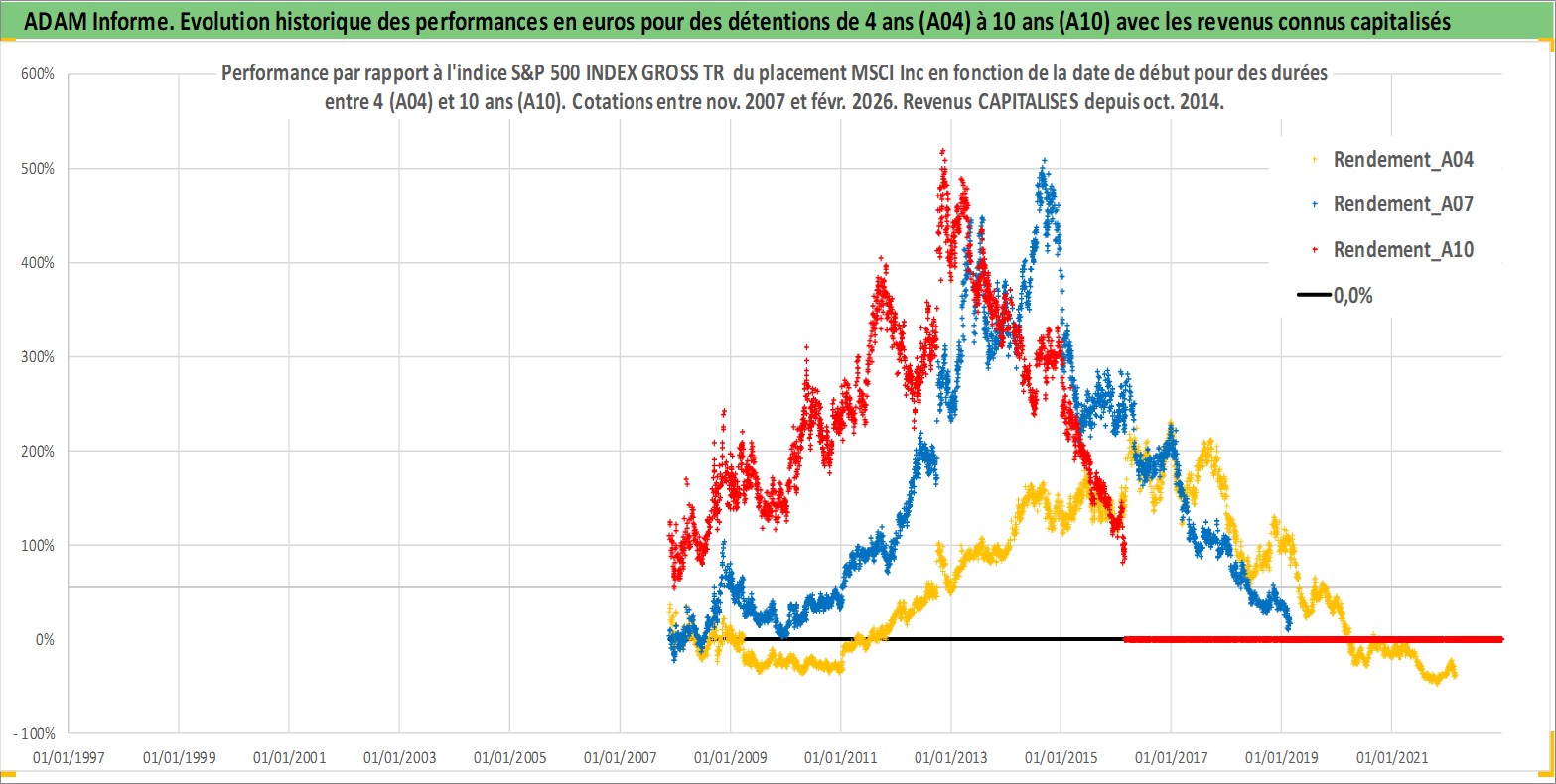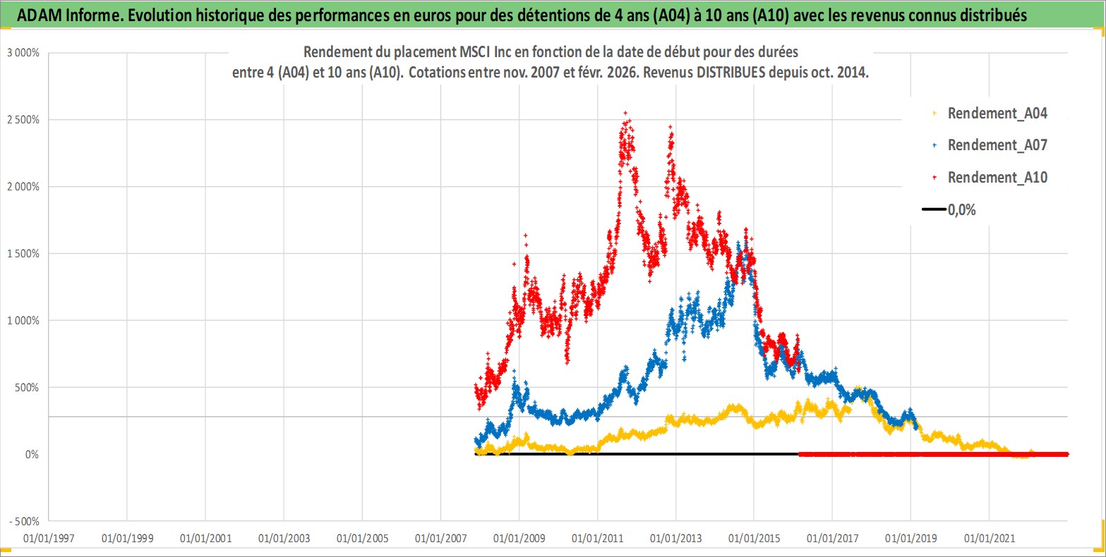 Site dédié aux investisseursPage dédiée sur site financeAnalyse des valorisations hebdomadaires de l'action MSCI Inc. Cet actif est cote en USD. Les valorisations sont en contrevaleur EURO et couvrent les semaines 2007W46 a 2026W09. Les revenus de cet actif financier sont pris en compte depuis la semaine 2014W41. La note globale ESG de cet actif est estimee a 13.0 (apres rebasage entre 0 et 20).