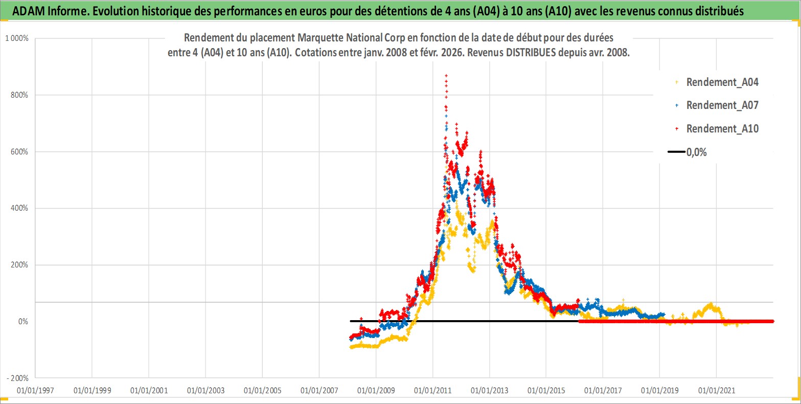 Site dédié aux investisseursPage dédiée sur site financeAnalyse des valorisations hebdomadaires de l'action Marquette National Corp. Cet actif est cote en USD. Les valorisations sont en contrevaleur EURO et couvrent les semaines 2008W05 a 2026W09. Les revenus de cet actif financier sont pris en compte depuis la semaine 2008W16. La note ESG de cet actif n'est pas connue.