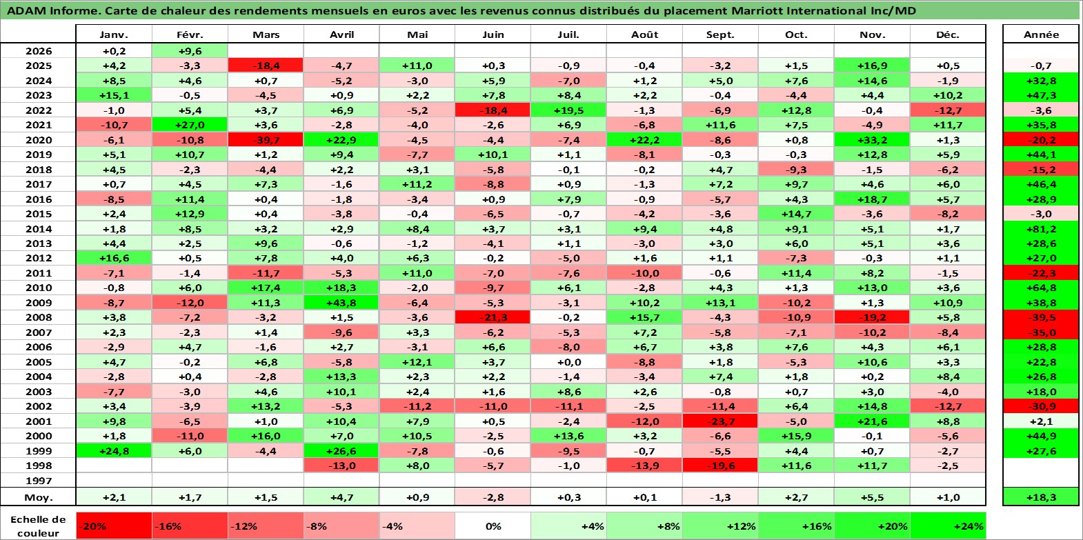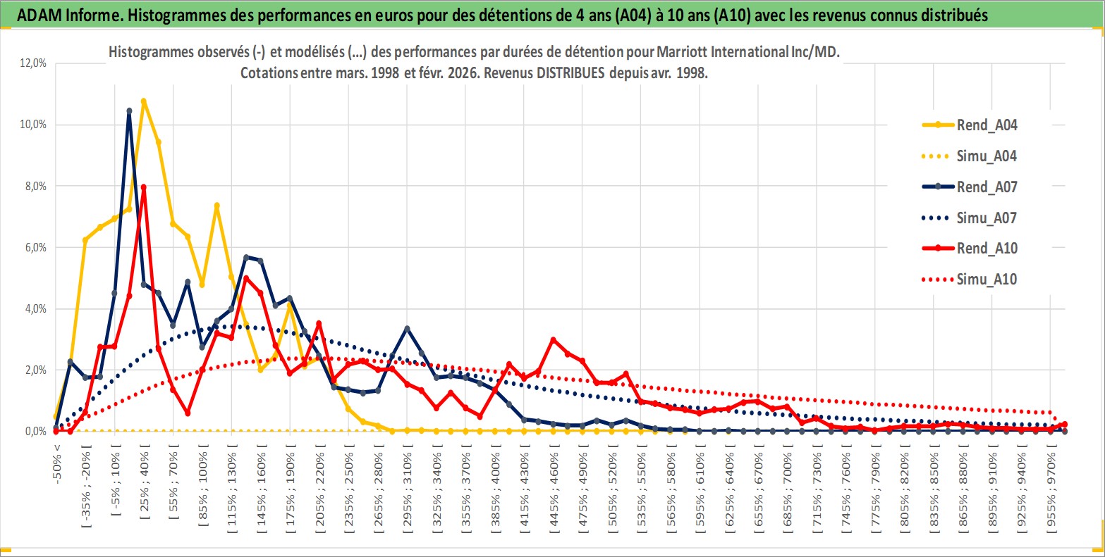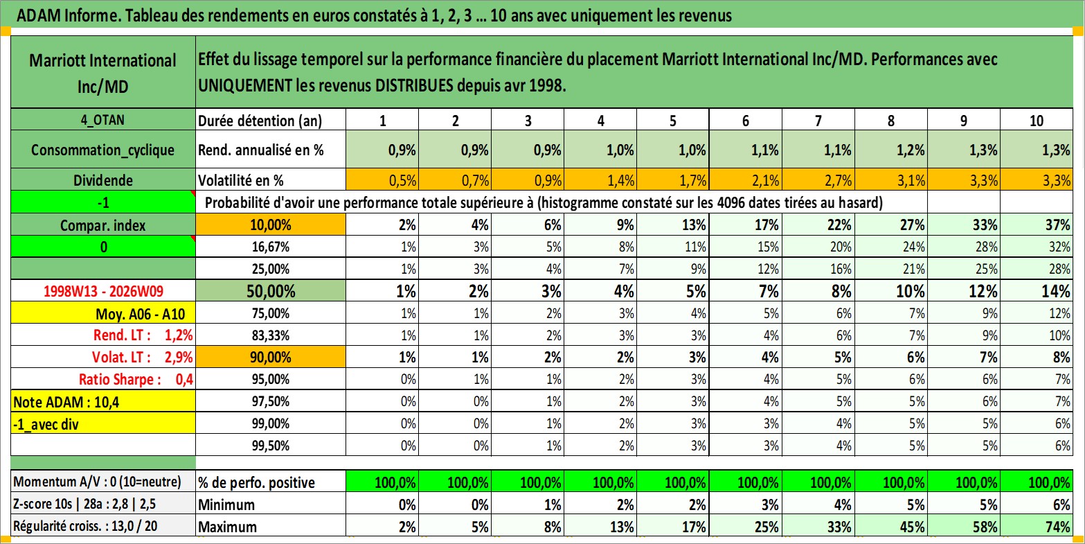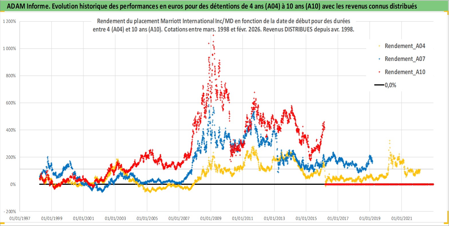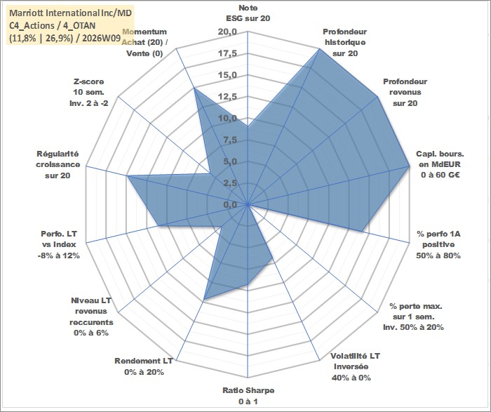 Site dédié aux investisseursPage dédiée sur site financeAnalyse des valorisations hebdomadaires de l'action Marriott International Inc/MD. Cet actif est cote en USD. Les valorisations sont en contrevaleur EURO et couvrent les semaines 1998W13 a 2026W09. Les revenus de cet actif financier sont pris en compte depuis la semaine 1998W16. La note globale ESG de cet actif est estimee a 9.0 (apres rebasage entre 0 et 20).