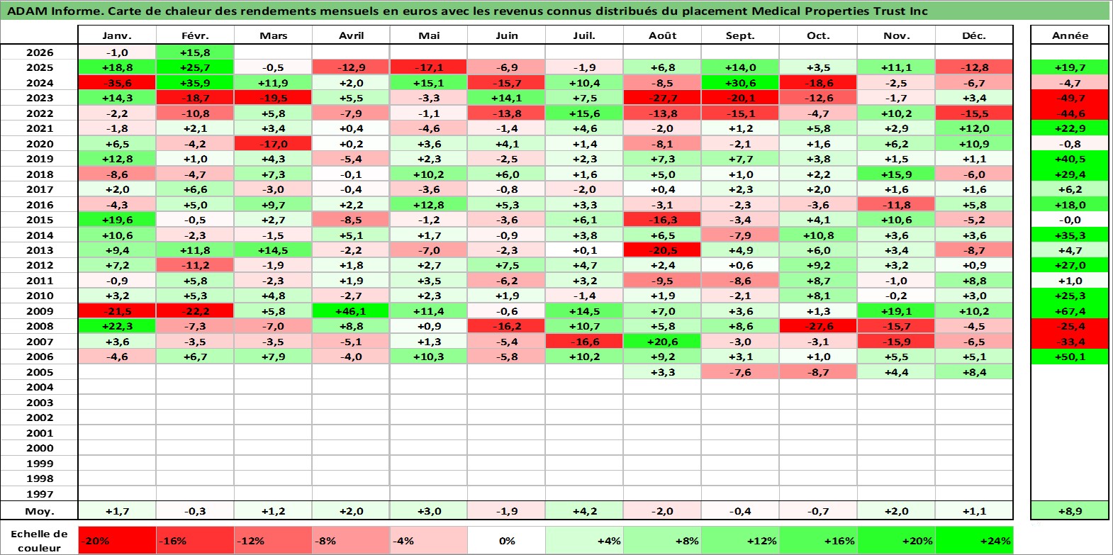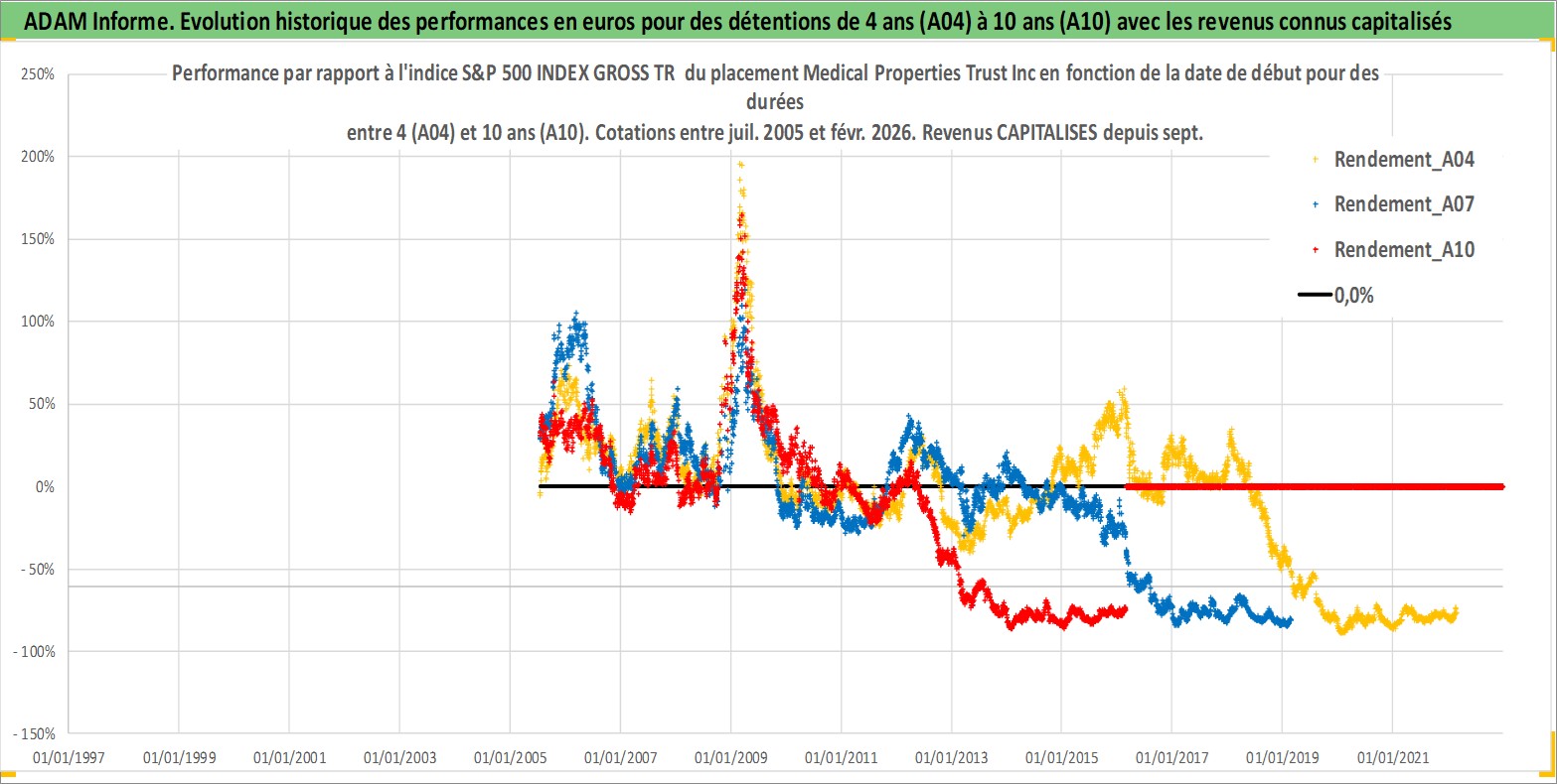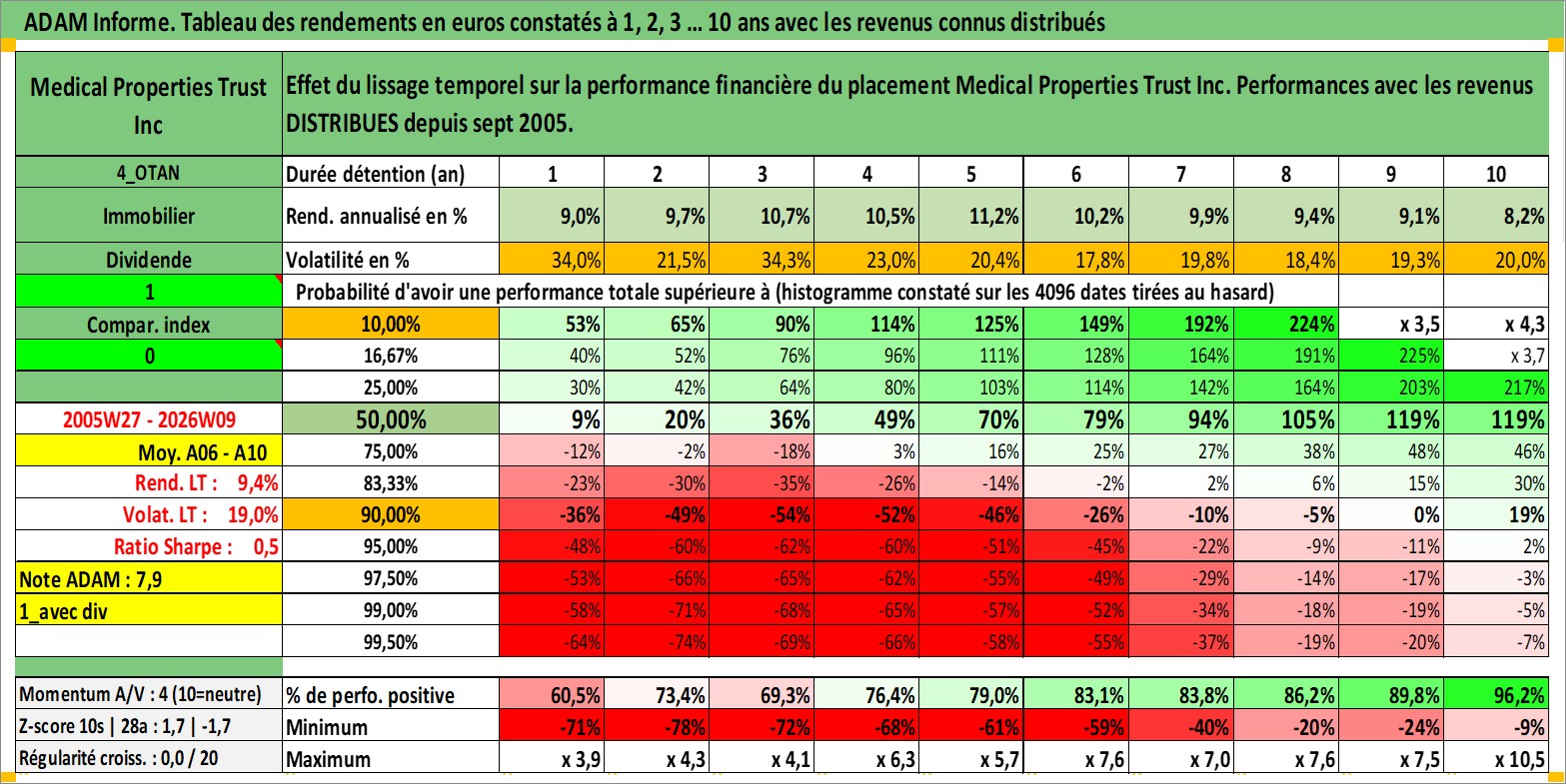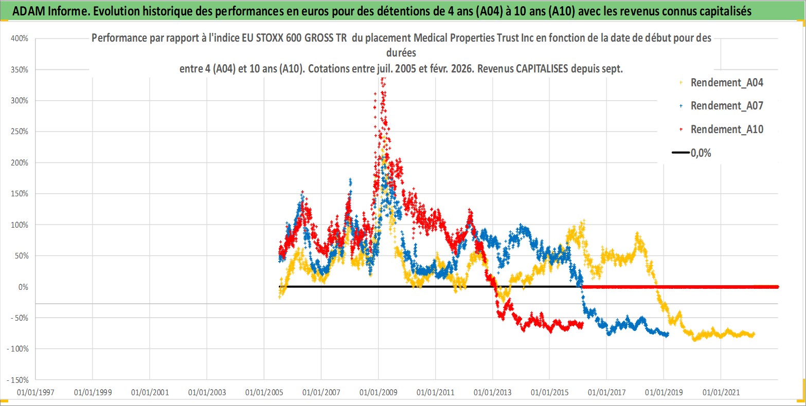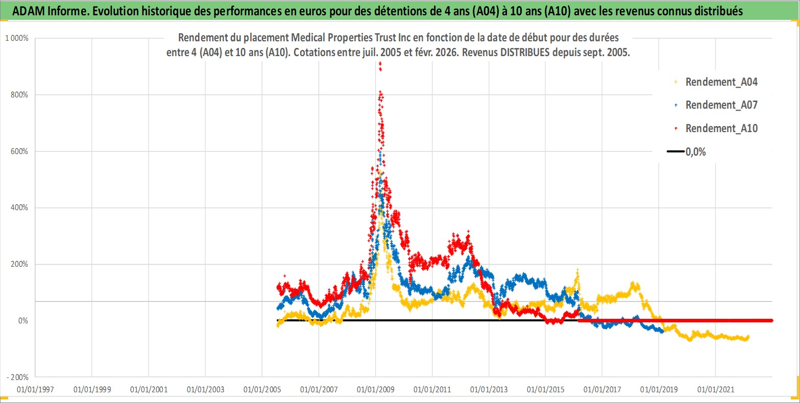 Site dédié aux investisseursPage dédiée sur site financeAnalyse des valorisations hebdomadaires de l'action Medical Properties Trust Inc. Cet actif est cote en USD. Les valorisations sont en contrevaleur EURO et couvrent les semaines 2005W27 a 2026W09. Les revenus de cet actif financier sont pris en compte depuis la semaine 2005W37. La note ESG de cet actif n'est pas connue.
