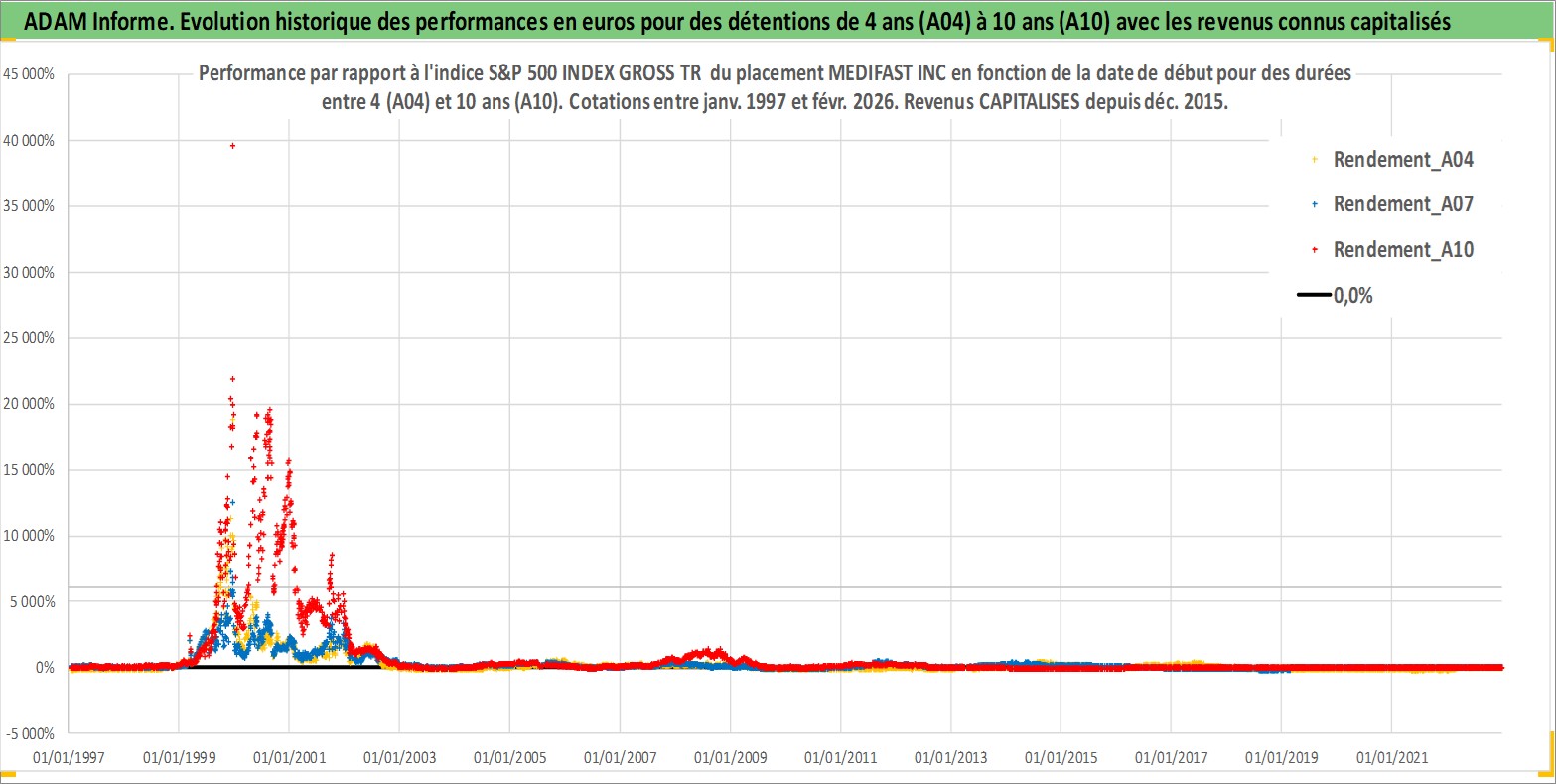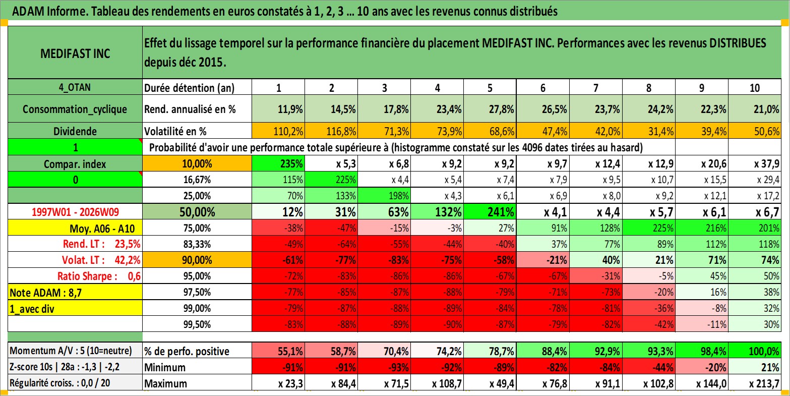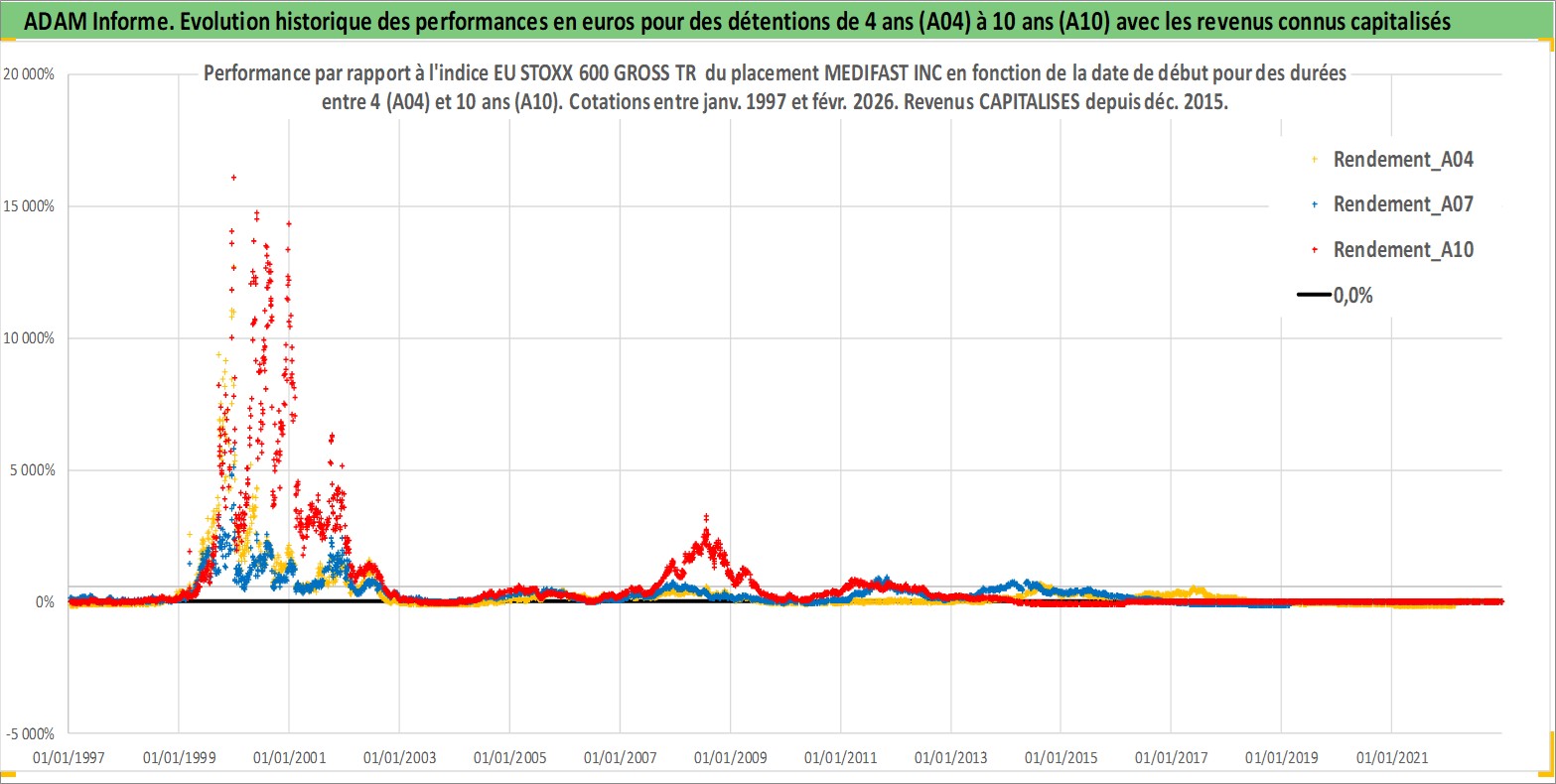 Site dédié aux investisseursPage dédiée sur site financeAnalyse des valorisations hebdomadaires de l'action MEDIFAST INC. Cet actif est cote en USD. Les valorisations sont en contrevaleur EURO et couvrent les semaines 1997W01 a 2026W09. Les revenus de cet actif financier sont pris en compte depuis la semaine 2015W52. La note ESG de cet actif n'est pas connue.