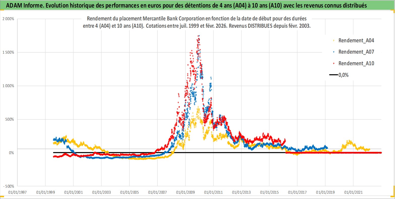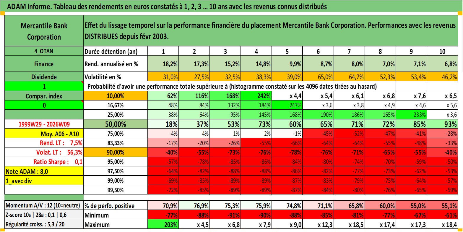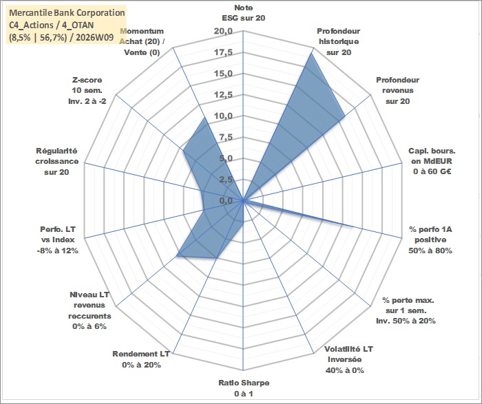 Site dédié aux investisseursPage dédiée sur site financeAnalyse des valorisations hebdomadaires de l'action Mercantile Bank Corporation. Cet actif est cote en USD. Les valorisations sont en contrevaleur EURO et couvrent les semaines 1999W29 a 2026W09. Les revenus de cet actif financier sont pris en compte depuis la semaine 2003W06. La note ESG de cet actif n'est pas connue.