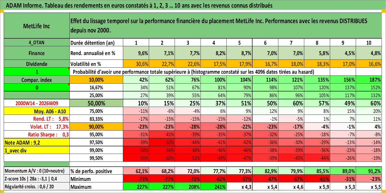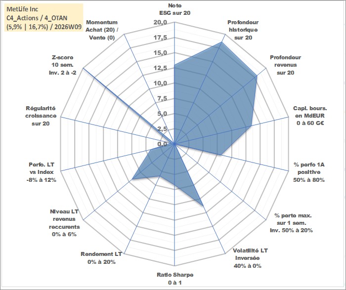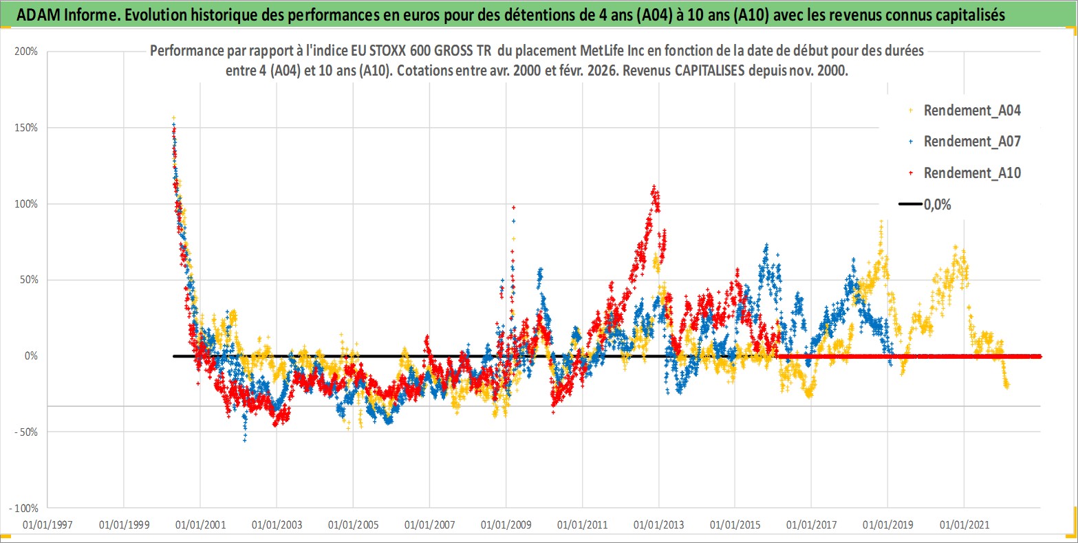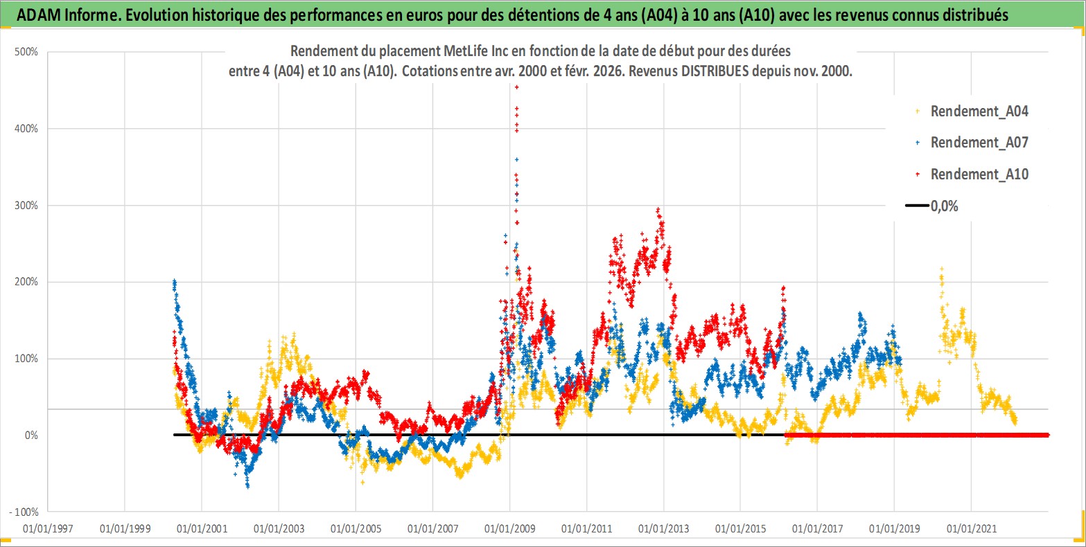Site dédié aux investisseursPage dédiée sur site financeAnalyse des valorisations hebdomadaires de l'action MetLife Inc. Cet actif est cote en USD. Les valorisations sont en contrevaleur EURO et couvrent les semaines 2000W14 a 2026W09. Les revenus de cet actif financier sont pris en compte depuis la semaine 2000W44. La note globale ESG de cet actif est estimee a 13.0 (apres rebasage entre 0 et 20).