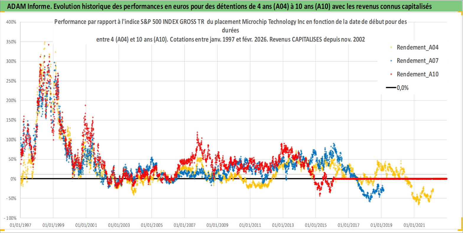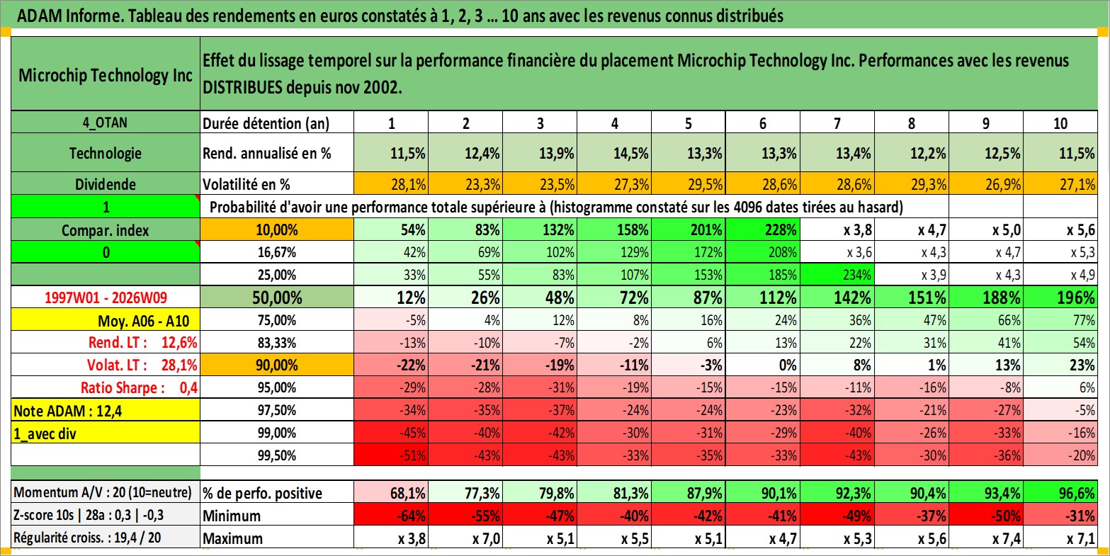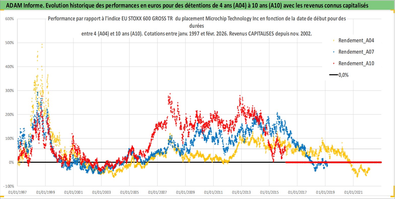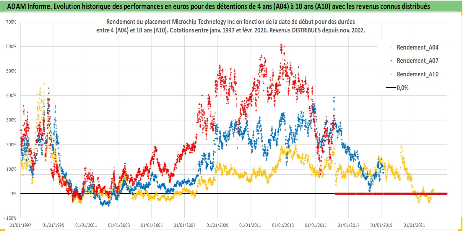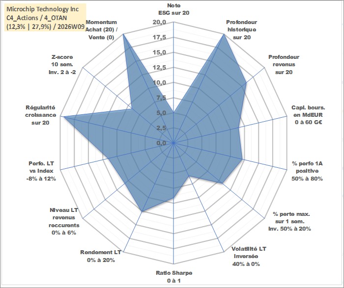 Site dédié aux investisseursPage dédiée sur site financeAnalyse des valorisations hebdomadaires de l'action Microchip Technology Inc. Cet actif est cote en USD. Les valorisations sont en contrevaleur EURO et couvrent les semaines 1997W01 a 2026W09. Les revenus de cet actif financier sont pris en compte depuis la semaine 2002W45. La note globale ESG de cet actif est estimee a 5.0 (apres rebasage entre 0 et 20).