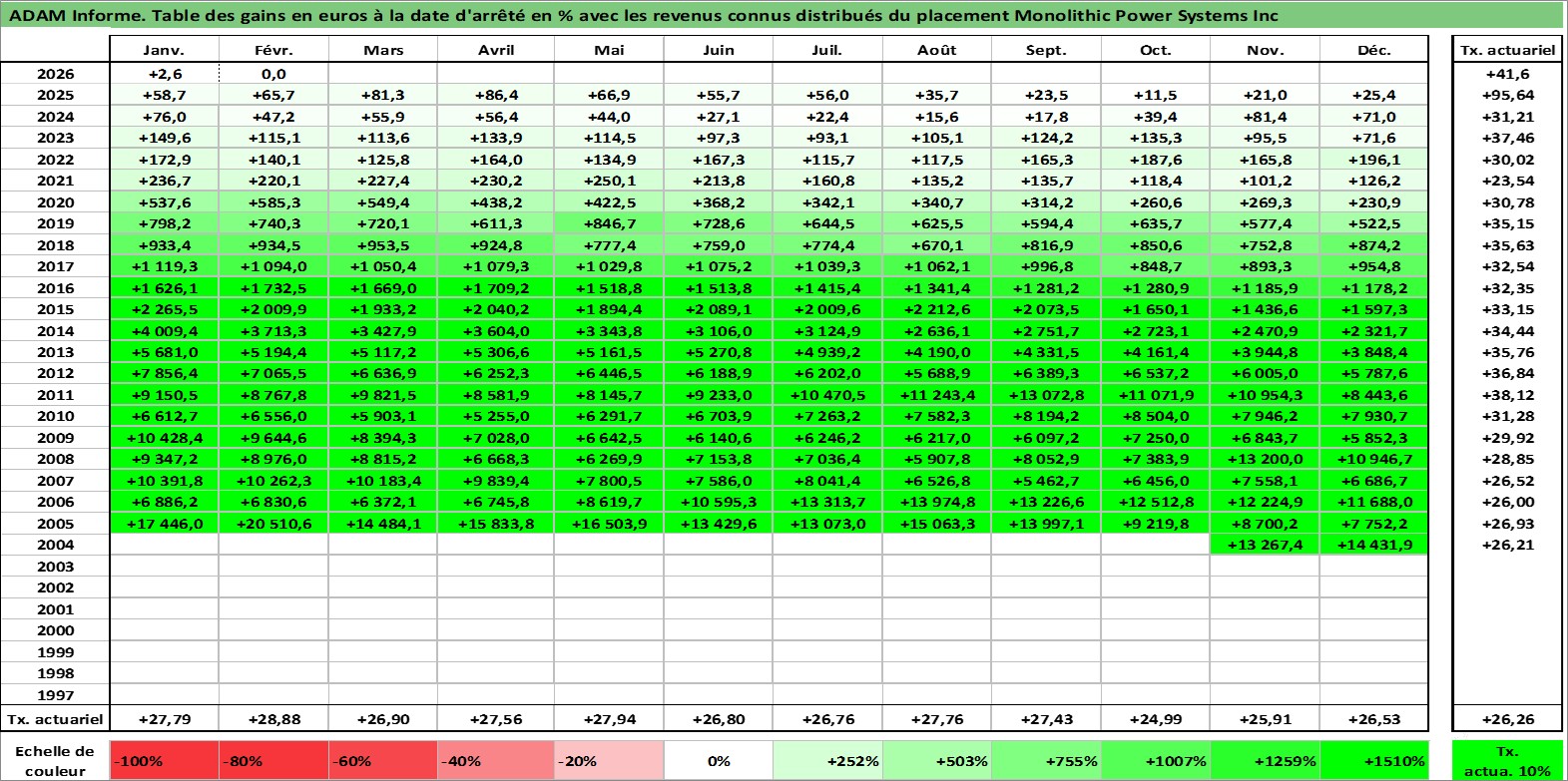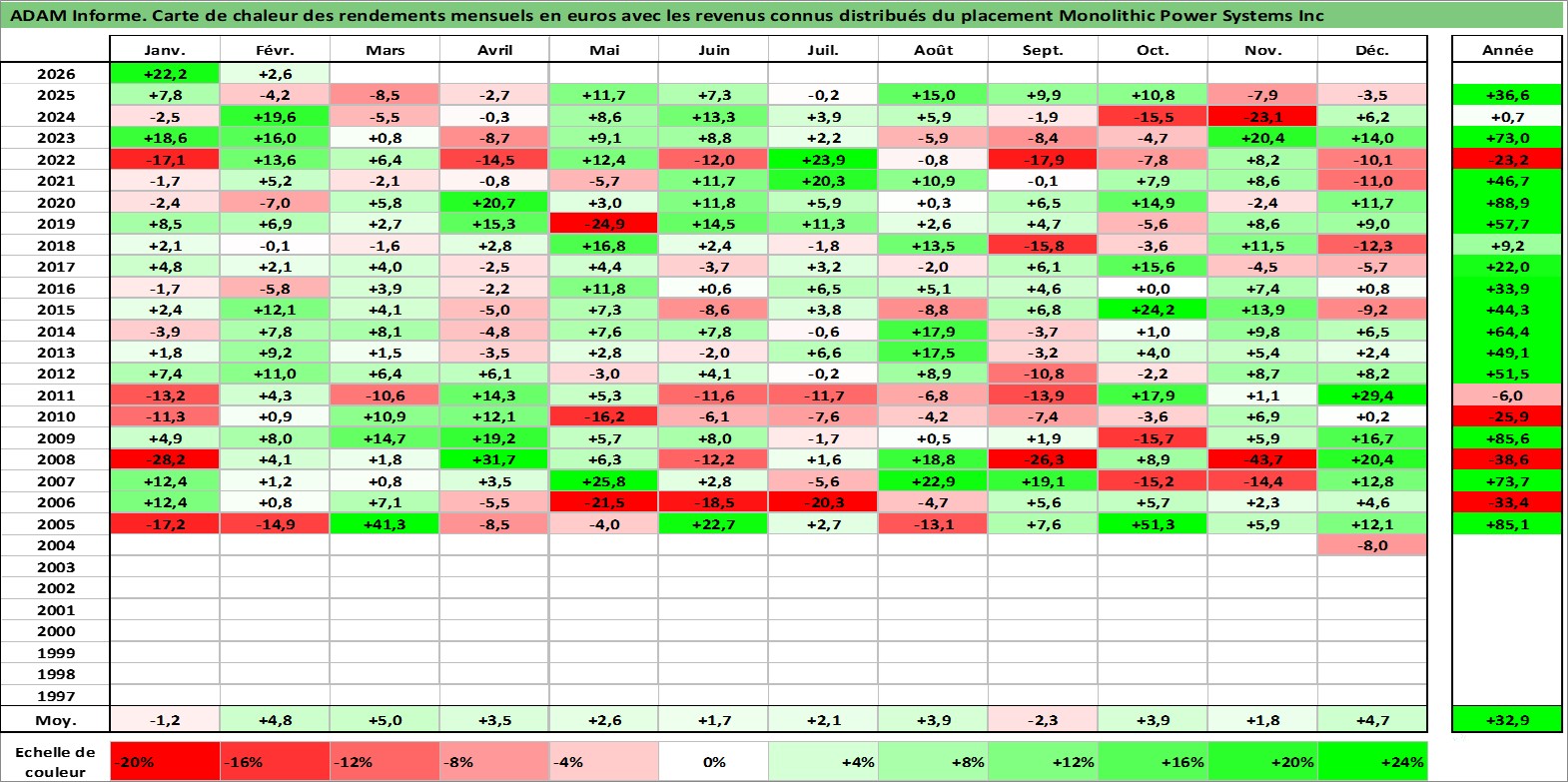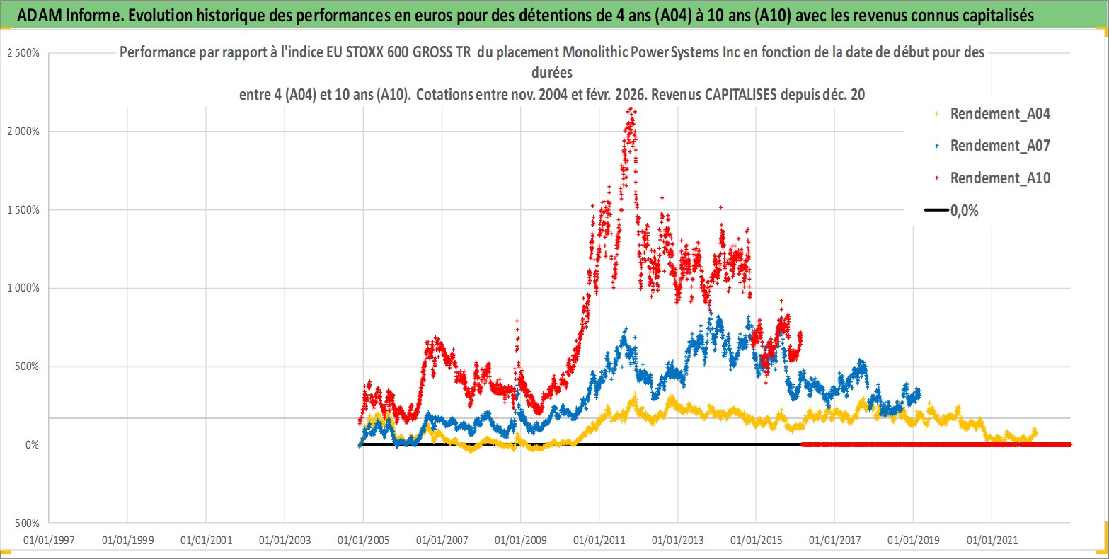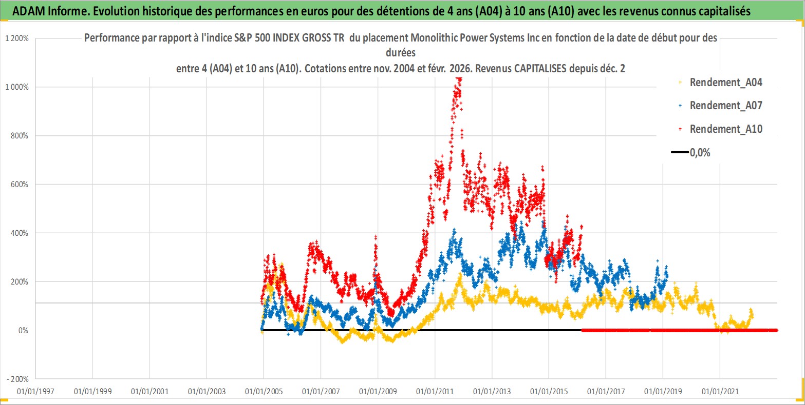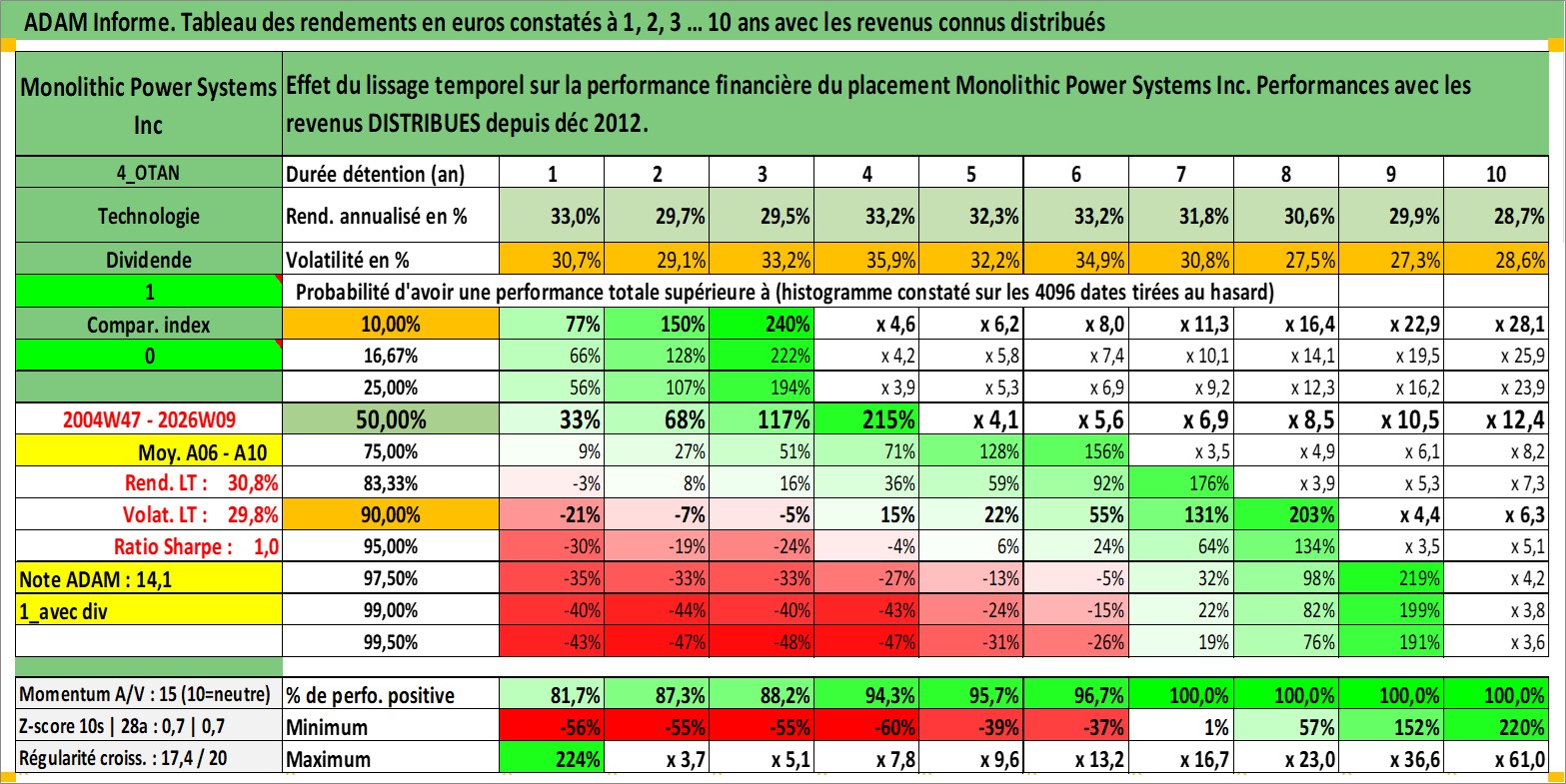 Site dédié aux investisseursPage dédiée sur site financeAnalyse des valorisations hebdomadaires de l'action Monolithic Power Systems Inc. Cet actif est cote en USD. Les valorisations sont en contrevaleur EURO et couvrent les semaines 2004W47 a 2026W09. Les revenus de cet actif financier sont pris en compte depuis la semaine 2012W51. La note ESG de cet actif n'est pas connue.