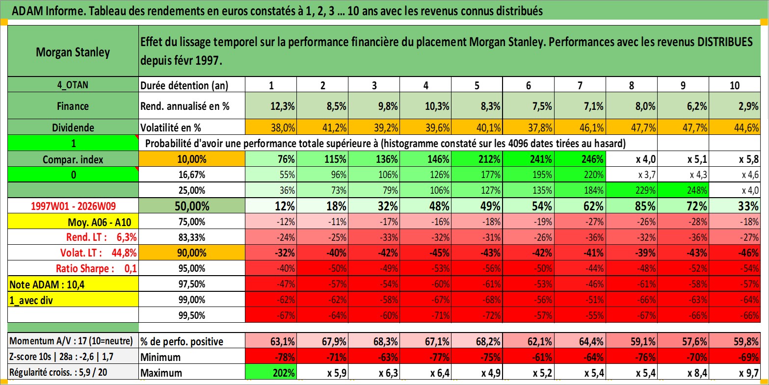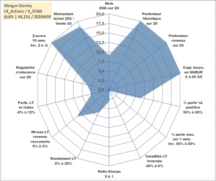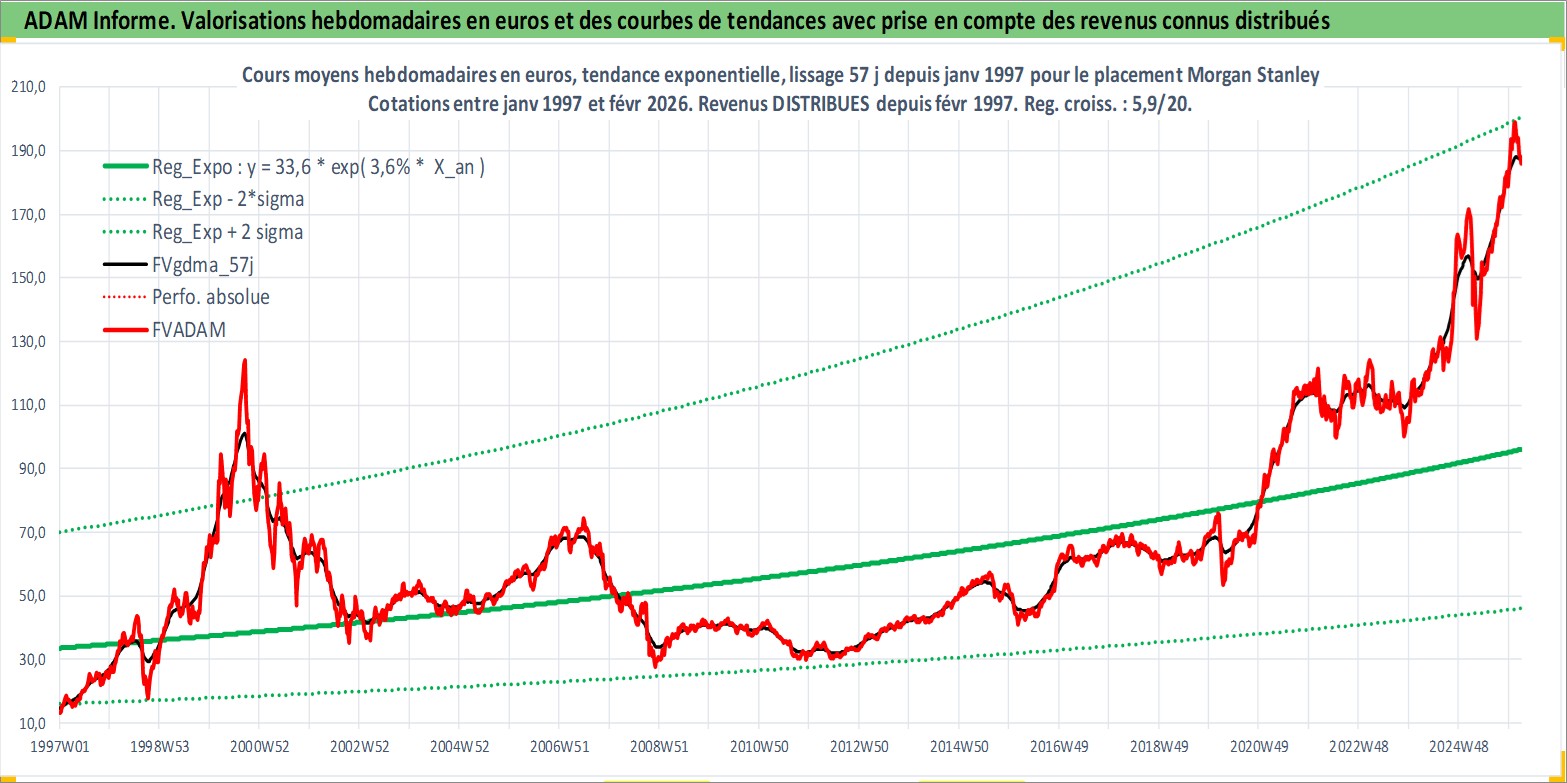 Site dédié aux investisseursPage dédiée sur site financeAnalyse des valorisations hebdomadaires de l'action Morgan Stanley. Cet actif est cote en USD. Les valorisations sont en contrevaleur EURO et couvrent les semaines 1997W01 a 2026W09. Les revenus de cet actif financier sont pris en compte depuis la semaine 1997W09. La note globale ESG de cet actif est estimee a 9.0 (apres rebasage entre 0 et 20).