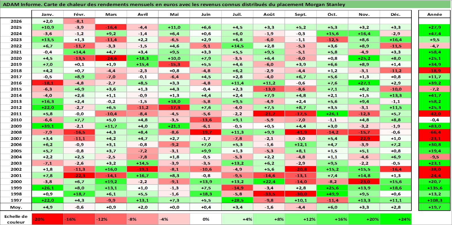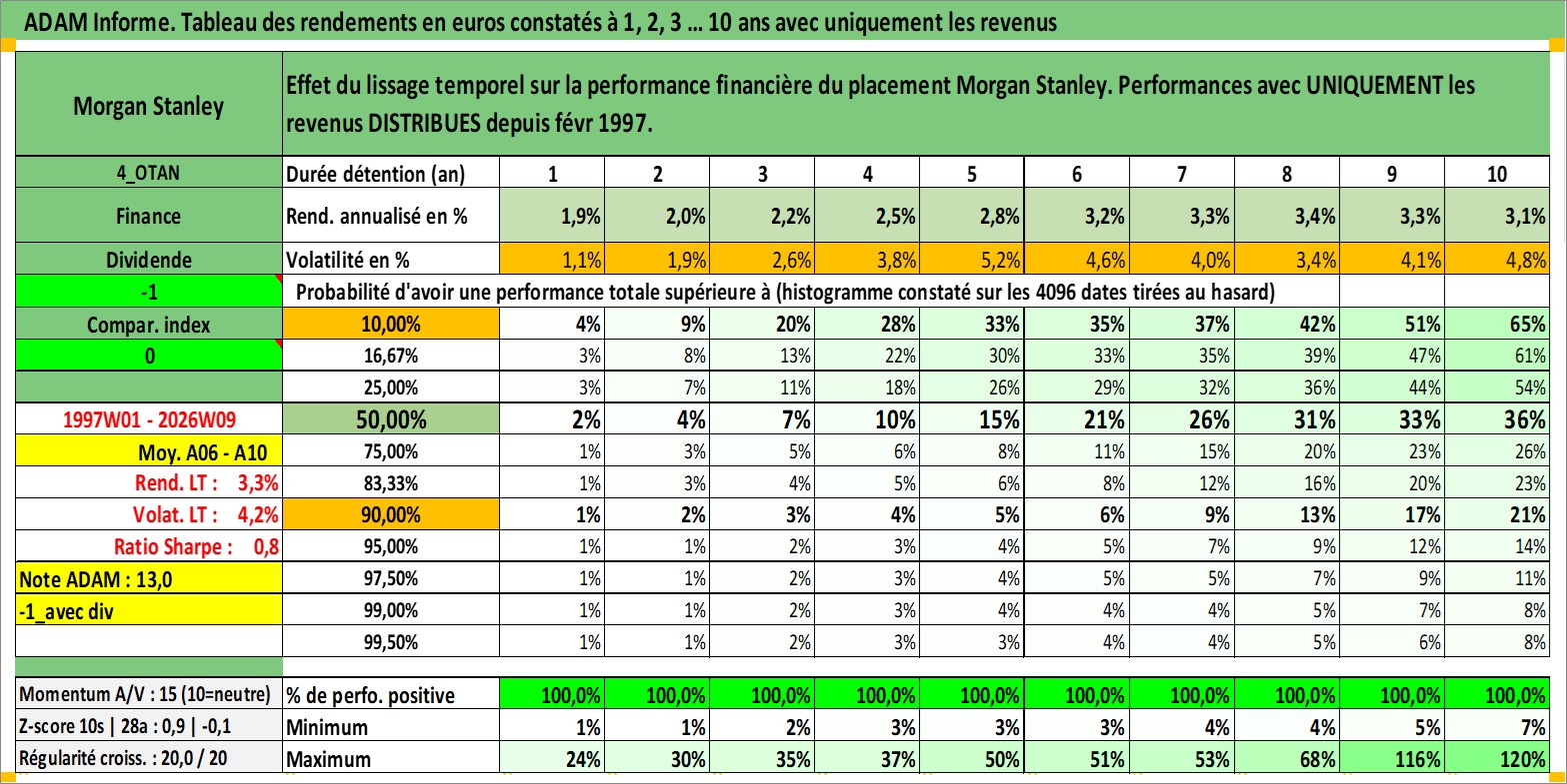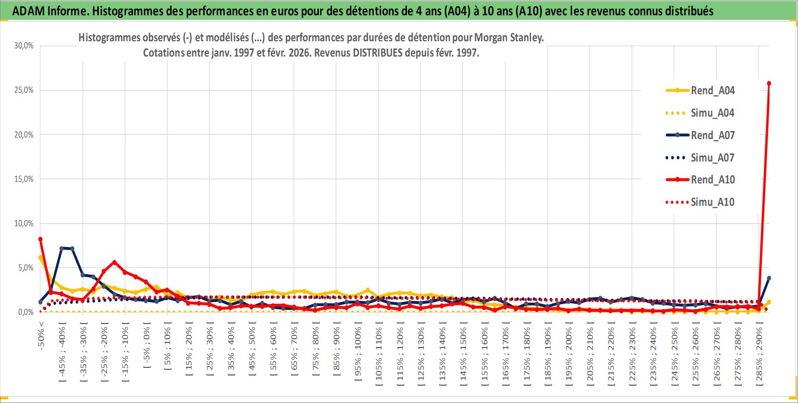 Site dédié aux investisseursPage dédiée sur site financeAnalyse des valorisations hebdomadaires de l'action Morgan Stanley. Cet actif est cote en USD. Les valorisations sont en contrevaleur EURO et couvrent les semaines 1997W01 a 2026W09. Les revenus de cet actif financier sont pris en compte depuis la semaine 1997W09. La note globale ESG de cet actif est estimee a 9.0 (apres rebasage entre 0 et 20).