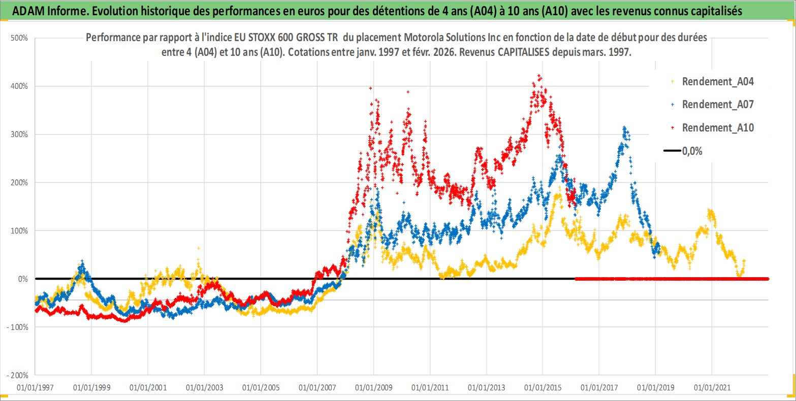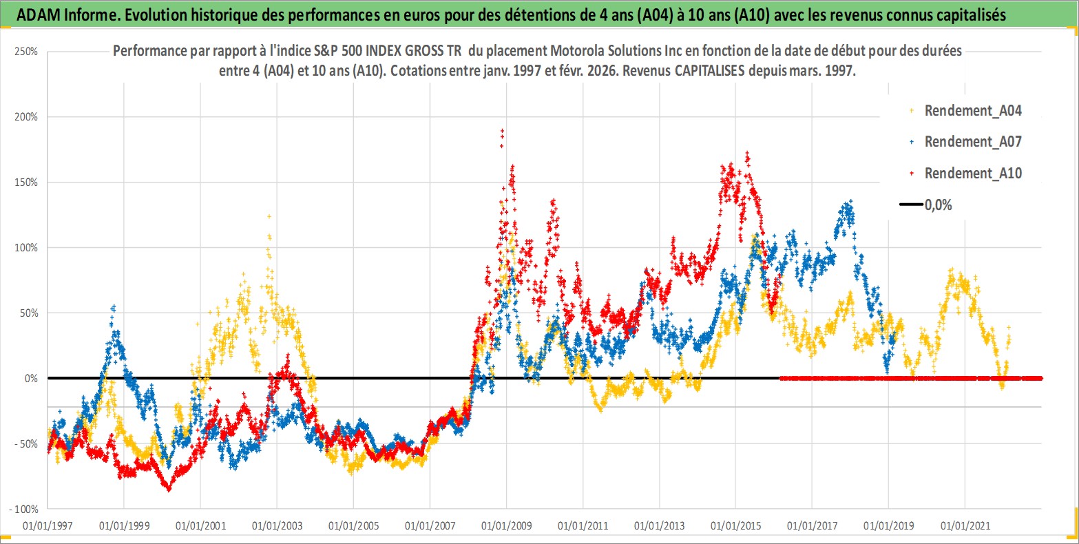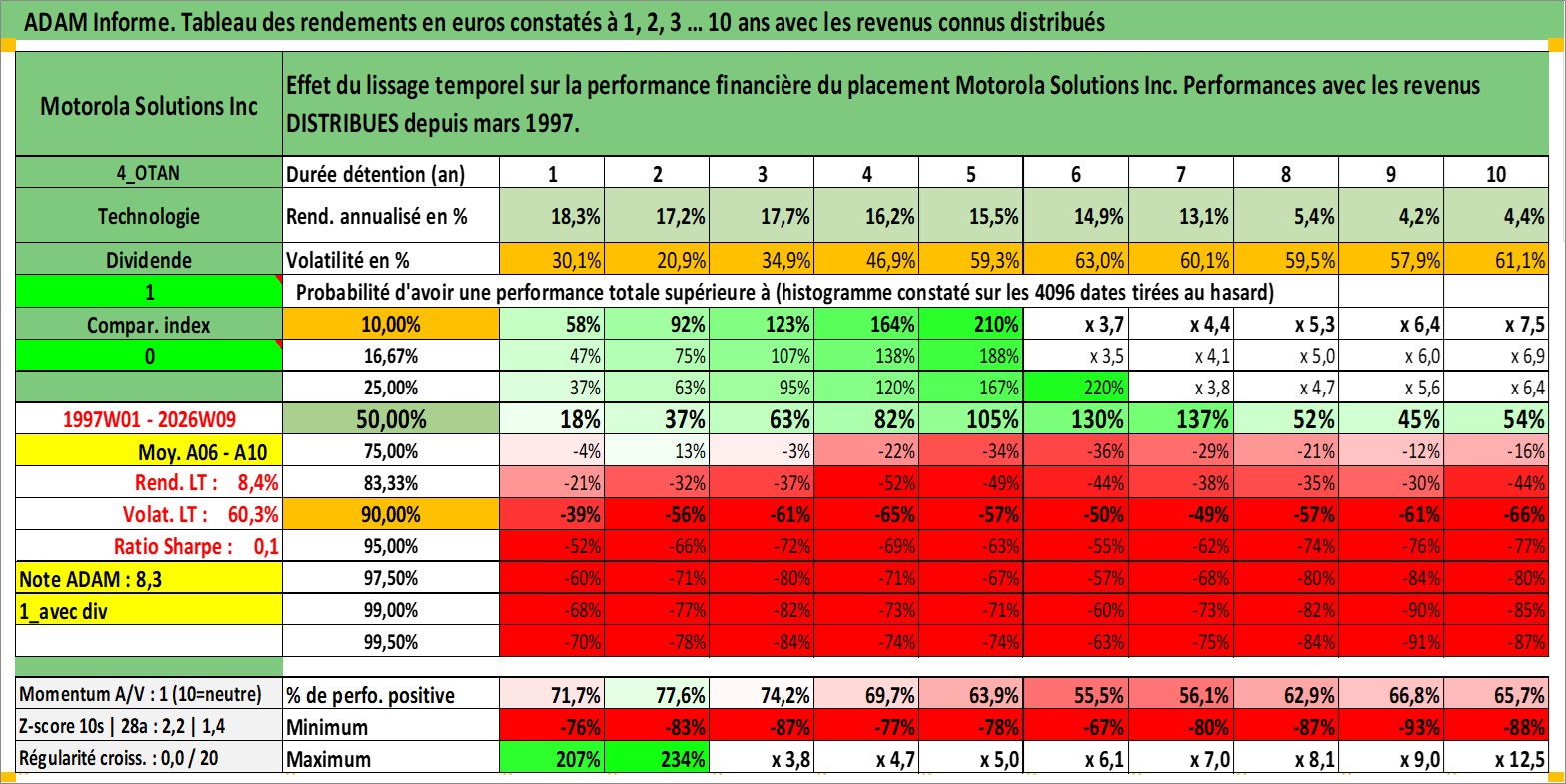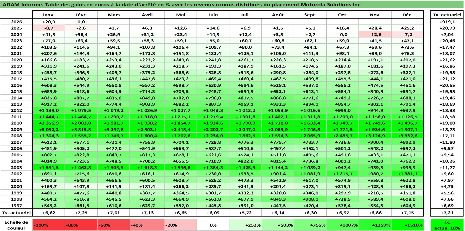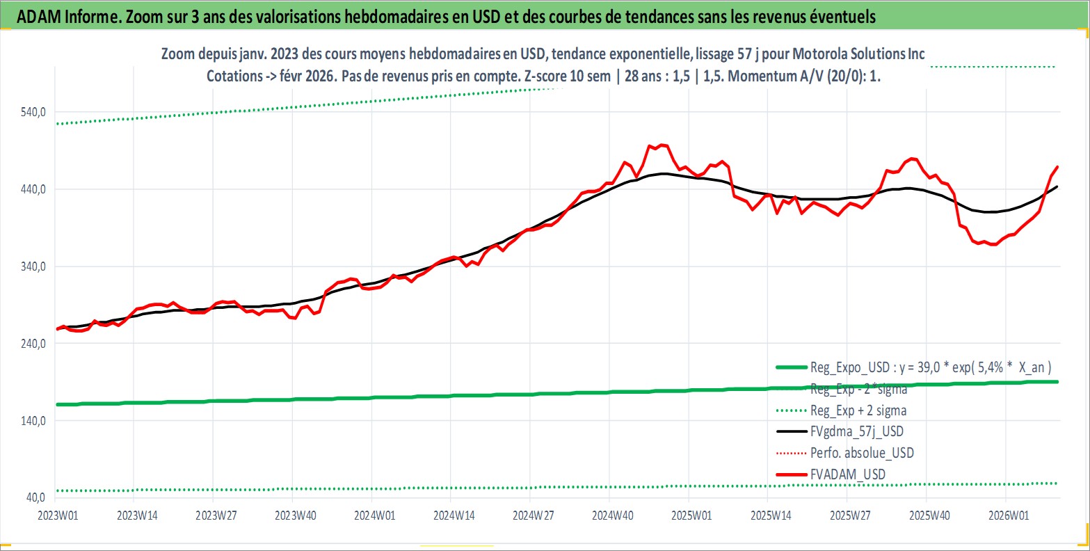 Site dédié aux investisseursPage dédiée sur site financeAnalyse des valorisations hebdomadaires de l'action Motorola Solutions Inc. Cet actif est cote en USD. Les valorisations sont en contrevaleur EURO et couvrent les semaines 1997W01 a 2026W09. Les revenus de cet actif financier sont pris en compte depuis la semaine 1997W11. La note globale ESG de cet actif est estimee a 14.0 (apres rebasage entre 0 et 20).