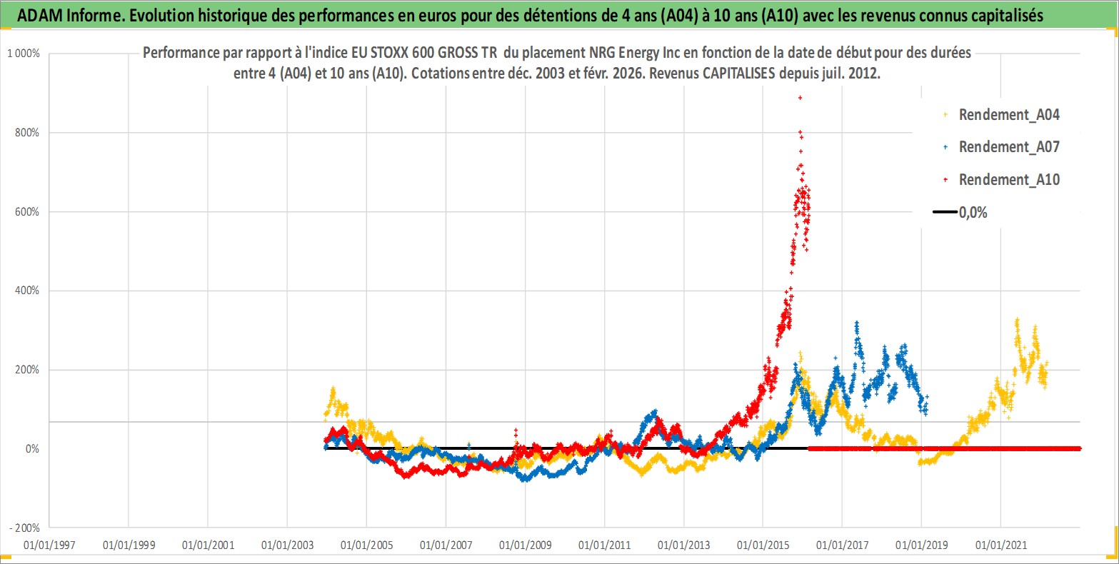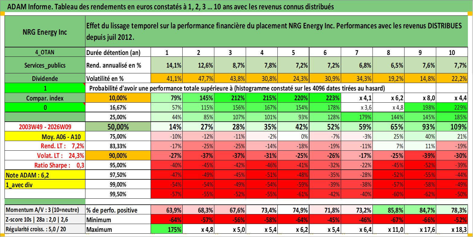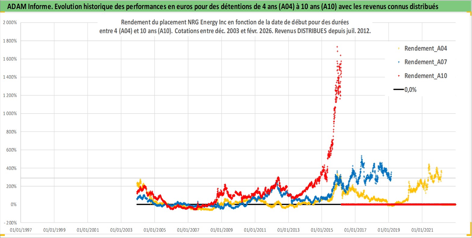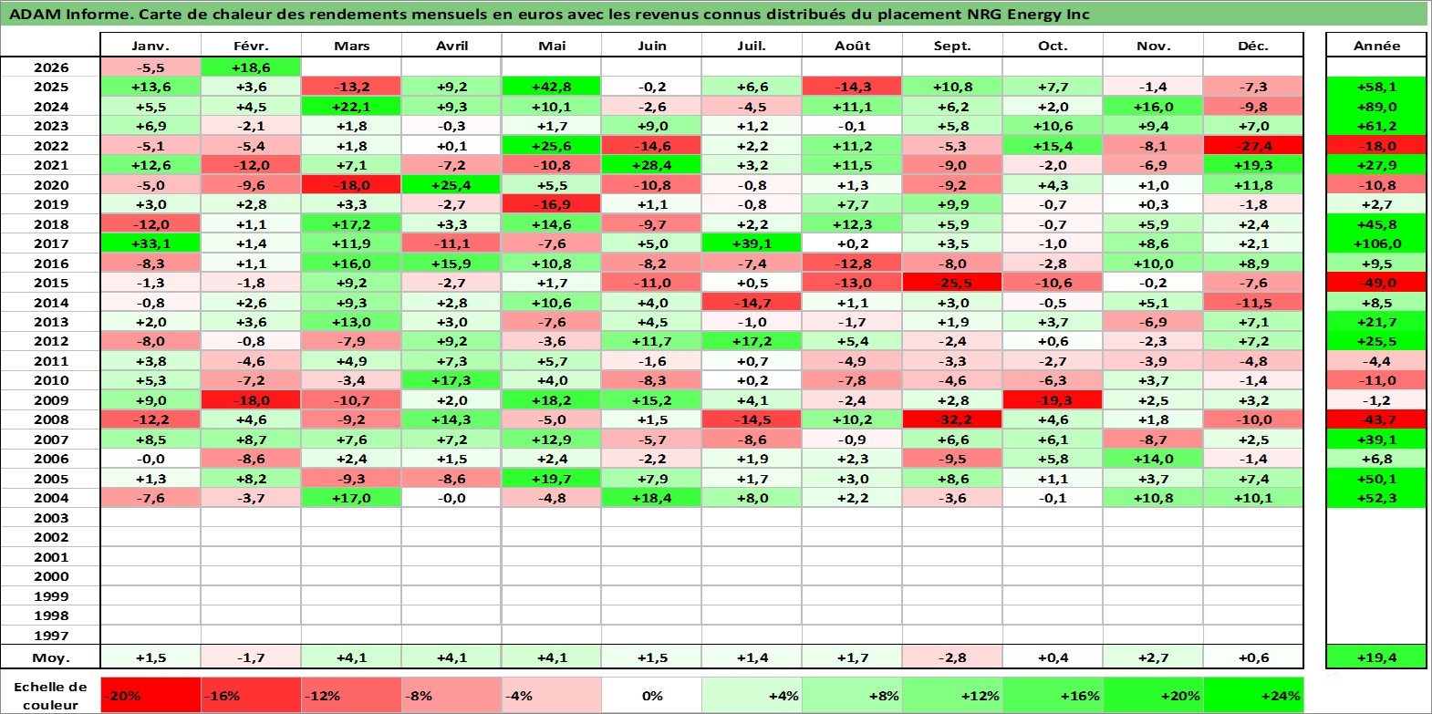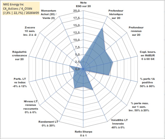 Site dédié aux investisseursPage dédiée sur site financeAnalyse des valorisations hebdomadaires de l'action NRG Energy Inc. Cet actif est cote en USD. Les valorisations sont en contrevaleur EURO et couvrent les semaines 2003W49 a 2026W09. Les revenus de cet actif financier sont pris en compte depuis la semaine 2012W31. La note globale ESG de cet actif est estimee a 4.0 (apres rebasage entre 0 et 20).