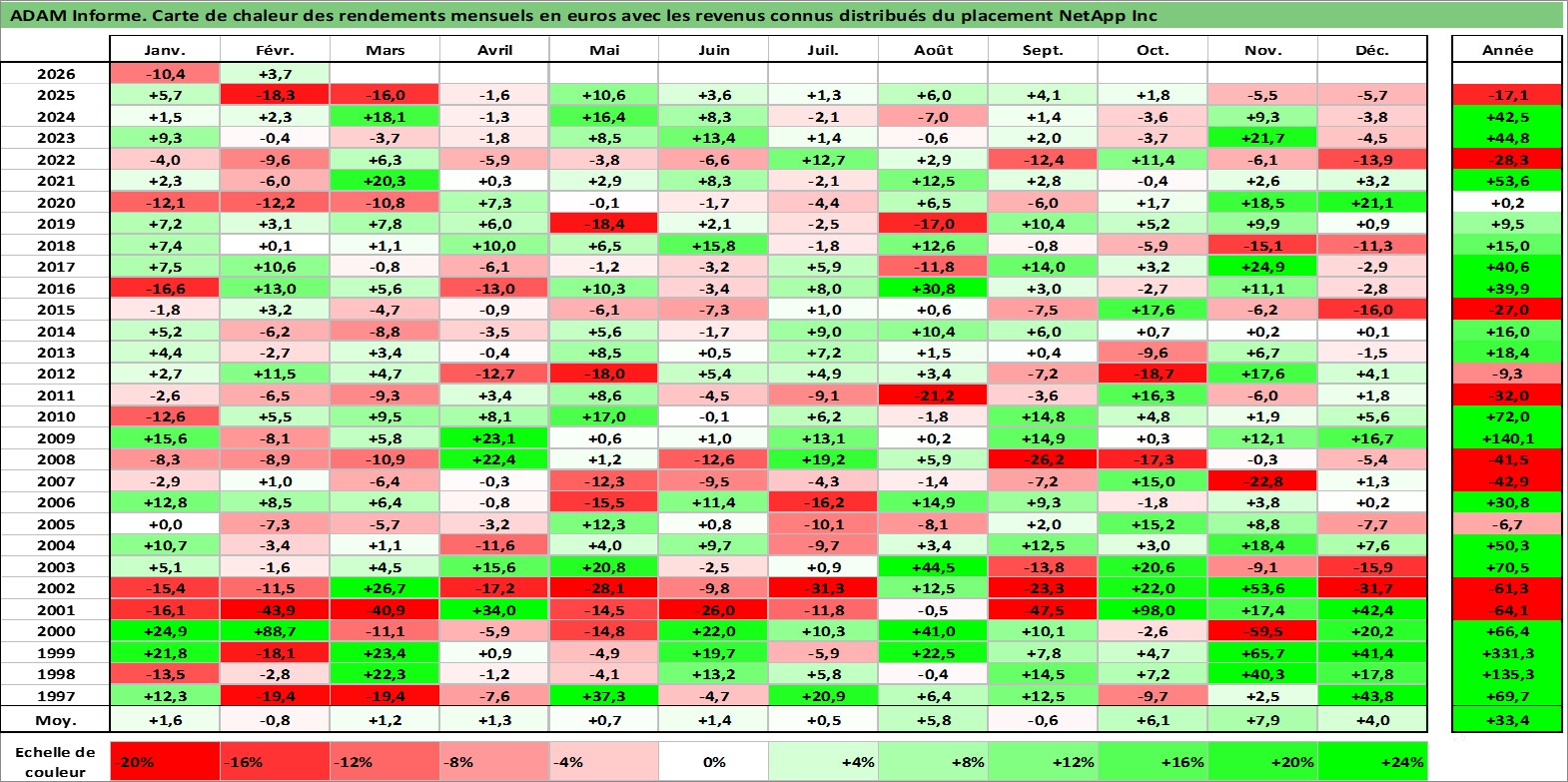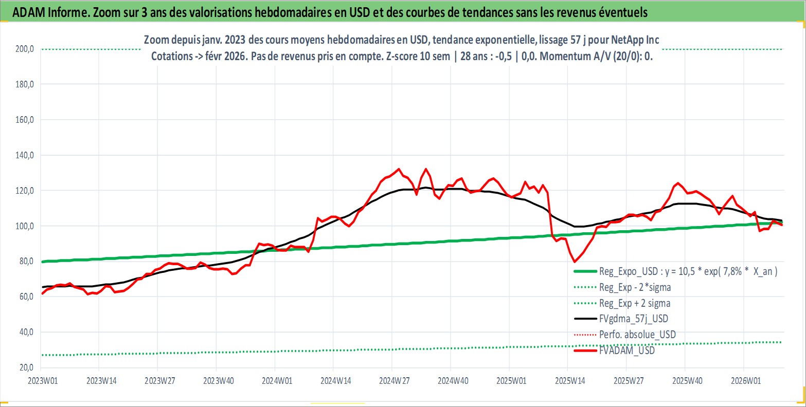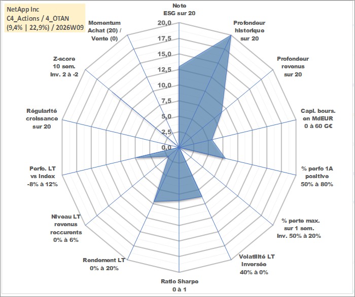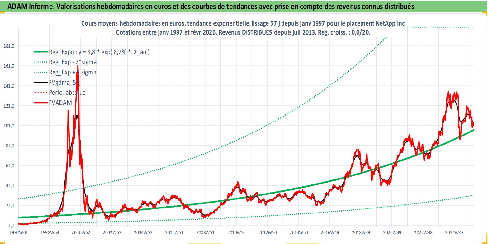 Site dédié aux investisseursPage dédiée sur site financeAnalyse des valorisations hebdomadaires de l'action NetApp Inc. Cet actif est cote en USD. Les valorisations sont en contrevaleur EURO et couvrent les semaines 1997W01 a 2026W09. Les revenus de cet actif financier sont pris en compte depuis la semaine 2013W28. La note globale ESG de cet actif est estimee a 13.0 (apres rebasage entre 0 et 20).
