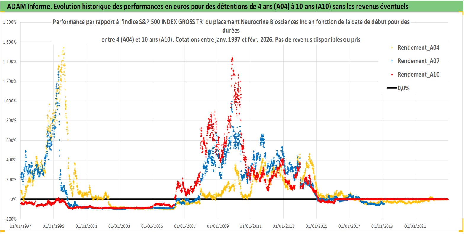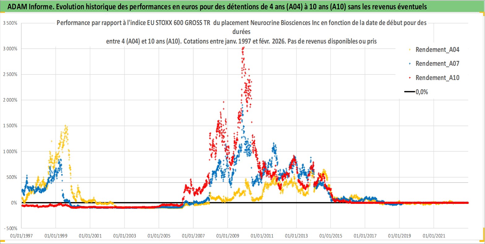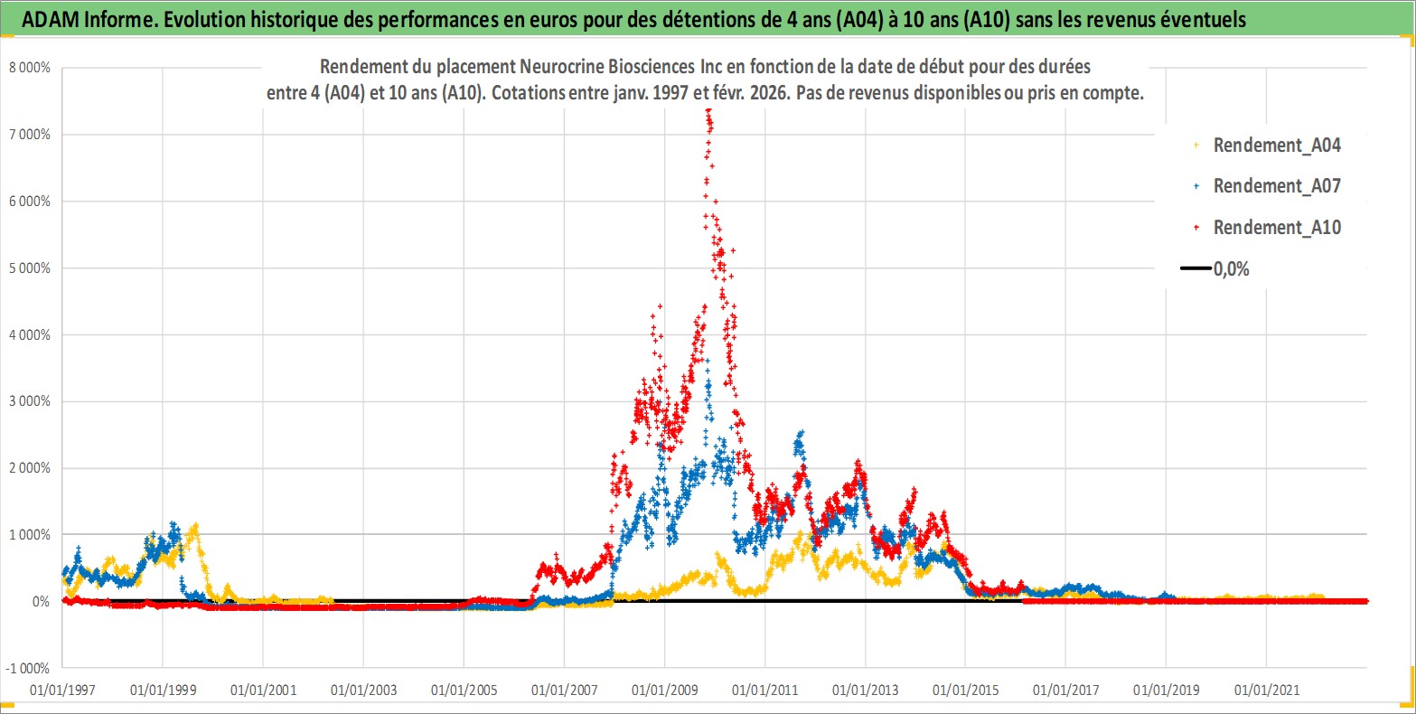 Site dédié aux investisseursPage dédiée sur site financeAnalyse des valorisations hebdomadaires de l'action Neurocrine Biosciences Inc. Cet actif est cote en USD. Les valorisations sont en contrevaleur EURO et couvrent les semaines 1997W01 a 2026W09. Les revenus de cet actif financier ne sont pas connus car non existants ou non disponibles sur le site Yahoo Finance. La note ESG de cet actif n'est pas connue.