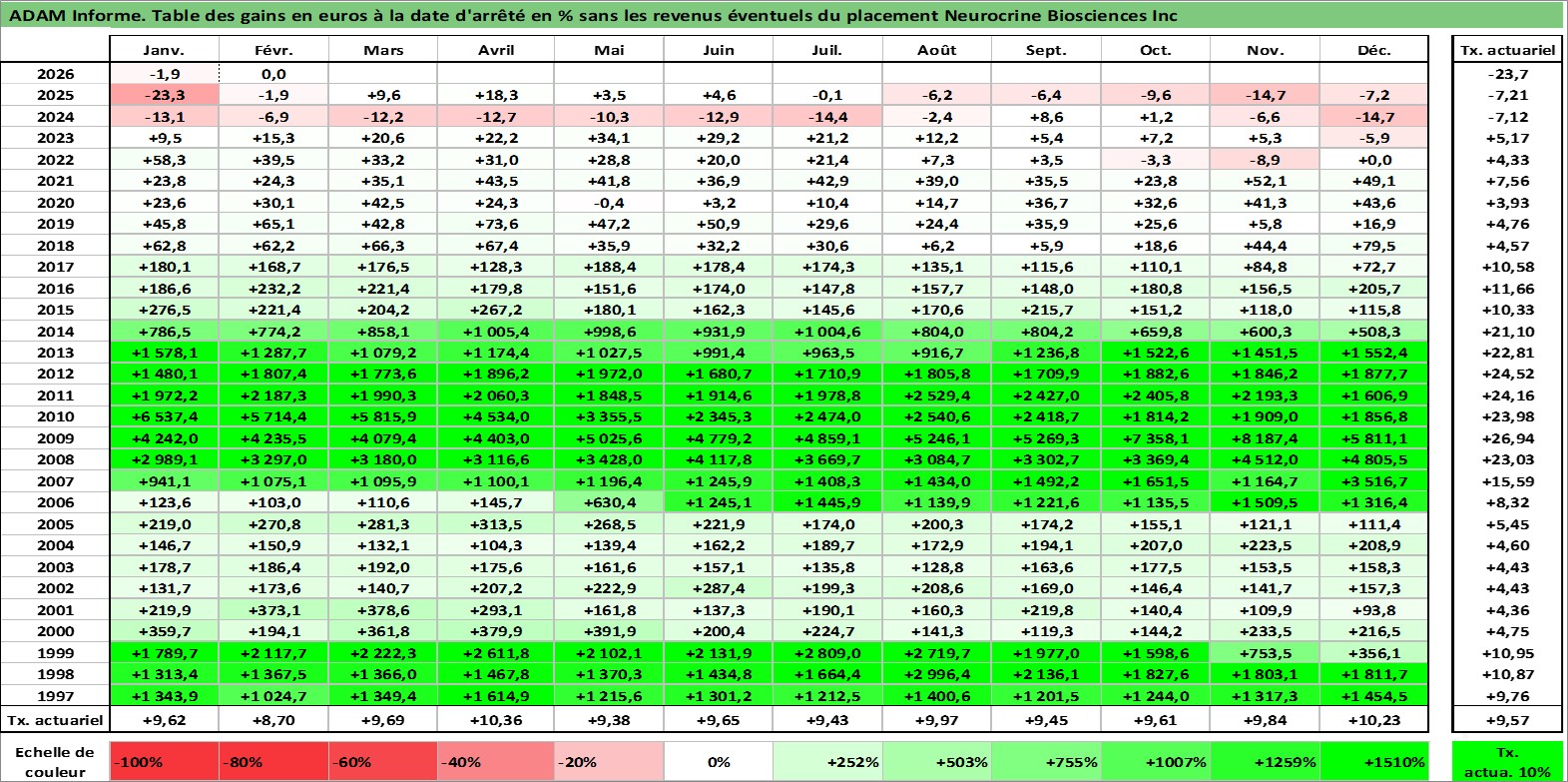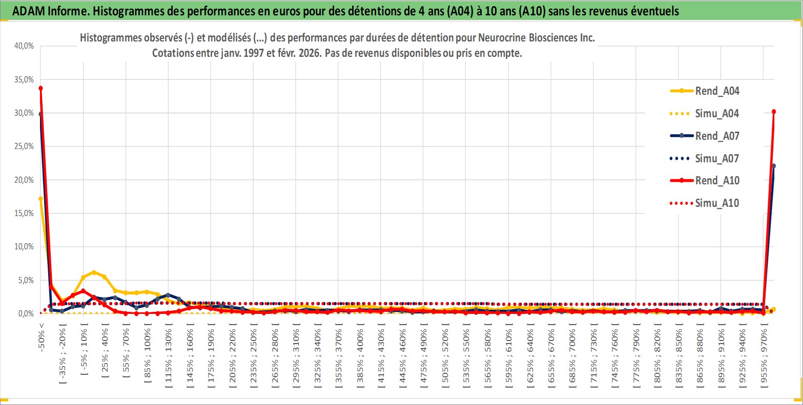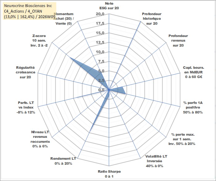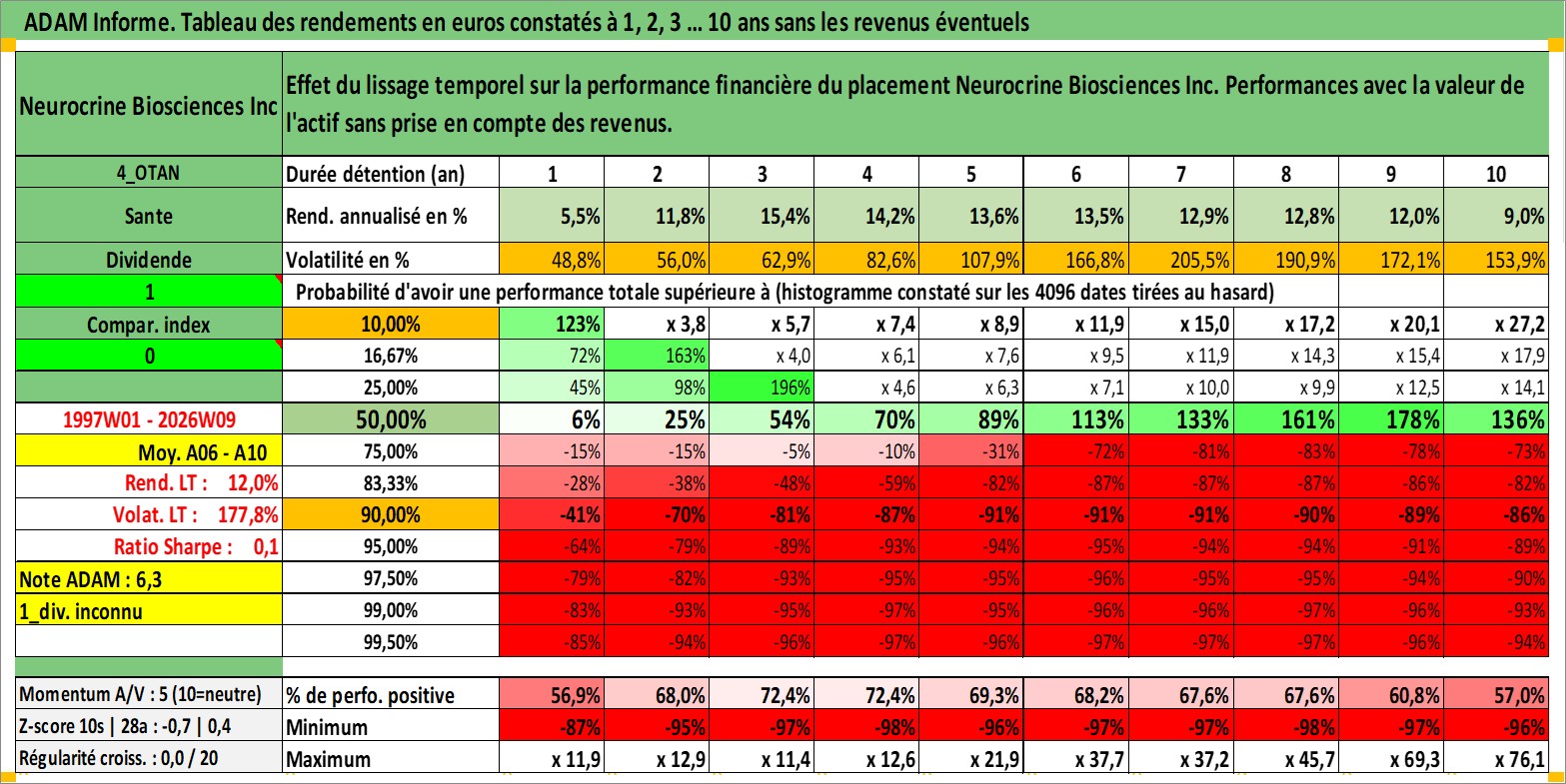 Site dédié aux investisseursPage dédiée sur site financeAnalyse des valorisations hebdomadaires de l'action Neurocrine Biosciences Inc. Cet actif est cote en USD. Les valorisations sont en contrevaleur EURO et couvrent les semaines 1997W01 a 2026W09. Les revenus de cet actif financier ne sont pas connus car non existants ou non disponibles sur le site Yahoo Finance. La note ESG de cet actif n'est pas connue.