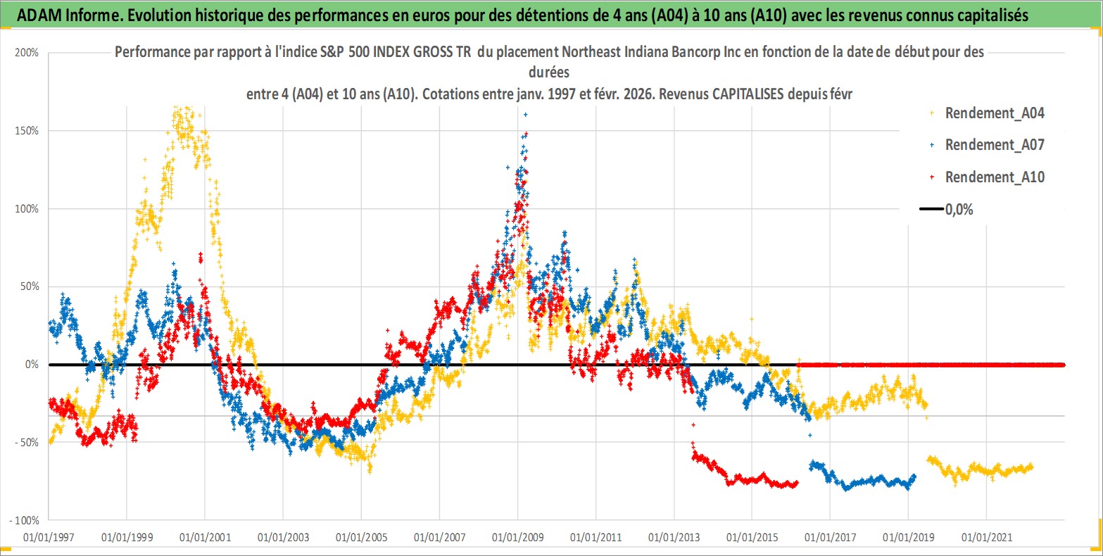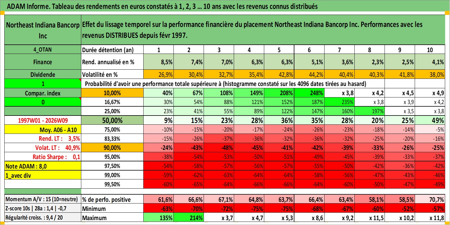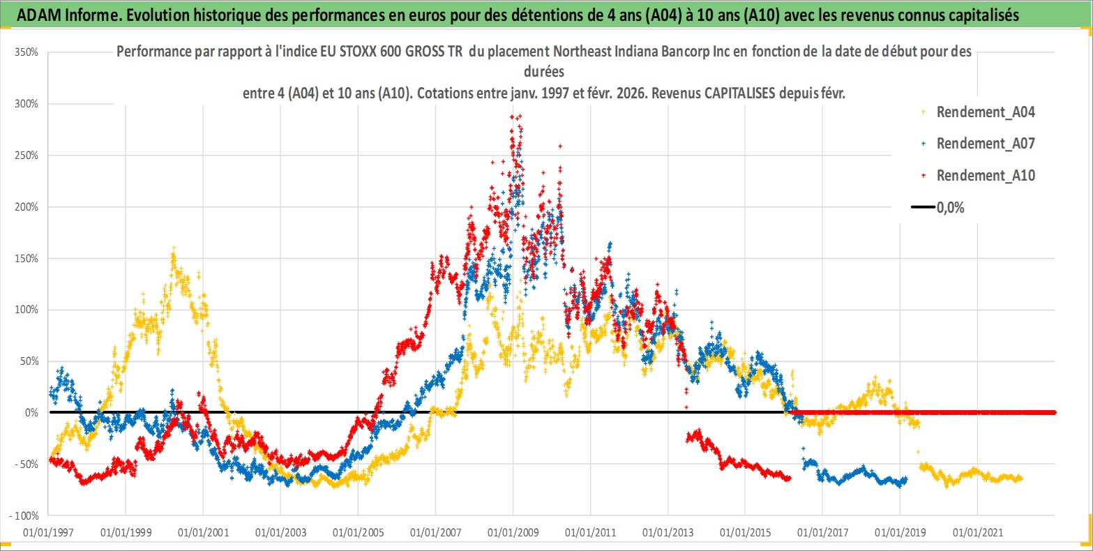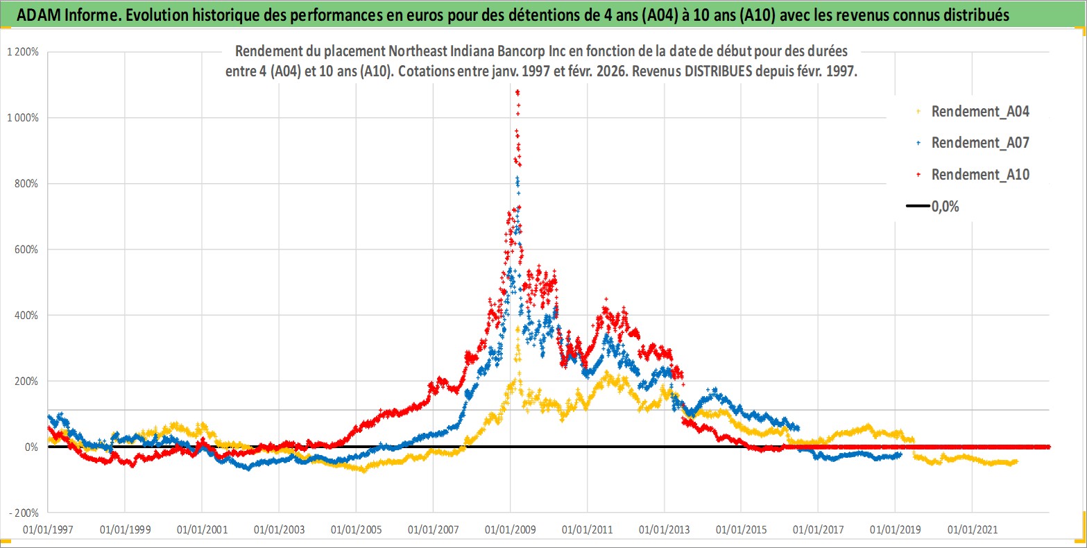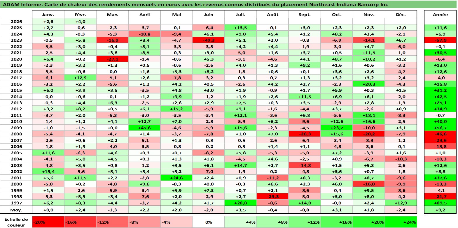 Site dédié aux investisseursPage dédiée sur site financeAnalyse des valorisations hebdomadaires de l'action Northeast Indiana Bancorp Inc. Cet actif est cote en USD. Les valorisations sont en contrevaleur EURO et couvrent les semaines 1997W01 a 2026W09. Les revenus de cet actif financier sont pris en compte depuis la semaine 1997W06. La note ESG de cet actif n'est pas connue.