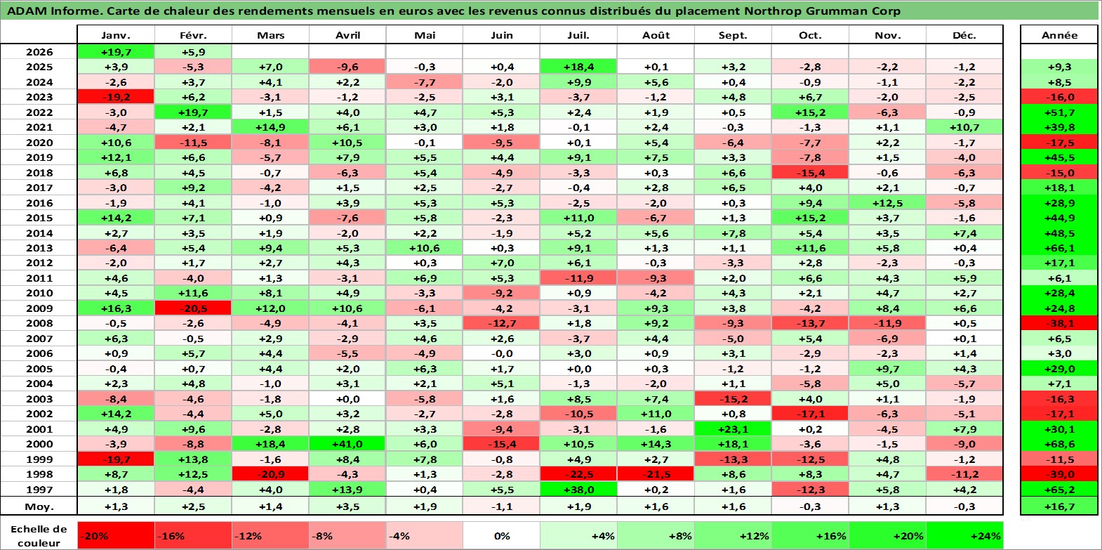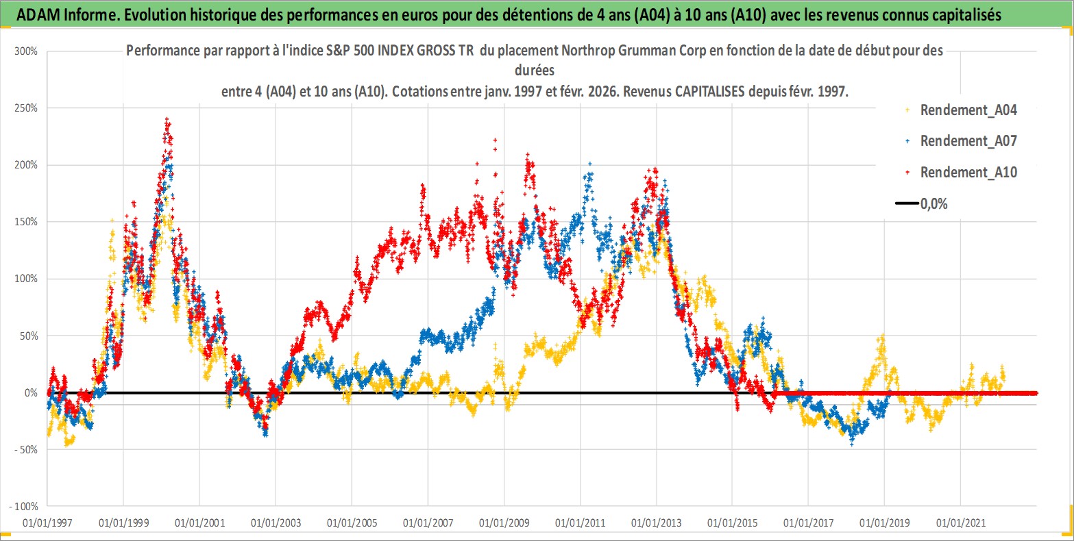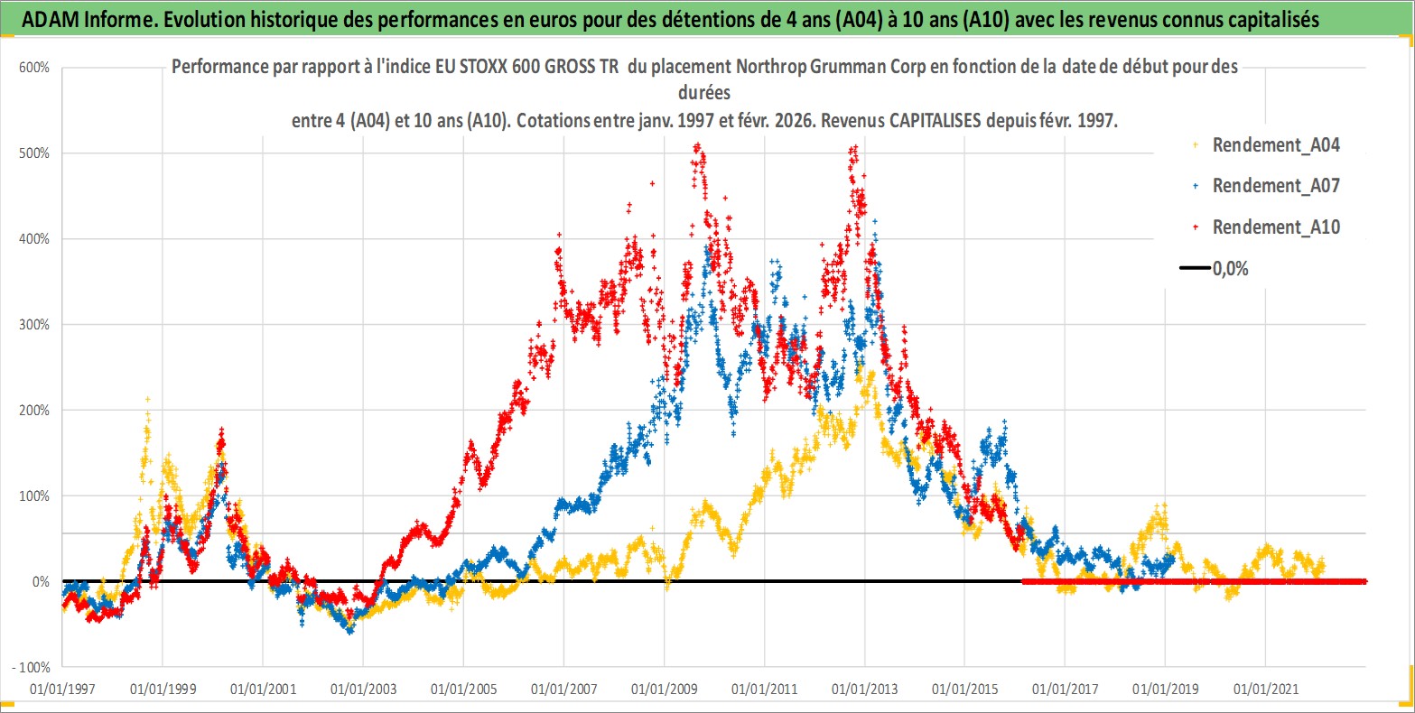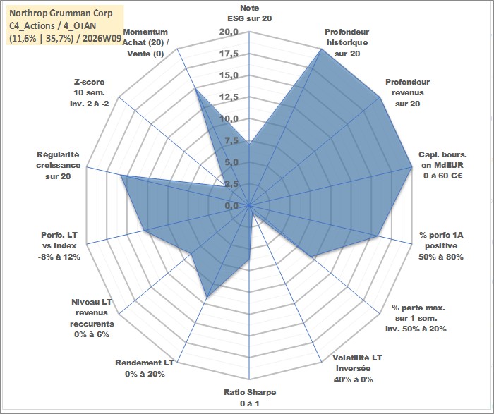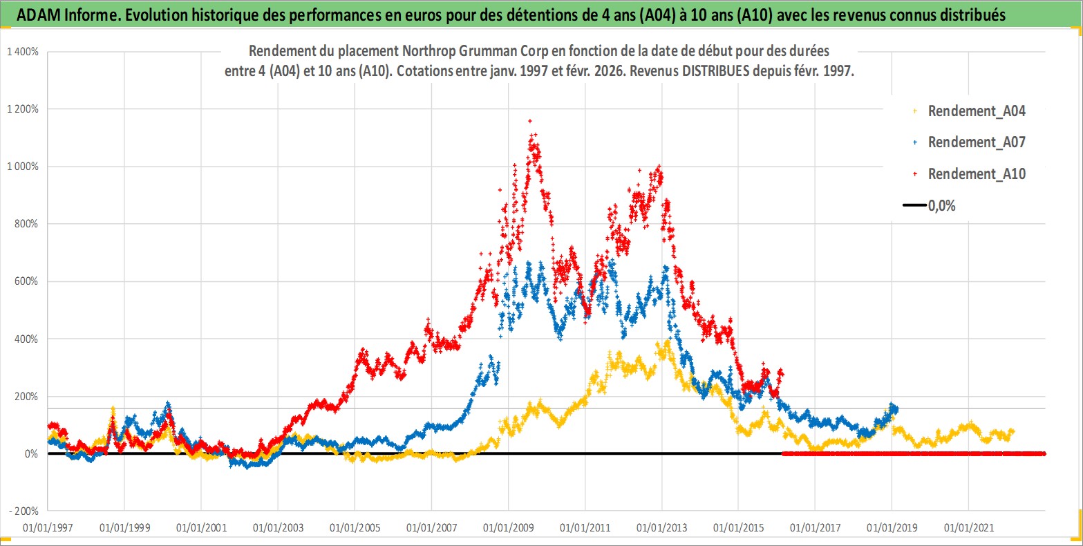 Site dédié aux investisseursPage dédiée sur site financeAnalyse des valorisations hebdomadaires de l'action Northrop Grumman Corp. Cet actif est cote en USD. Les valorisations sont en contrevaleur EURO et couvrent les semaines 1997W01 a 2026W09. Les revenus de cet actif financier sont pris en compte depuis la semaine 1997W09. La note globale ESG de cet actif est estimee a 7.0 (apres rebasage entre 0 et 20).