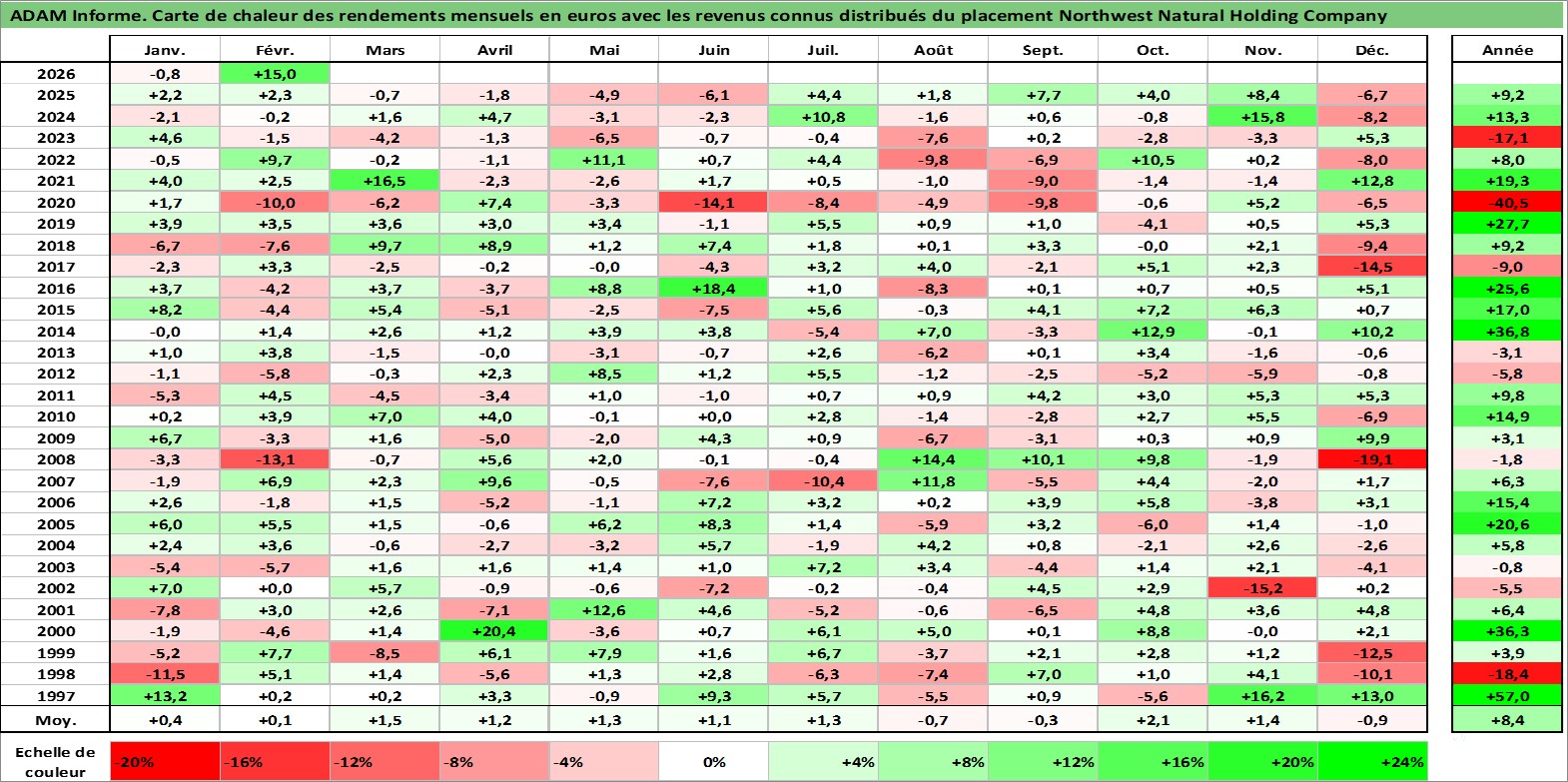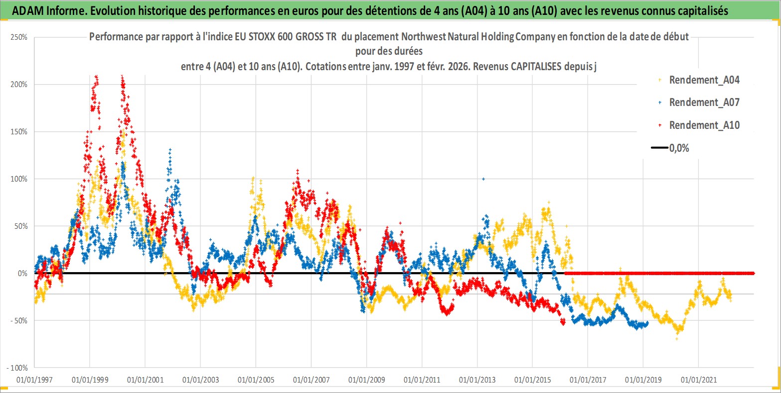 Site dédié aux investisseursPage dédiée sur site financeAnalyse des valorisations hebdomadaires de l'action Northwest Natural Holding Company. Cet actif est cote en USD. Les valorisations sont en contrevaleur EURO et couvrent les semaines 1997W01 a 2026W09. Les revenus de cet actif financier sont pris en compte depuis la semaine 1997W05. La note ESG de cet actif n'est pas connue.