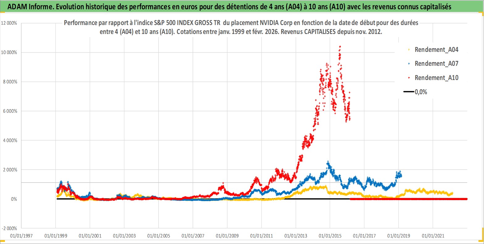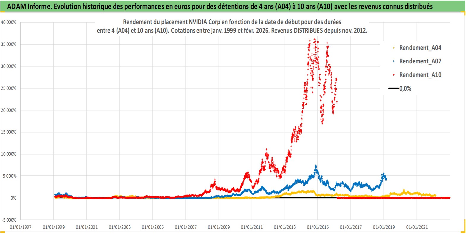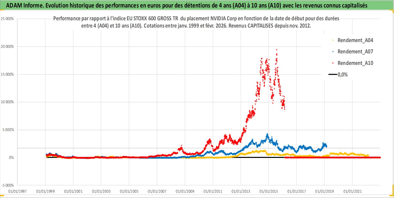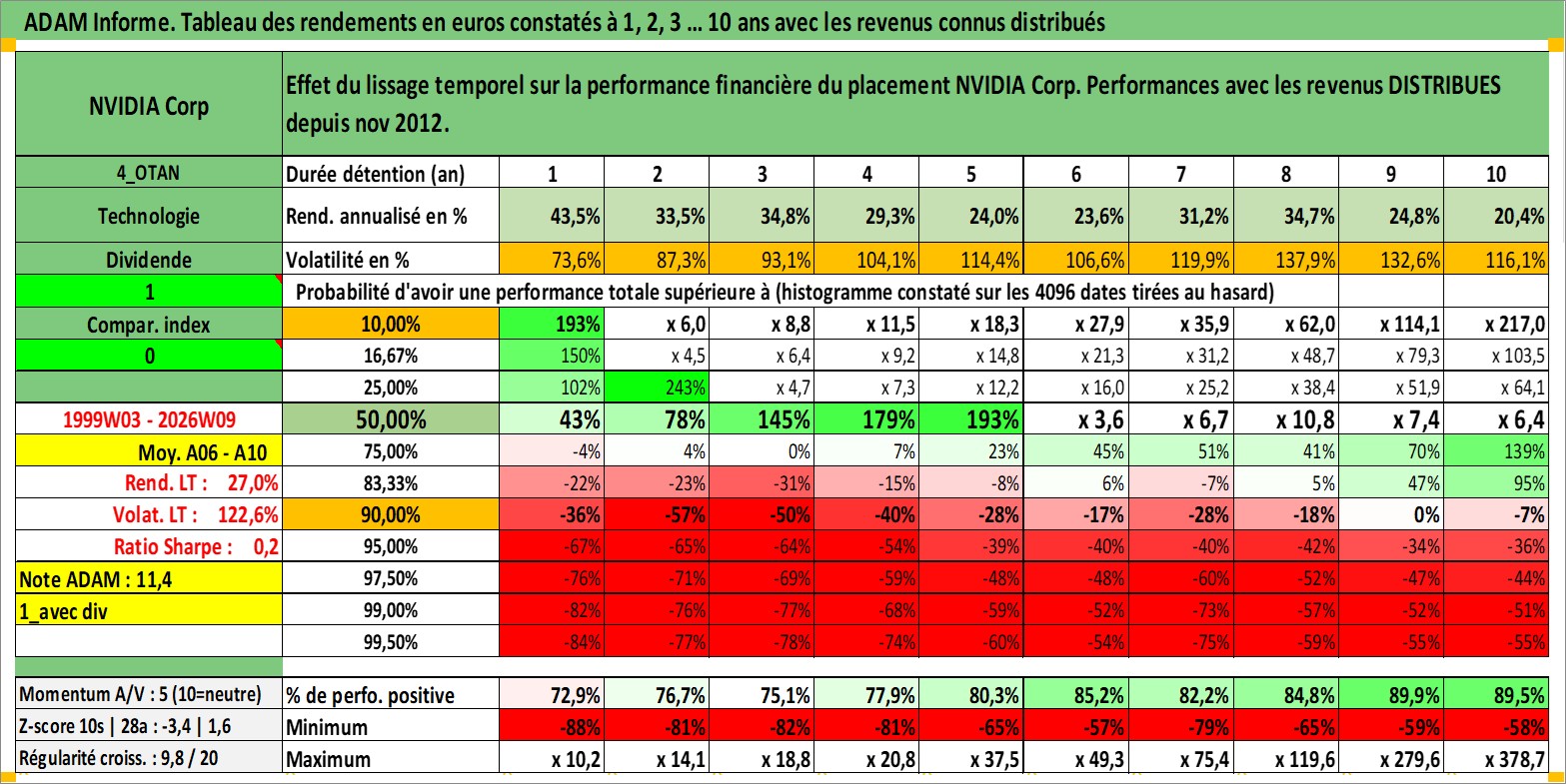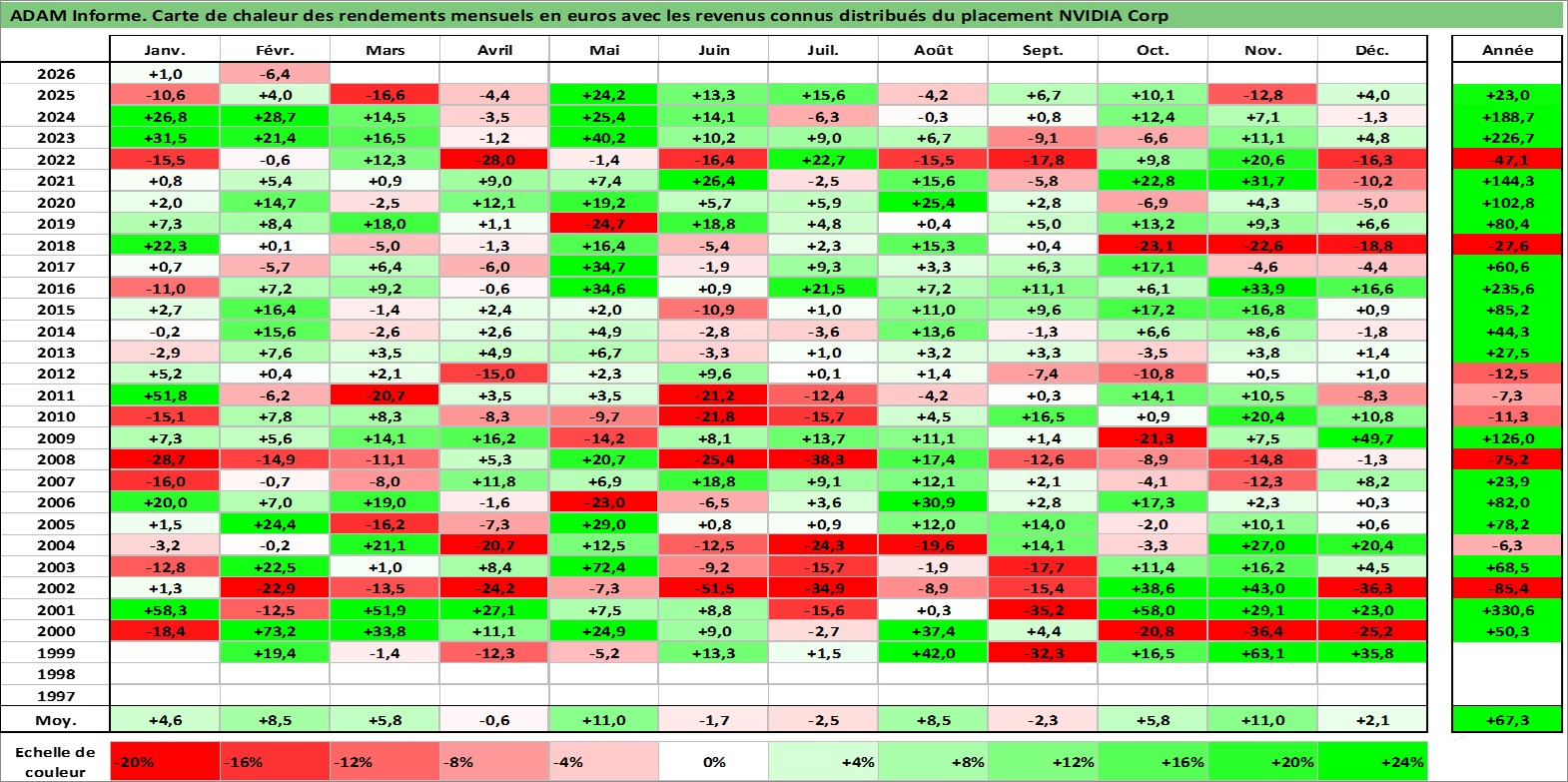 Site dédié aux investisseursPage dédiée sur site financeAnalyse des valorisations hebdomadaires de l'action NVIDIA Corp. Cet actif est cote en USD. Les valorisations sont en contrevaleur EURO et couvrent les semaines 1999W03 a 2026W09. Les revenus de cet actif financier sont pris en compte depuis la semaine 2012W47. La note globale ESG de cet actif est estimee a 15.0 (apres rebasage entre 0 et 20).