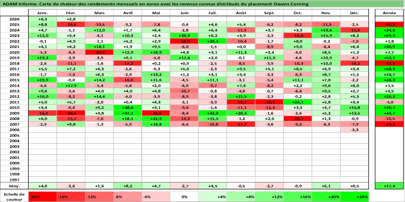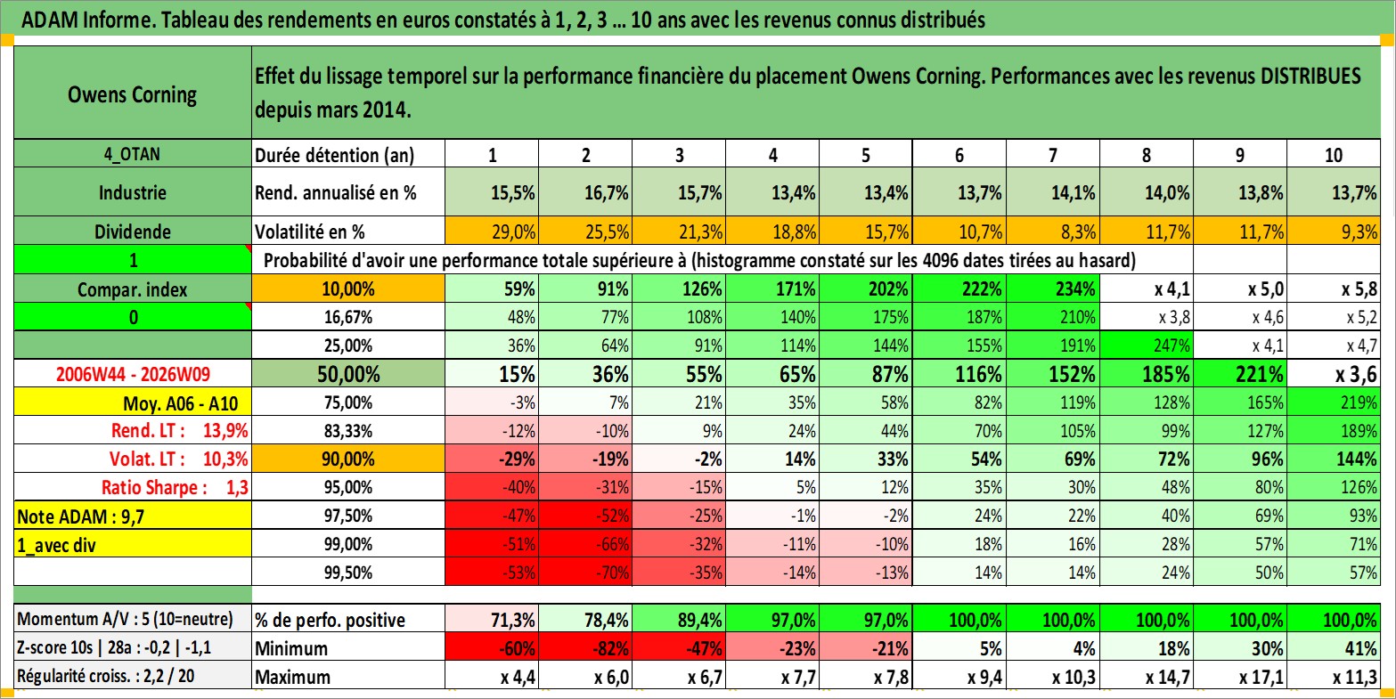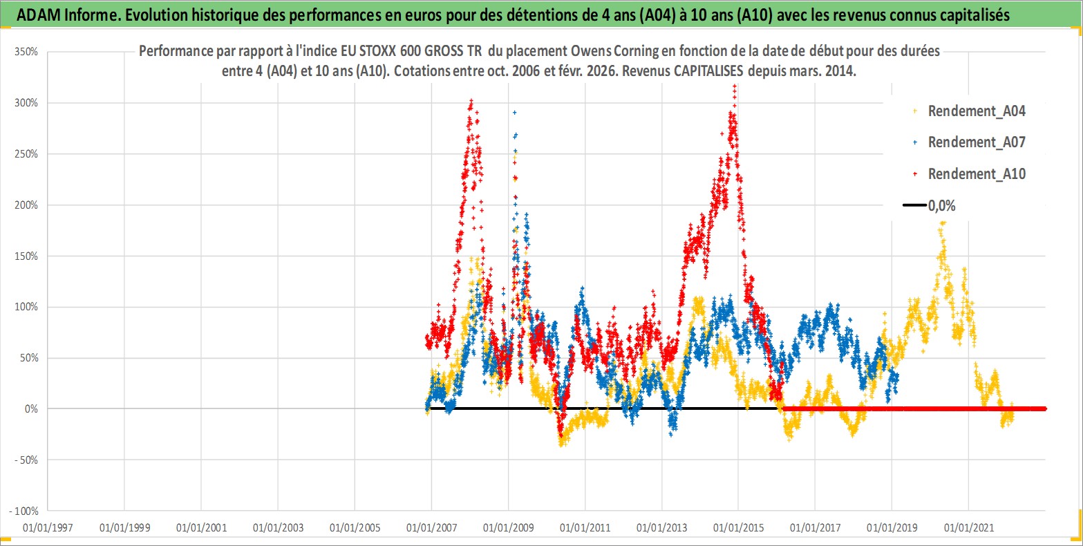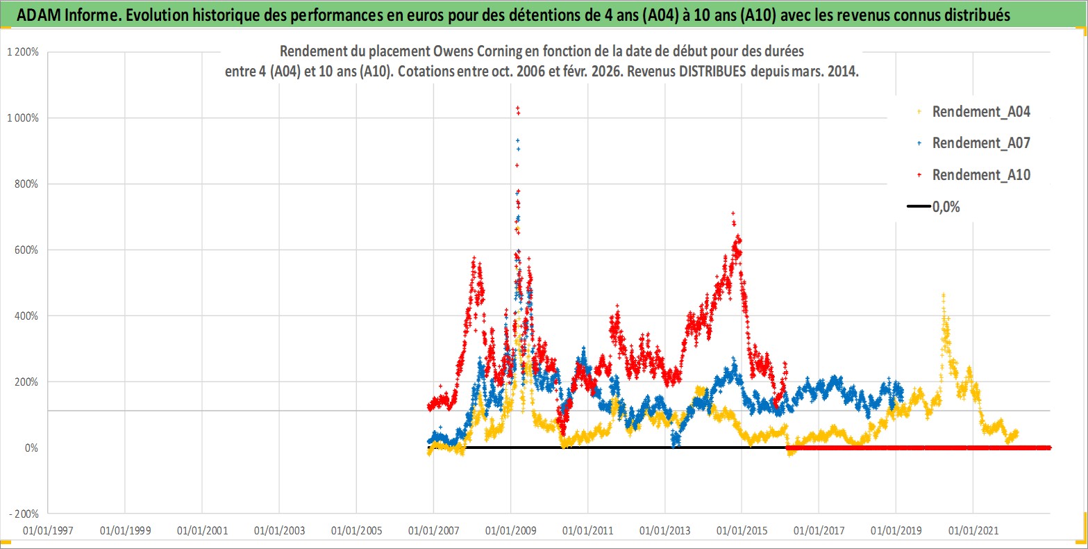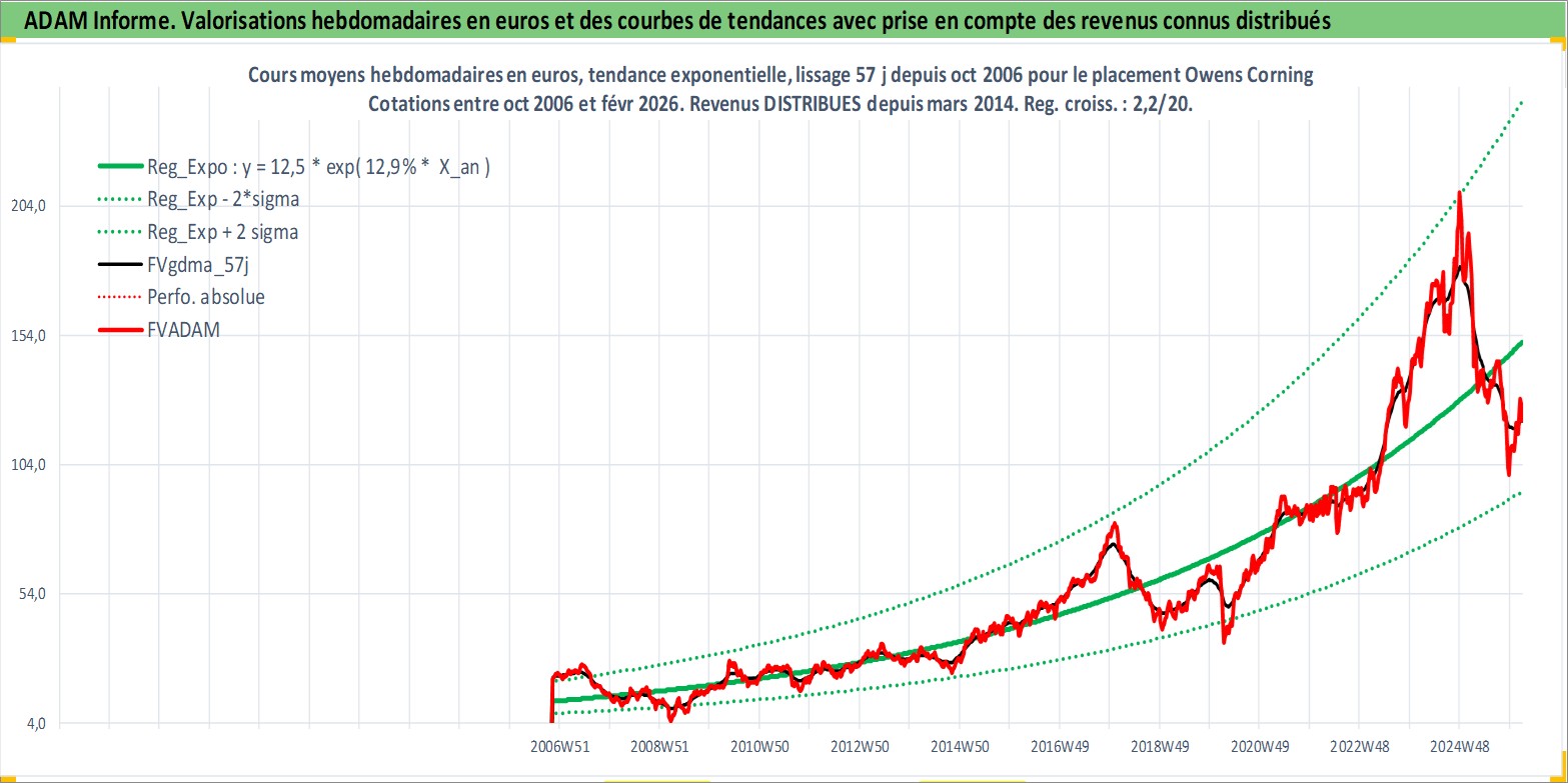 Site dédié aux investisseursPage dédiée sur site financeAnalyse des valorisations hebdomadaires de l'action Owens Corning. Cet actif est cote en USD. Les valorisations sont en contrevaleur EURO et couvrent les semaines 2006W44 a 2026W09. Les revenus de cet actif financier sont pris en compte depuis la semaine 2014W11. La note globale ESG de cet actif est estimee a 13.0 (apres rebasage entre 0 et 20).