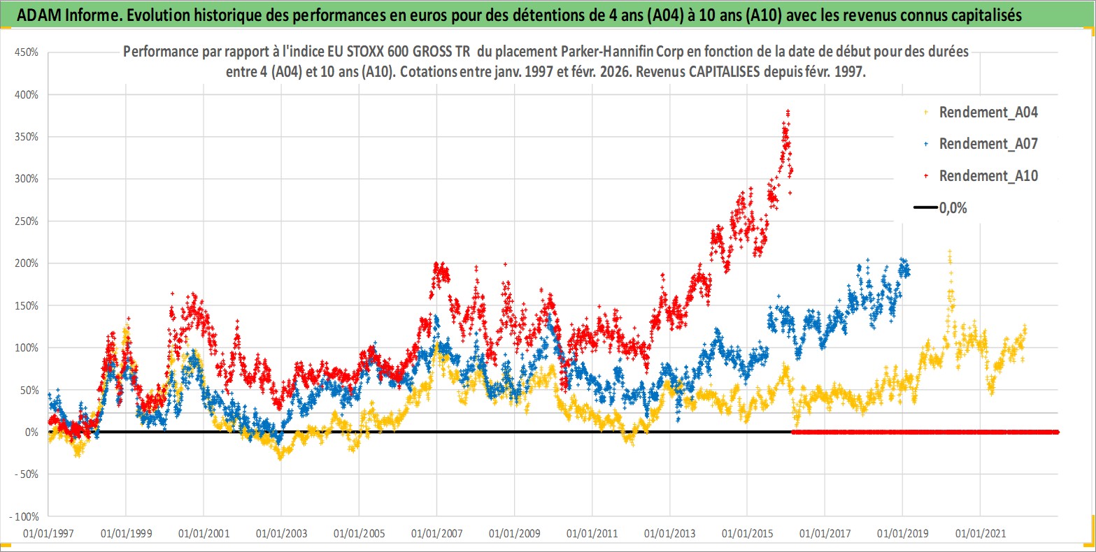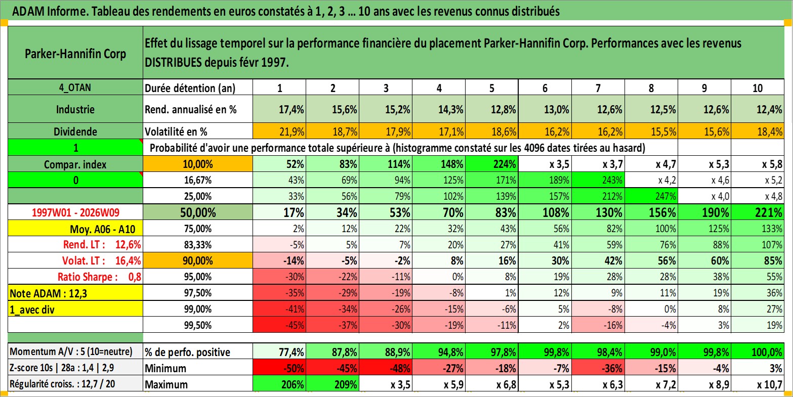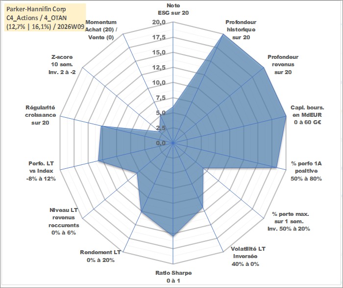 Site dédié aux investisseursPage dédiée sur site financeAnalyse des valorisations hebdomadaires de l'action Parker-Hannifin Corp. Cet actif est cote en USD. Les valorisations sont en contrevaleur EURO et couvrent les semaines 1997W01 a 2026W09. Les revenus de cet actif financier sont pris en compte depuis la semaine 1997W08. La note globale ESG de cet actif est estimee a 6.0 (apres rebasage entre 0 et 20).