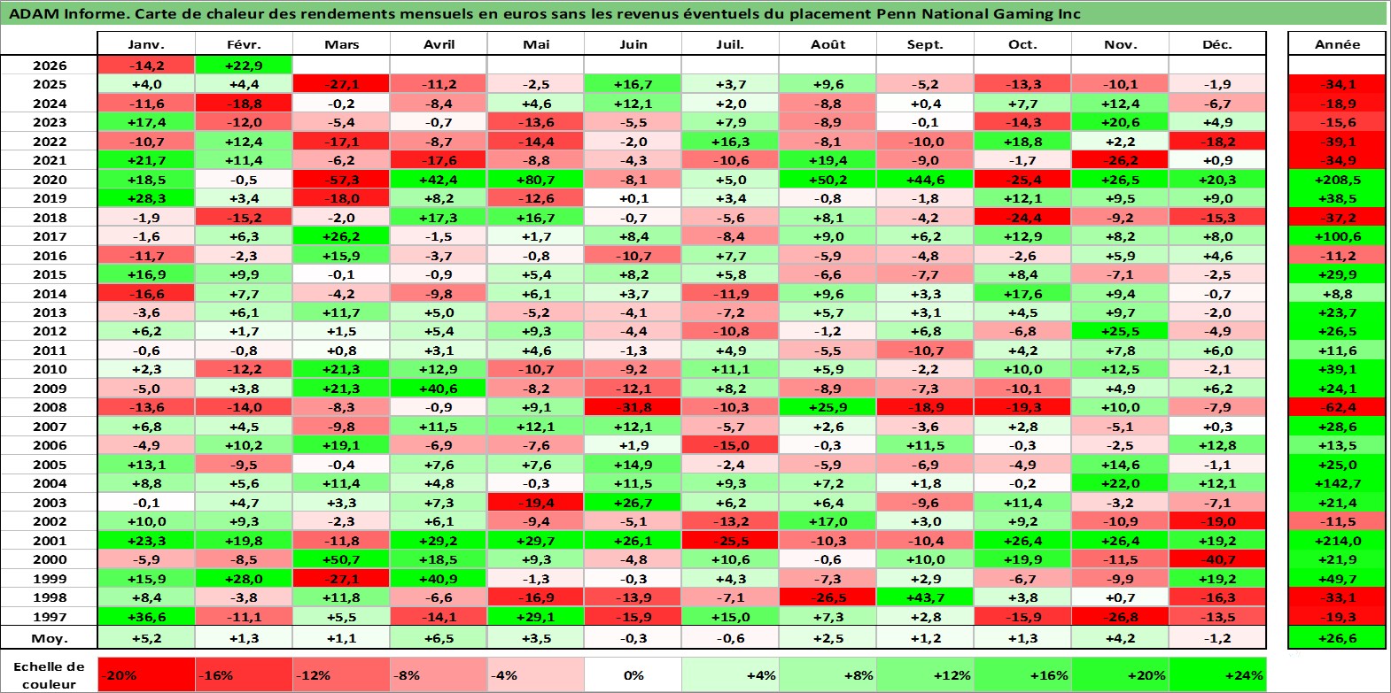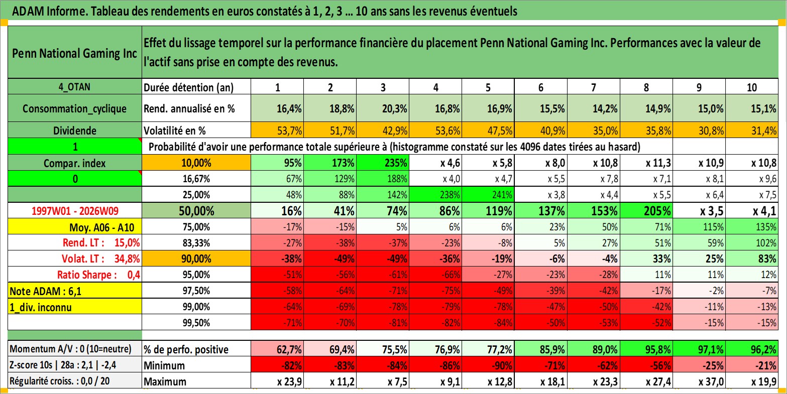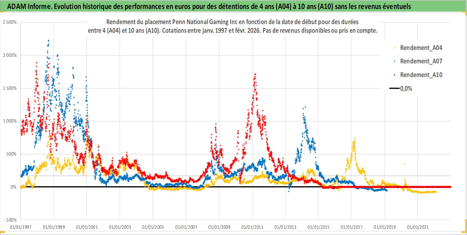 Site dédié aux investisseursPage dédiée sur site financeAnalyse des valorisations hebdomadaires de l'action Penn National Gaming Inc. Cet actif est cote en USD. Les valorisations sont en contrevaleur EURO et couvrent les semaines 1997W01 a 2026W09. Les revenus de cet actif financier ne sont pas connus car non existants ou non disponibles sur le site Yahoo Finance. La note ESG de cet actif n'est pas connue.