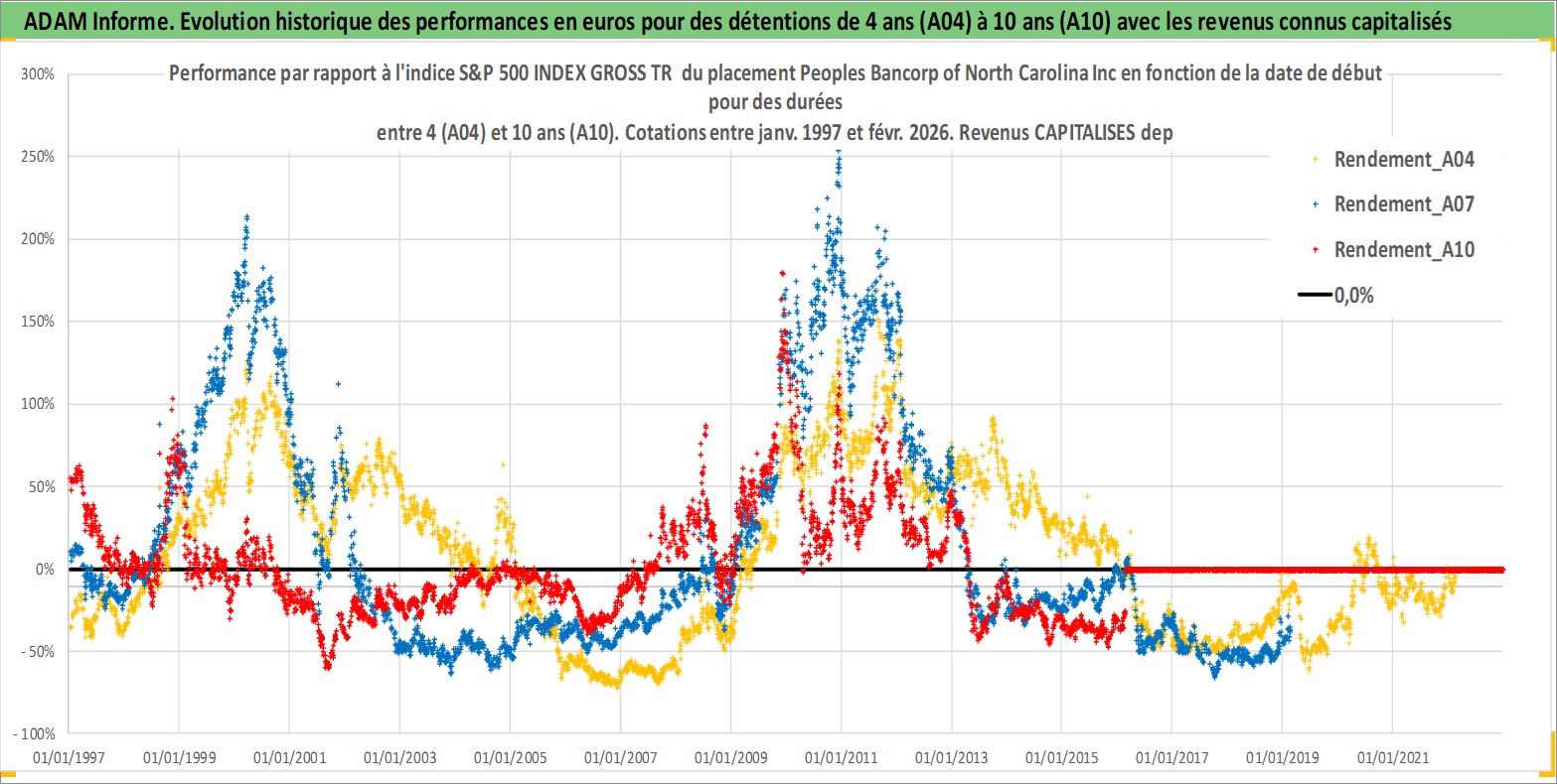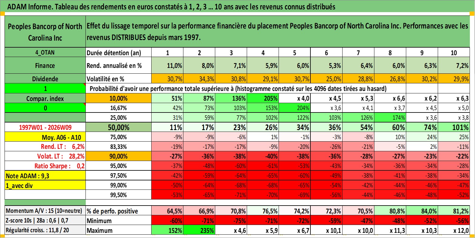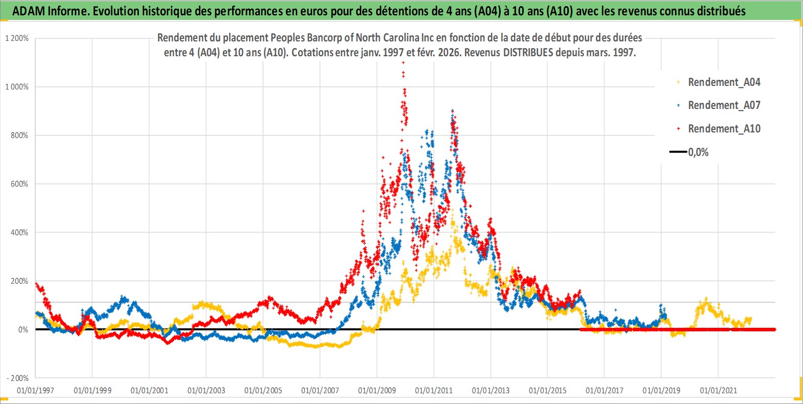 Site dédié aux investisseursPage dédiée sur site financeAnalyse des valorisations hebdomadaires de l'action Peoples Bancorp of North Carolina Inc. Cet actif est cote en USD. Les valorisations sont en contrevaleur EURO et couvrent les semaines 1997W01 a 2026W09. Les revenus de cet actif financier sont pris en compte depuis la semaine 1997W11. La note ESG de cet actif n'est pas connue.