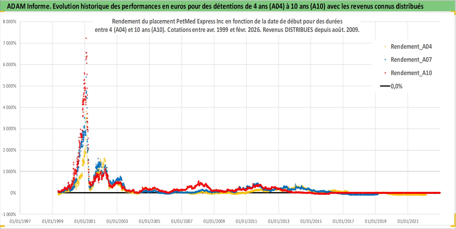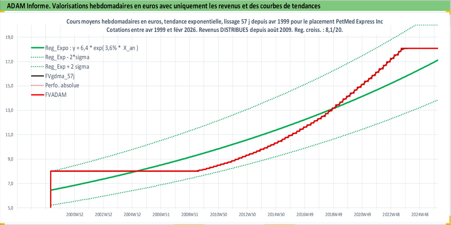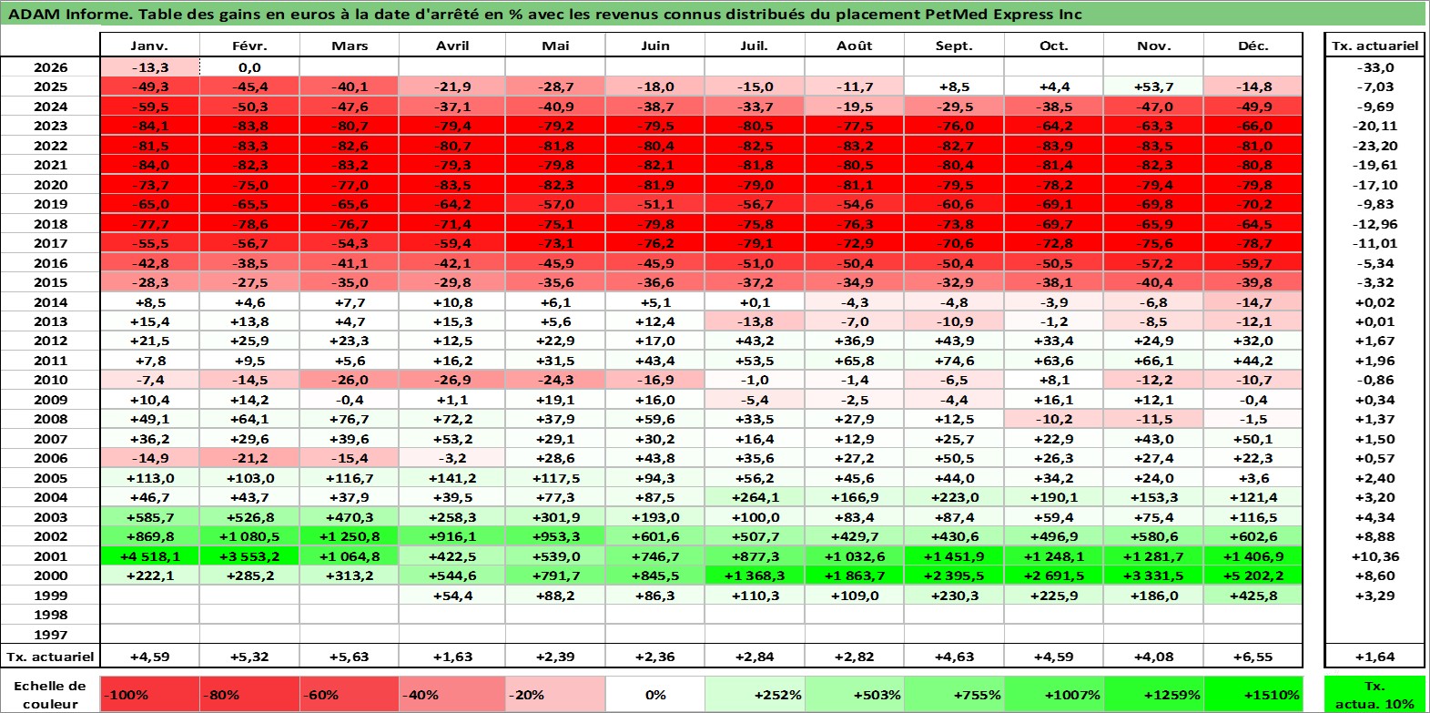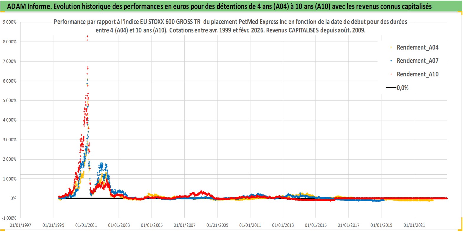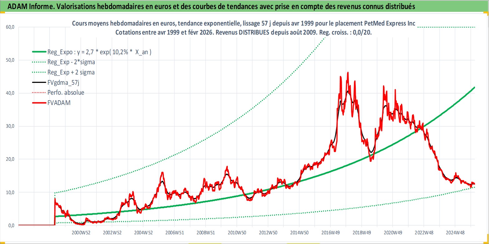 Site dédié aux investisseursPage dédiée sur site financeAnalyse des valorisations hebdomadaires de l'action PetMed Express Inc. Cet actif est cote en USD. Les valorisations sont en contrevaleur EURO et couvrent les semaines 1999W17 a 2026W09. Les revenus de cet actif financier sont pris en compte depuis la semaine 2009W33. La note ESG de cet actif n'est pas connue.