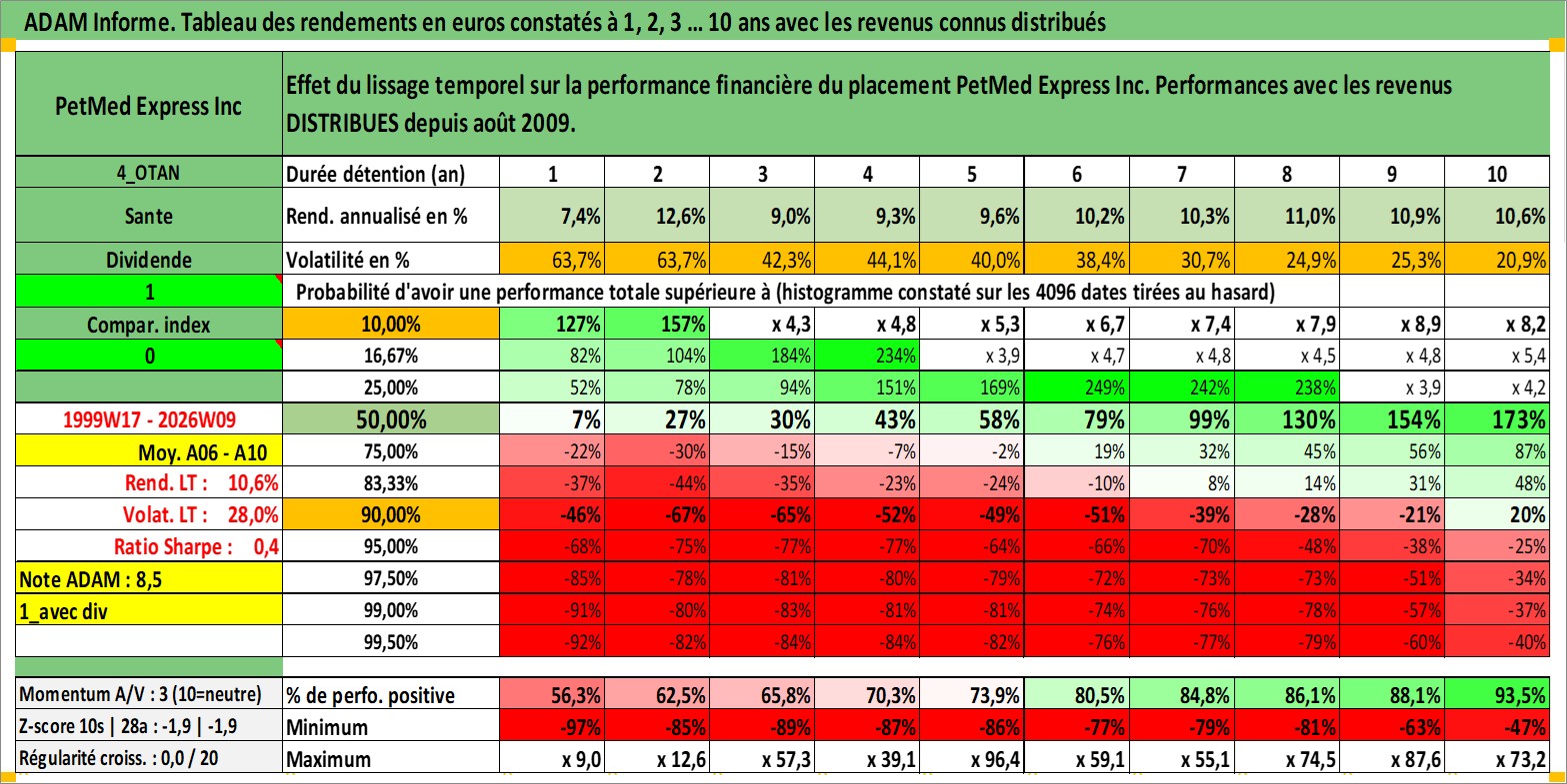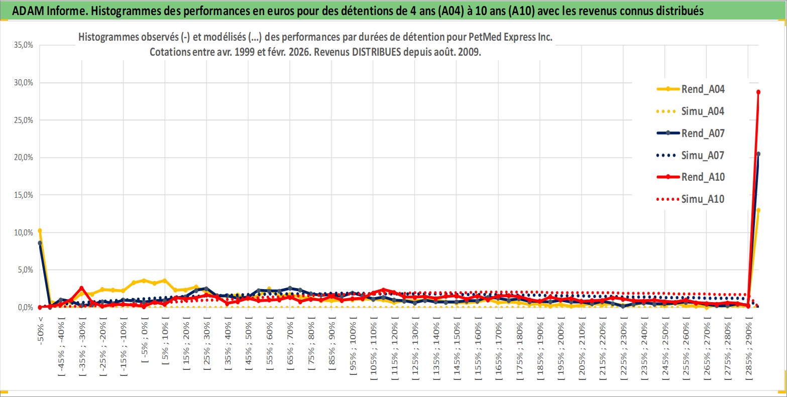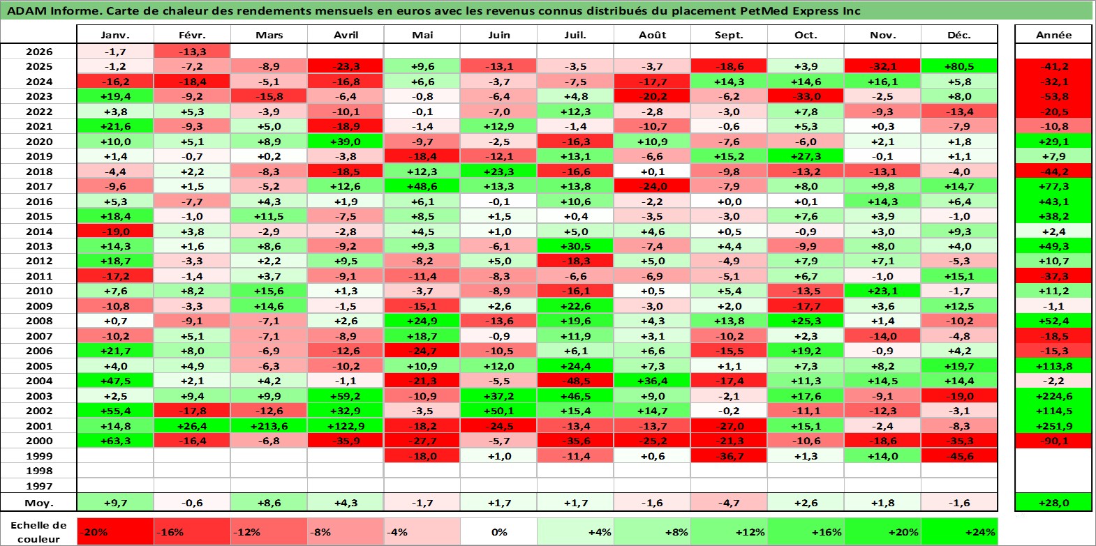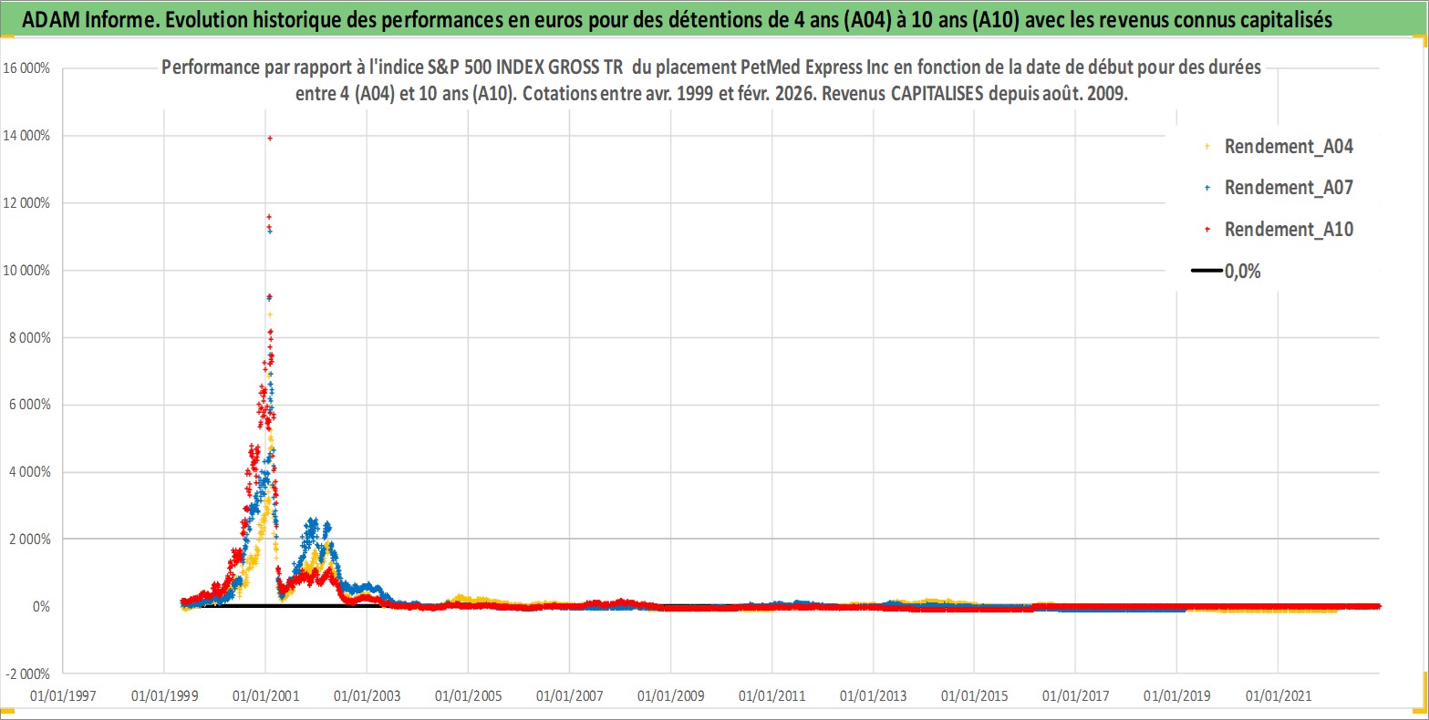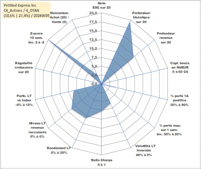 Site dédié aux investisseursPage dédiée sur site financeAnalyse des valorisations hebdomadaires de l'action PetMed Express Inc. Cet actif est cote en USD. Les valorisations sont en contrevaleur EURO et couvrent les semaines 1999W17 a 2026W09. Les revenus de cet actif financier sont pris en compte depuis la semaine 2009W33. La note ESG de cet actif n'est pas connue.