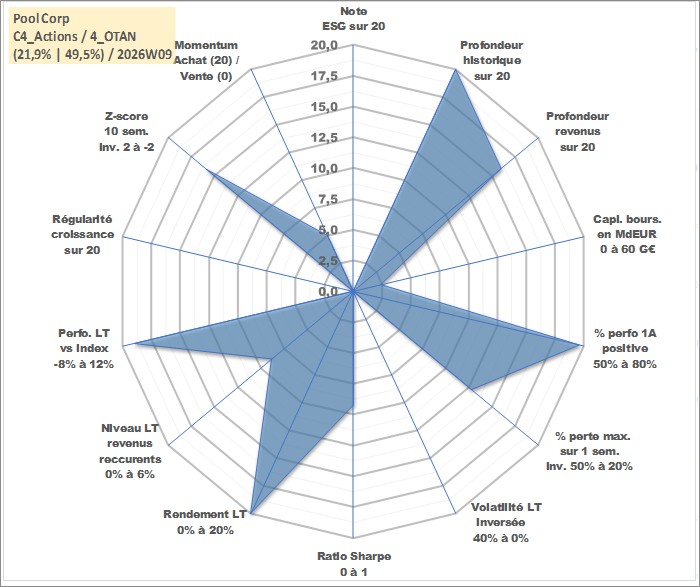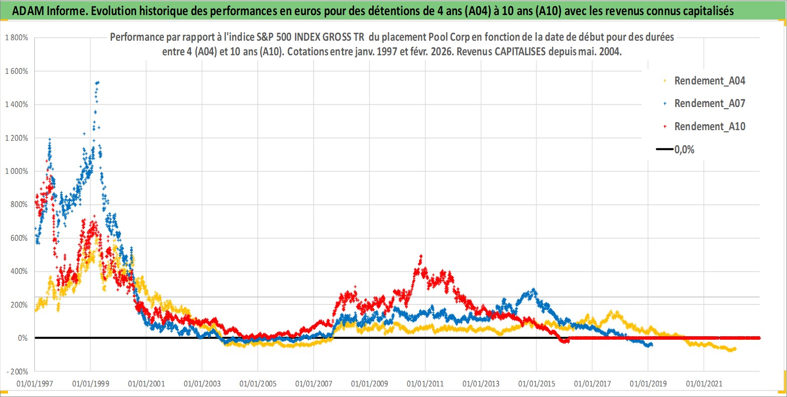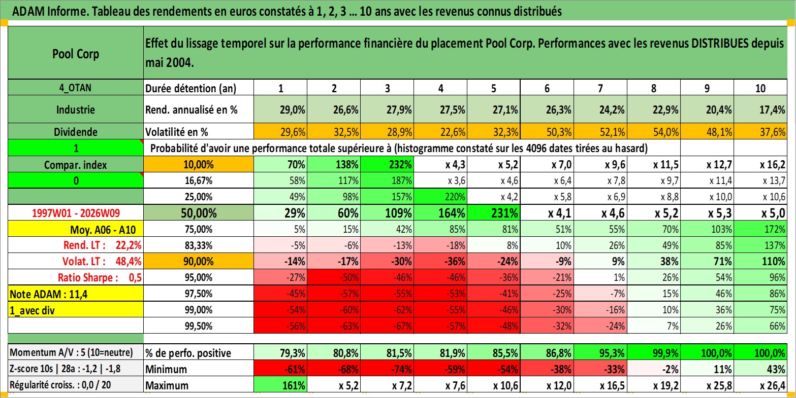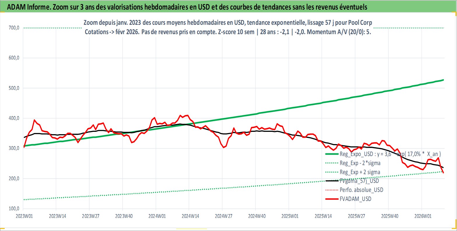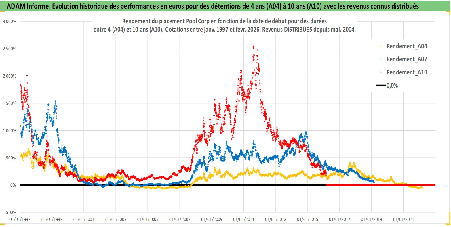 Site dédié aux investisseursPage dédiée sur site financeAnalyse des valorisations hebdomadaires de l'action Pool Corp. Cet actif est cote en USD. Les valorisations sont en contrevaleur EURO et couvrent les semaines 1997W01 a 2026W09. Les revenus de cet actif financier sont pris en compte depuis la semaine 2004W21. La note ESG de cet actif n'est pas connue.