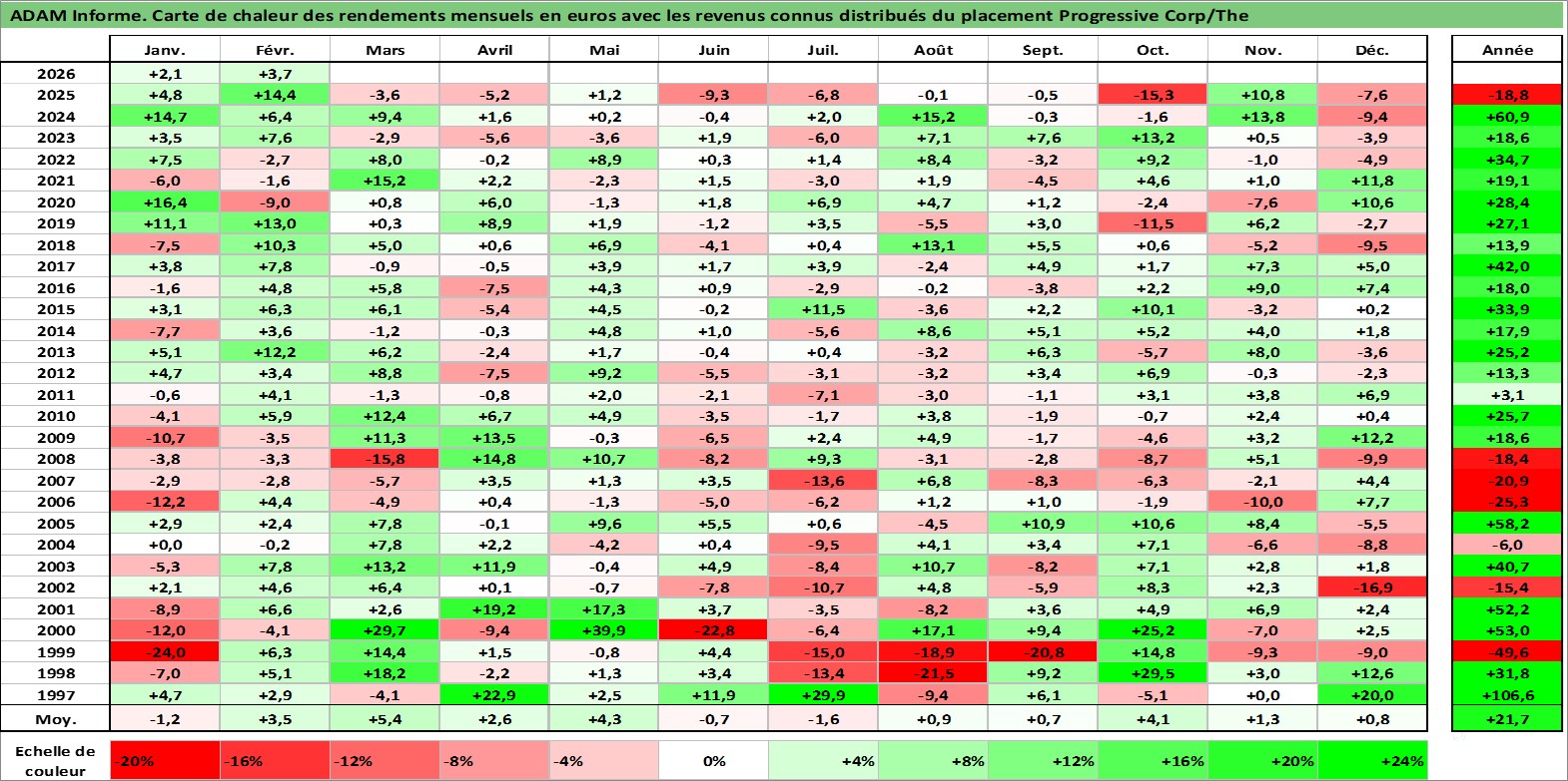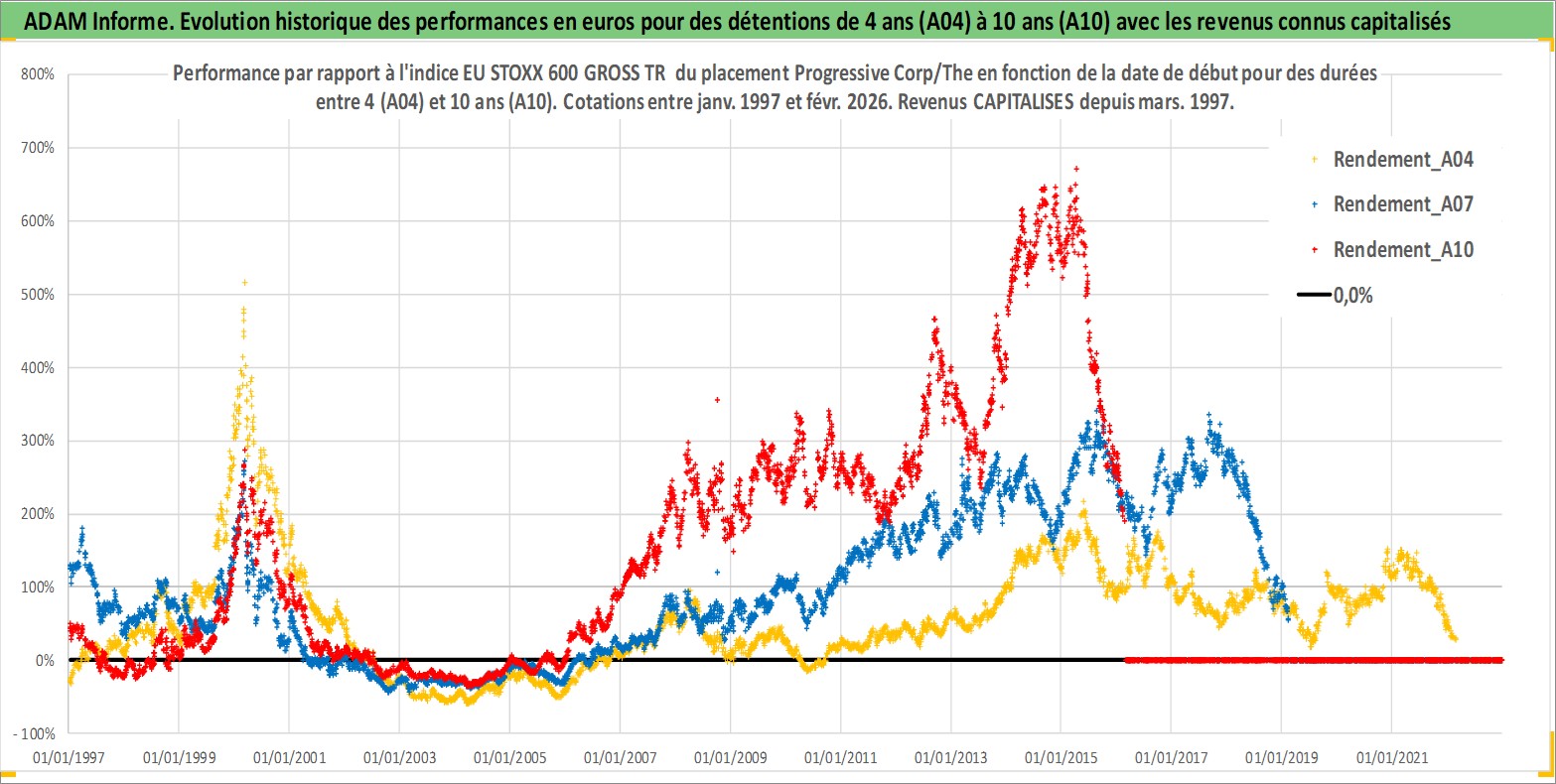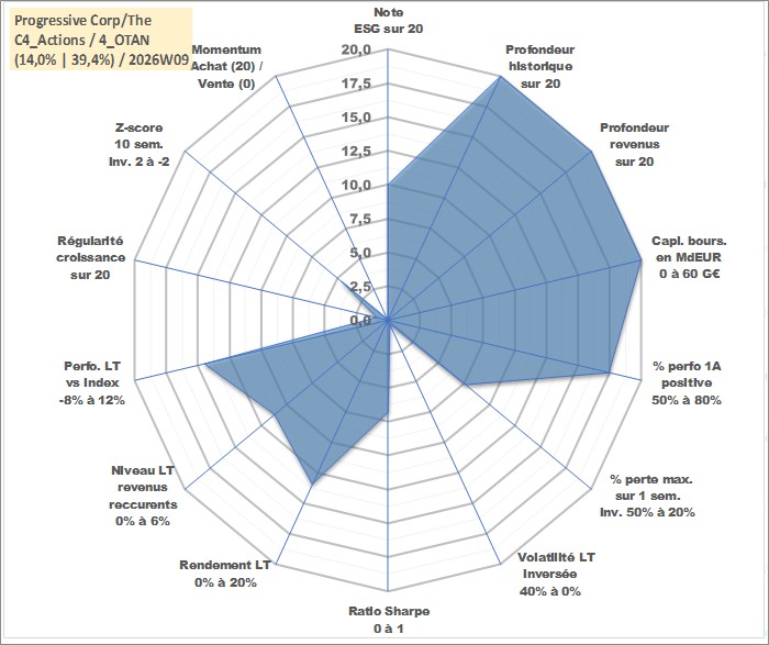 Site dédié aux investisseursPage dédiée sur site financeAnalyse des valorisations hebdomadaires de l'action Progressive Corp/The. Cet actif est cote en USD. Les valorisations sont en contrevaleur EURO et couvrent les semaines 1997W01 a 2026W09. Les revenus de cet actif financier sont pris en compte depuis la semaine 1997W11. La note globale ESG de cet actif est estimee a 10.0 (apres rebasage entre 0 et 20).