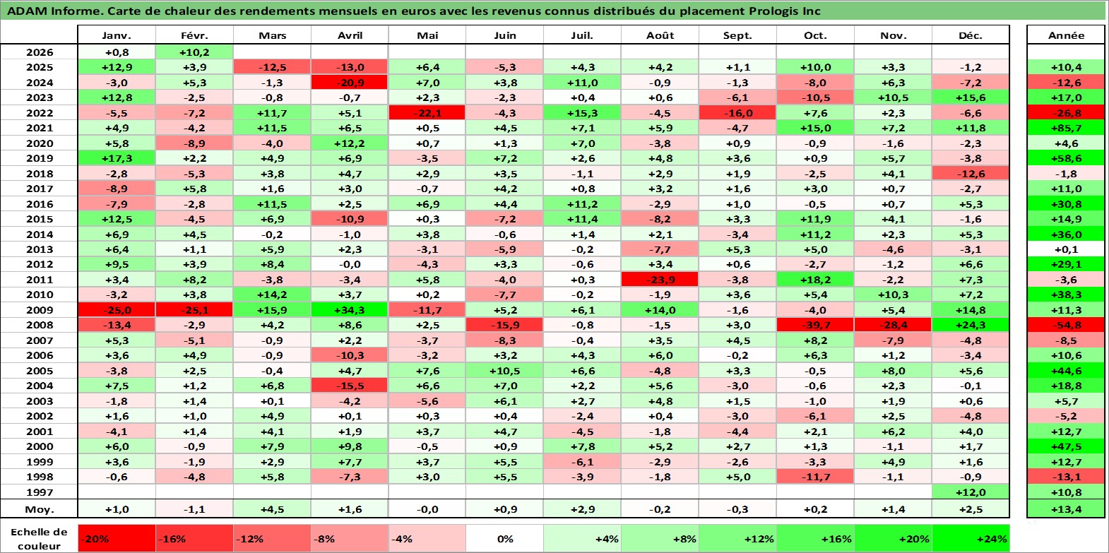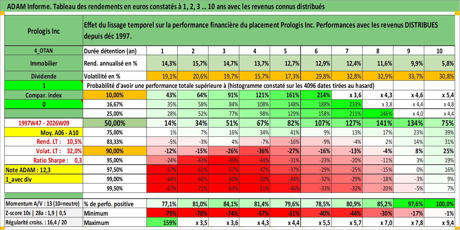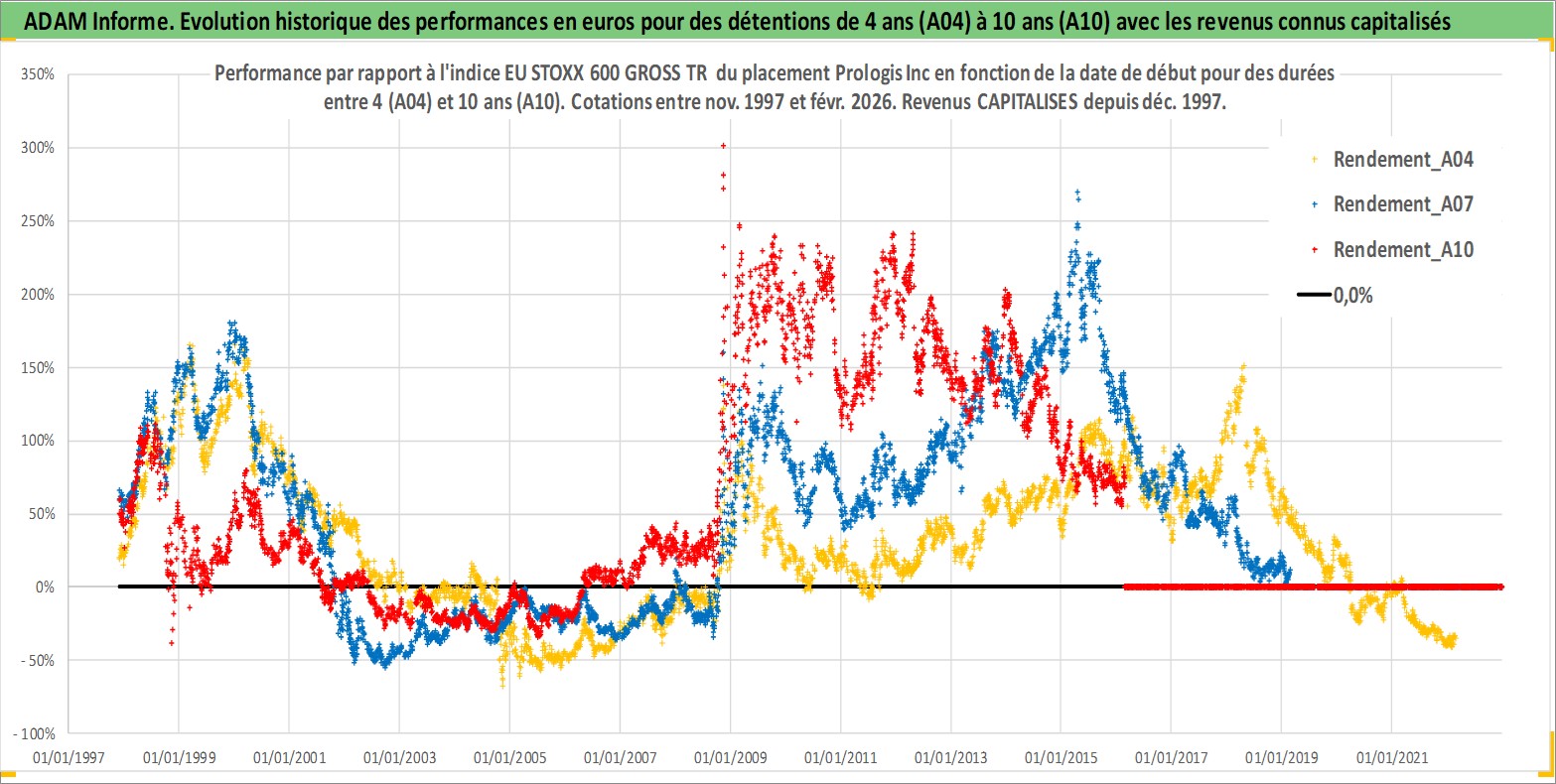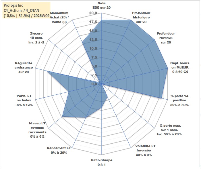 Site dédié aux investisseursPage dédiée sur site financeAnalyse des valorisations hebdomadaires de l'action Prologis Inc. Cet actif est cote en USD. Les valorisations sont en contrevaleur EURO et couvrent les semaines 1997W47 a 2026W09. Les revenus de cet actif financier sont pris en compte depuis la semaine 1997W51. La note globale ESG de cet actif est estimee a 18.0 (apres rebasage entre 0 et 20).