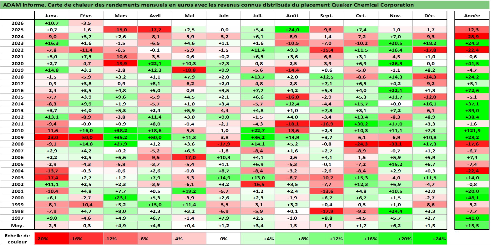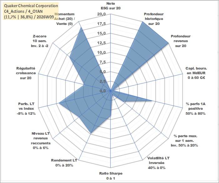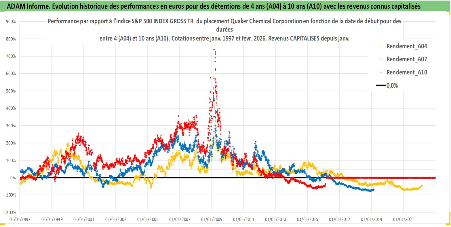 Site dédié aux investisseursPage dédiée sur site financeAnalyse des valorisations hebdomadaires de l'action Quaker Chemical Corporation. Cet actif est cote en USD. Les valorisations sont en contrevaleur EURO et couvrent les semaines 1997W01 a 2026W09. Les revenus de cet actif financier sont pris en compte depuis la semaine 1997W03. La note ESG de cet actif n'est pas connue.