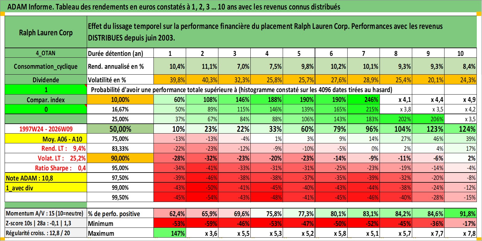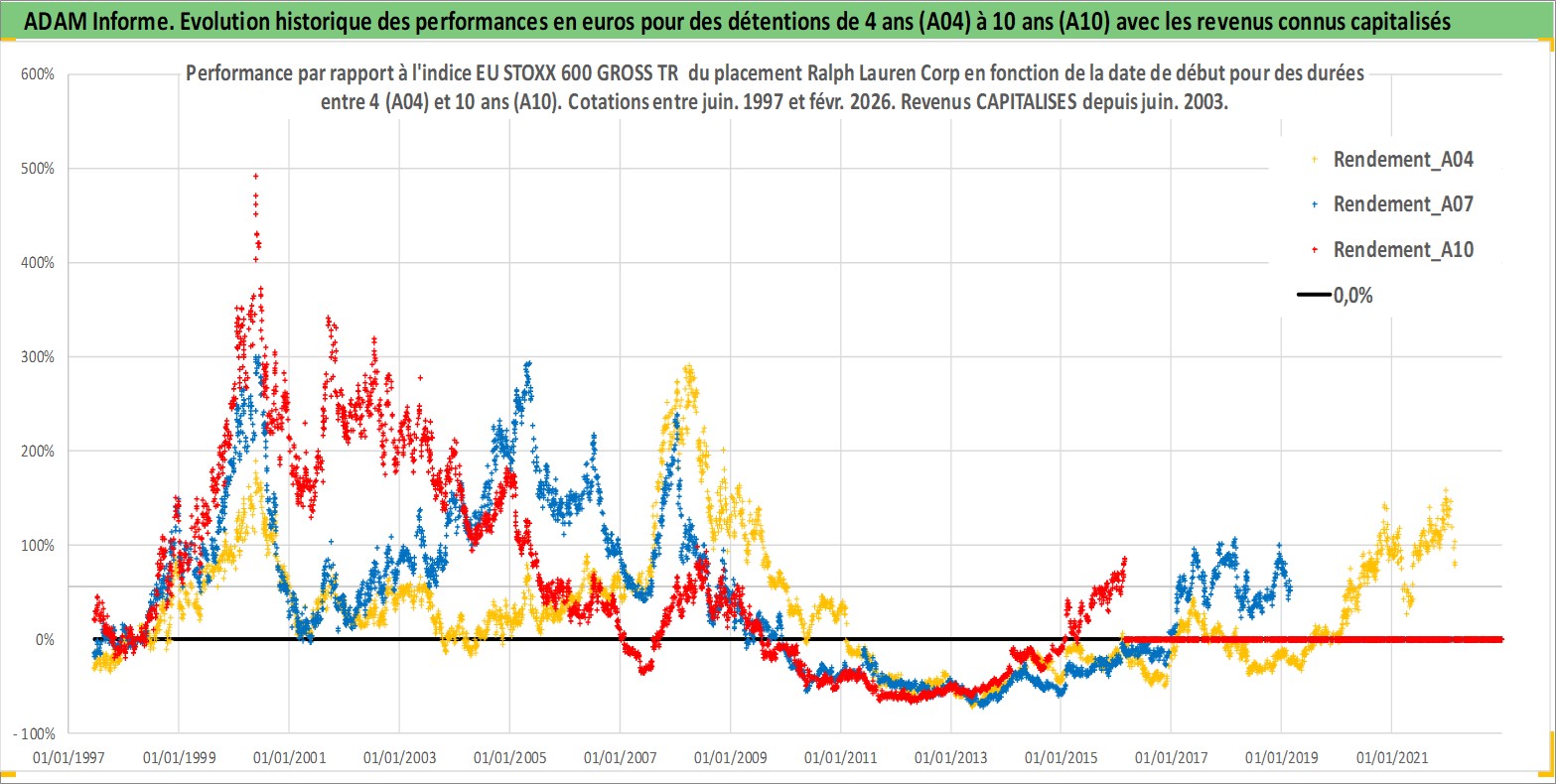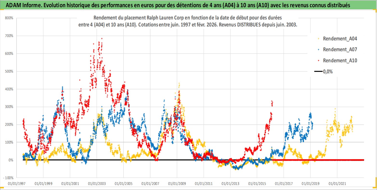 Site dédié aux investisseursPage dédiée sur site financeAnalyse des valorisations hebdomadaires de l'action Ralph Lauren Corp. Cet actif est cote en USD. Les valorisations sont en contrevaleur EURO et couvrent les semaines 1997W24 a 2026W09. Les revenus de cet actif financier sont pris en compte depuis la semaine 2003W26. La note globale ESG de cet actif est estimee a 15.0 (apres rebasage entre 0 et 20).
