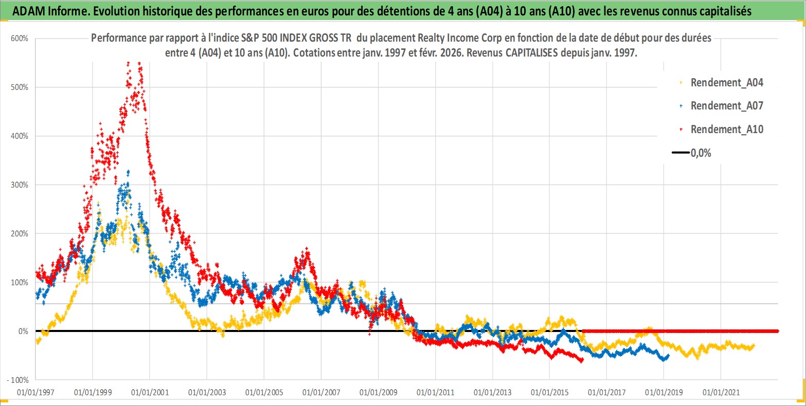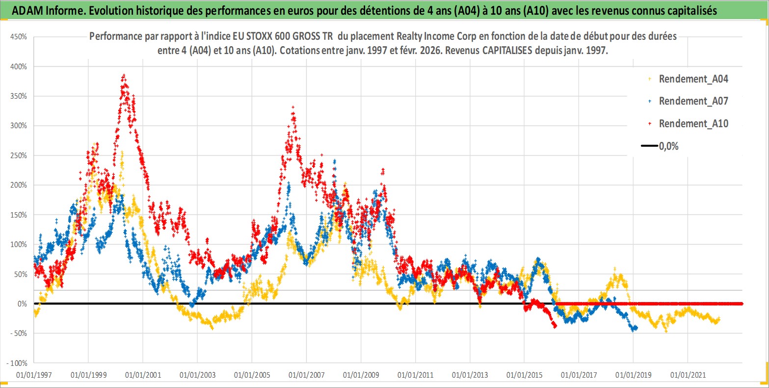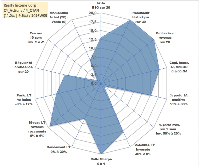 Site dédié aux investisseursPage dédiée sur site financeAnalyse des valorisations hebdomadaires de l'action Realty Income Corp. Cet actif est cote en USD. Les valorisations sont en contrevaleur EURO et couvrent les semaines 1997W01 a 2026W09. Les revenus de cet actif financier sont pris en compte depuis la semaine 1997W05. La note globale ESG de cet actif est estimee a 13.0 (apres rebasage entre 0 et 20).