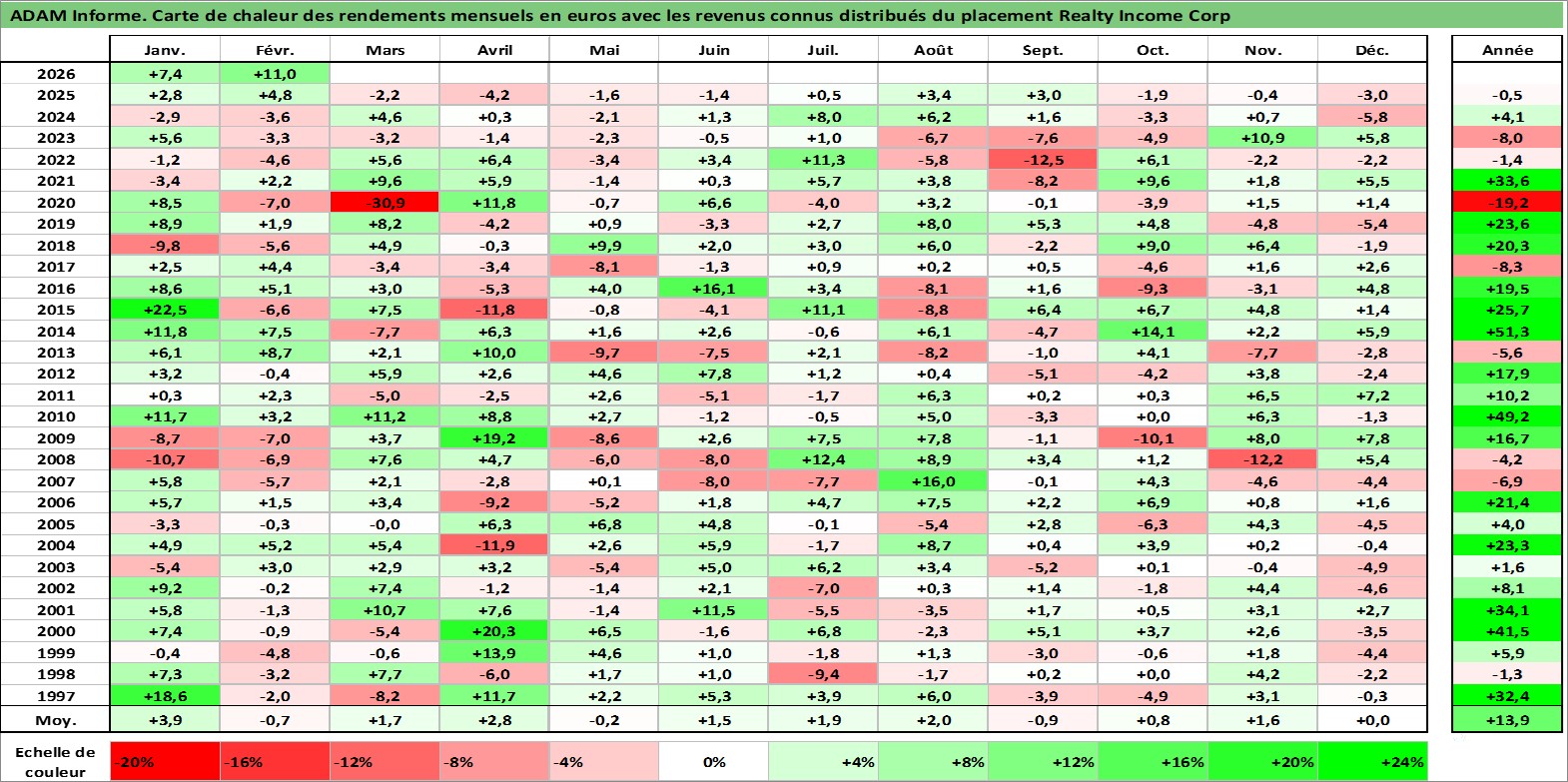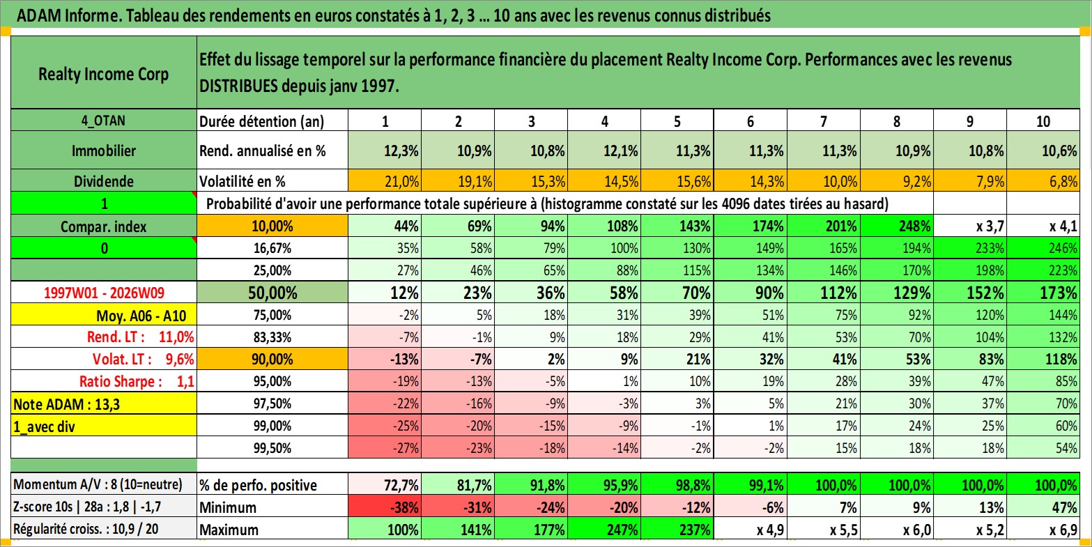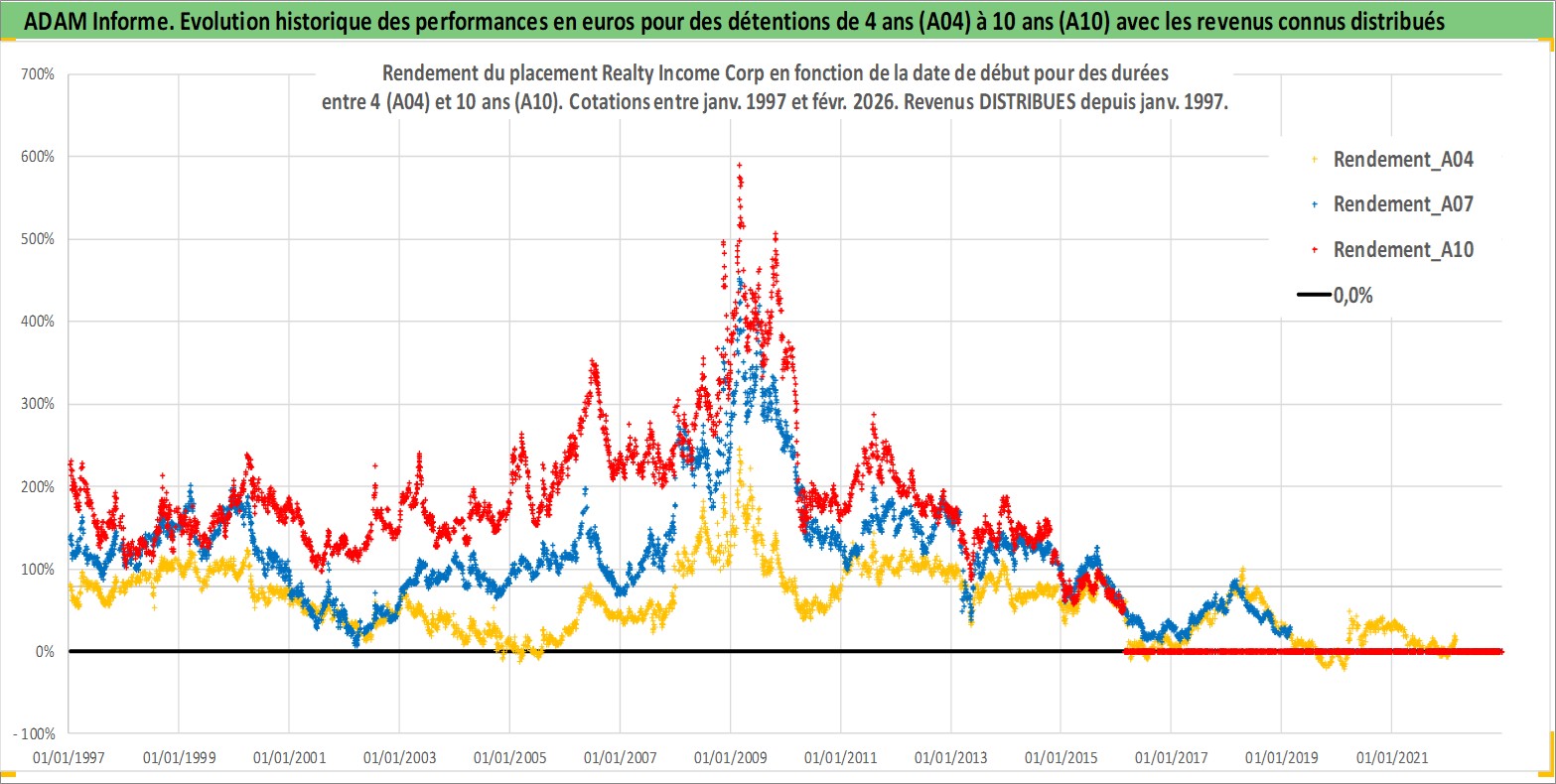 Site dédié aux investisseursPage dédiée sur site financeAnalyse des valorisations hebdomadaires de l'action Realty Income Corp. Cet actif est cote en USD. Les valorisations sont en contrevaleur EURO et couvrent les semaines 1997W01 a 2026W09. Les revenus de cet actif financier sont pris en compte depuis la semaine 1997W05. La note globale ESG de cet actif est estimee a 13.0 (apres rebasage entre 0 et 20).