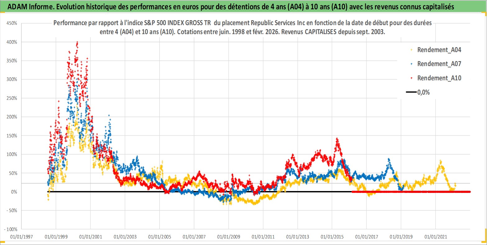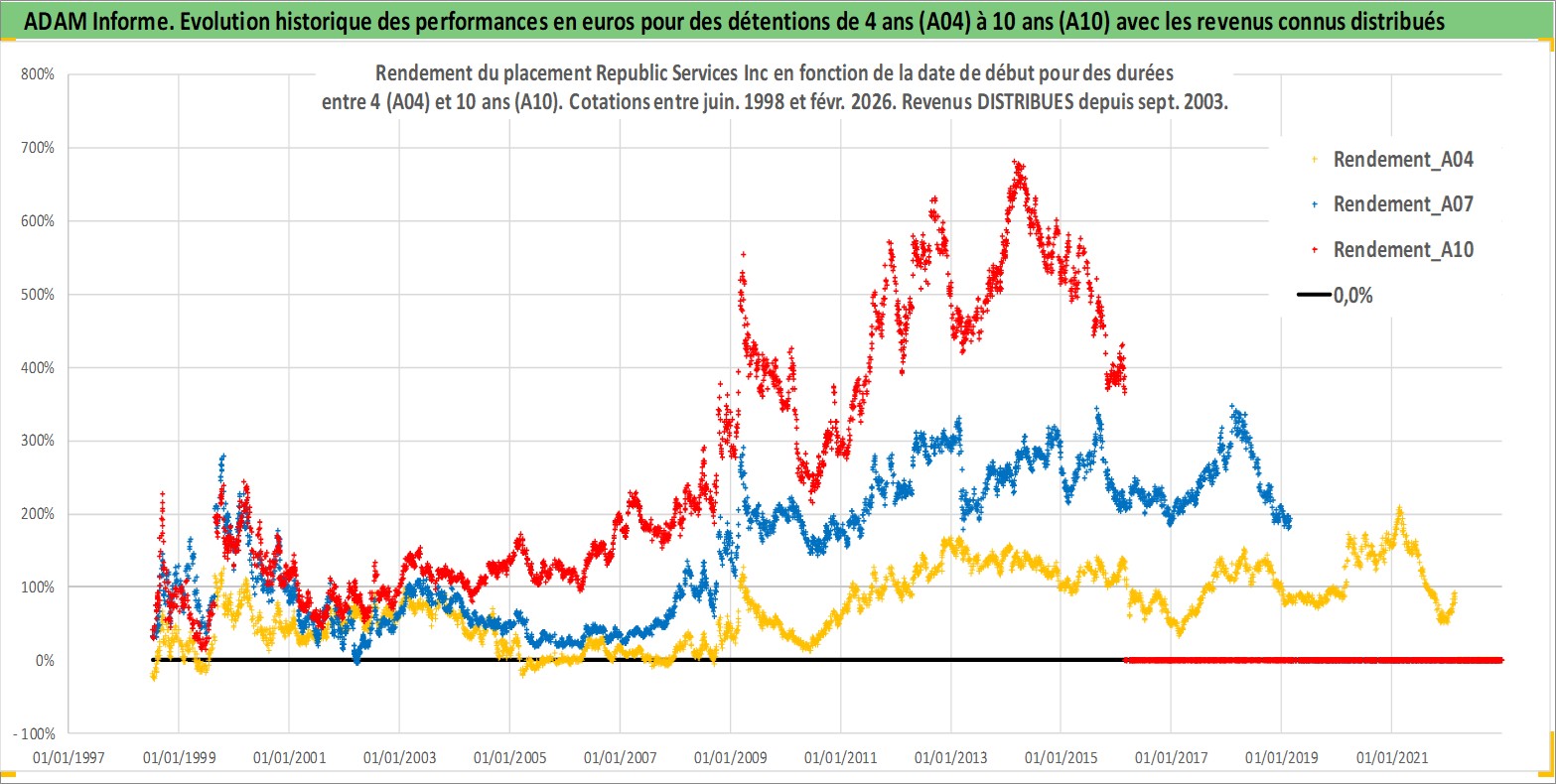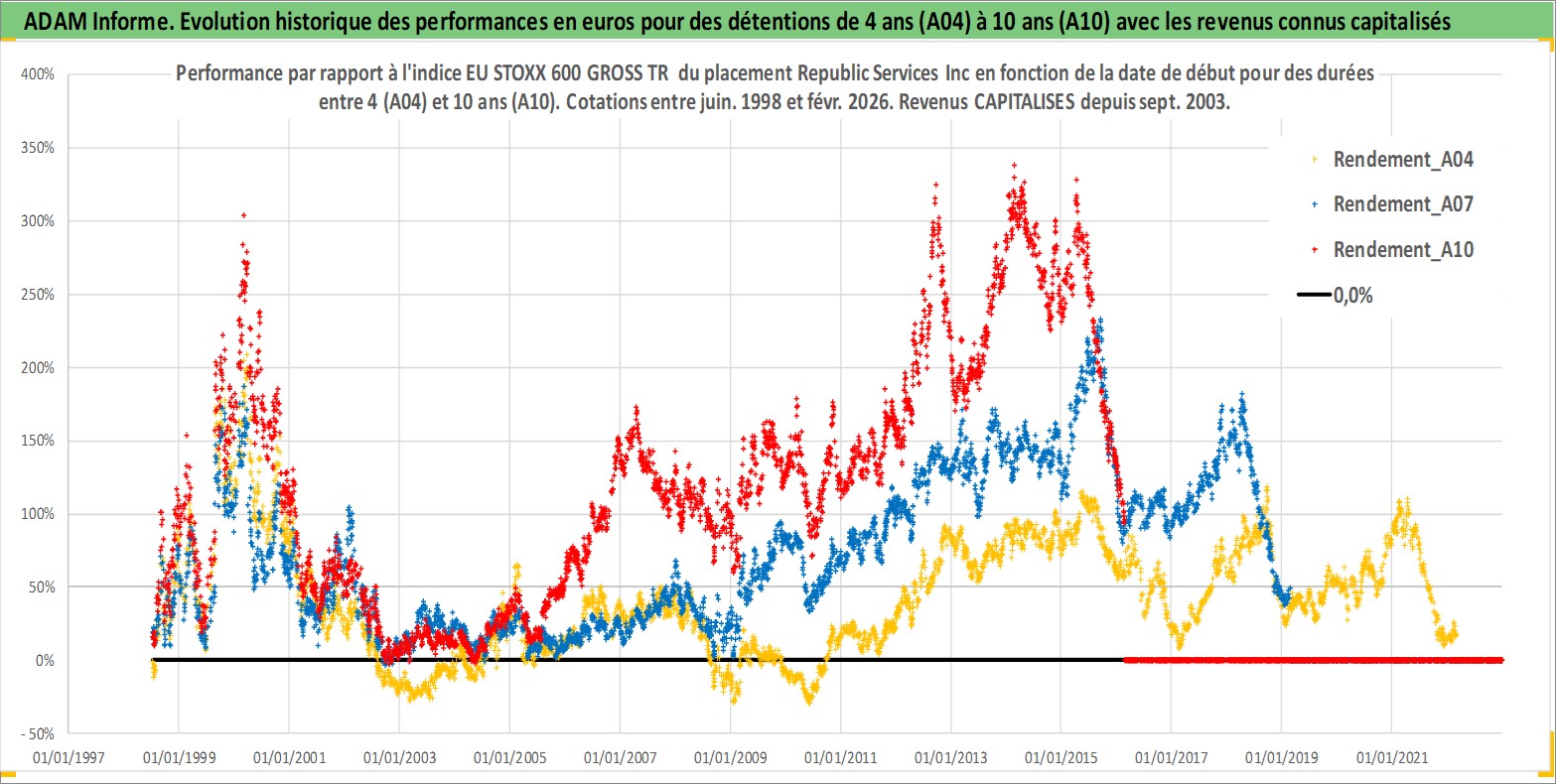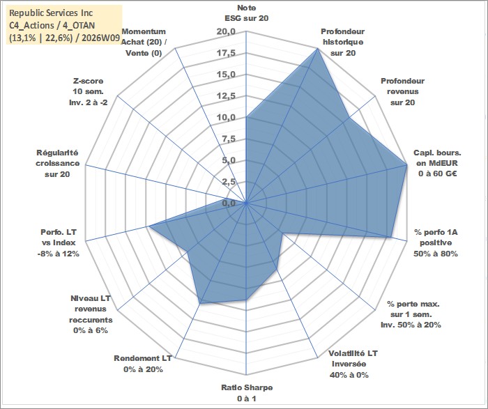 Site dédié aux investisseursPage dédiée sur site financeAnalyse des valorisations hebdomadaires de l'action Republic Services Inc. Cet actif est cote en USD. Les valorisations sont en contrevaleur EURO et couvrent les semaines 1998W27 a 2026W09. Les revenus de cet actif financier sont pris en compte depuis la semaine 2003W39. La note globale ESG de cet actif est estimee a 10.0 (apres rebasage entre 0 et 20).