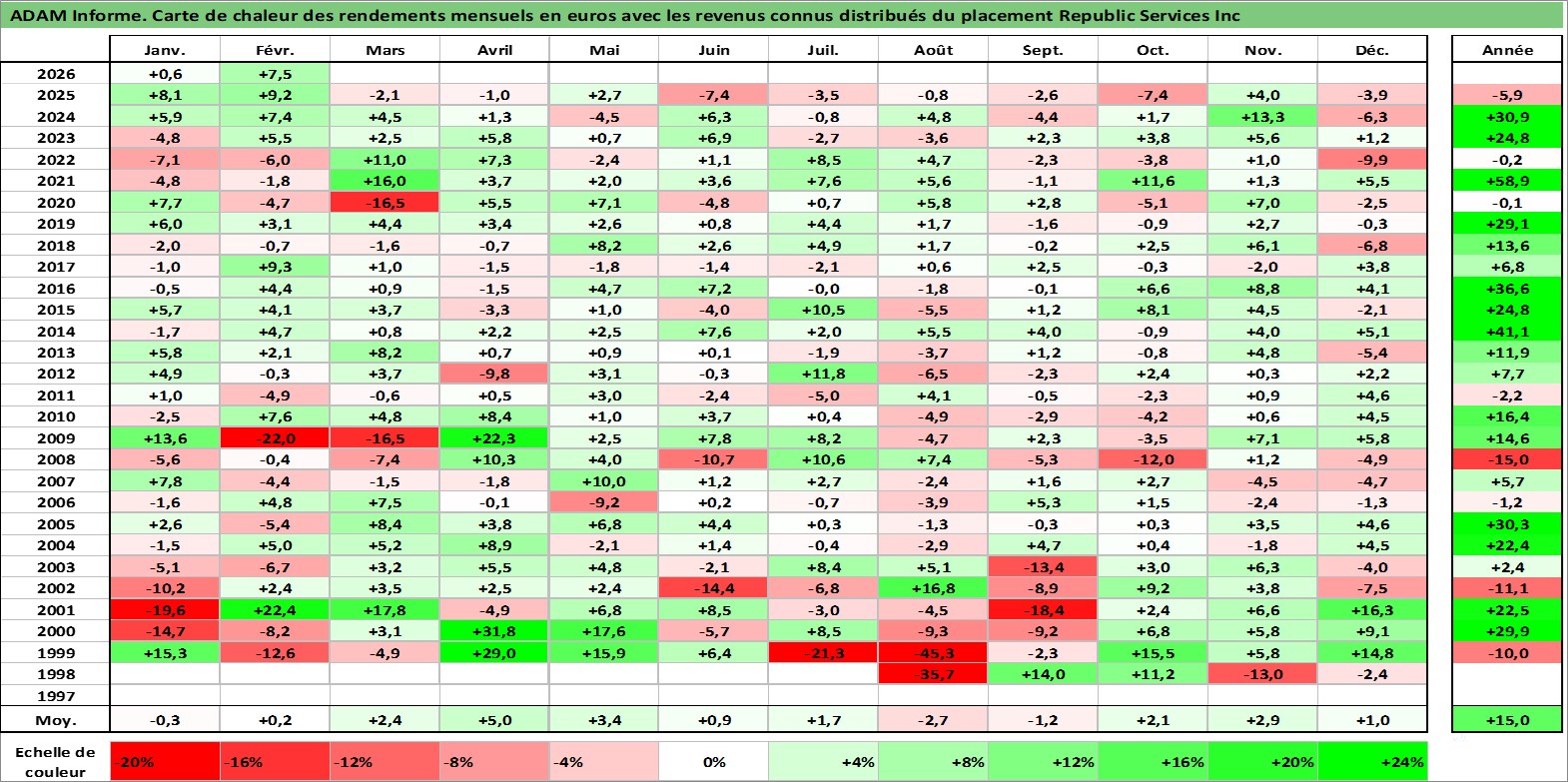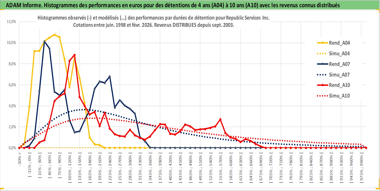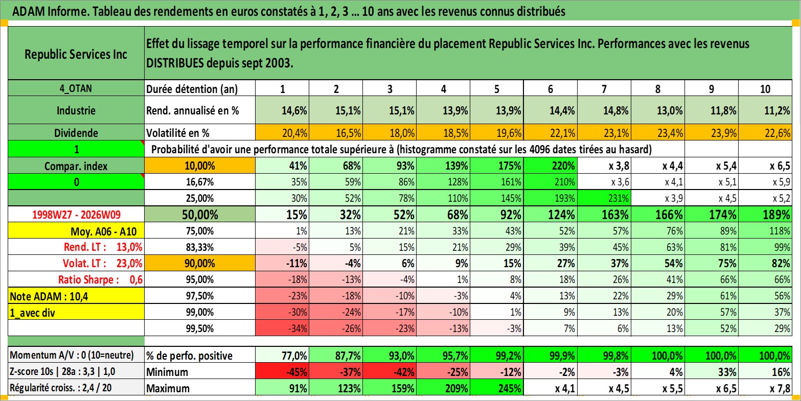 Site dédié aux investisseursPage dédiée sur site financeAnalyse des valorisations hebdomadaires de l'action Republic Services Inc. Cet actif est cote en USD. Les valorisations sont en contrevaleur EURO et couvrent les semaines 1998W27 a 2026W09. Les revenus de cet actif financier sont pris en compte depuis la semaine 2003W39. La note globale ESG de cet actif est estimee a 10.0 (apres rebasage entre 0 et 20).
