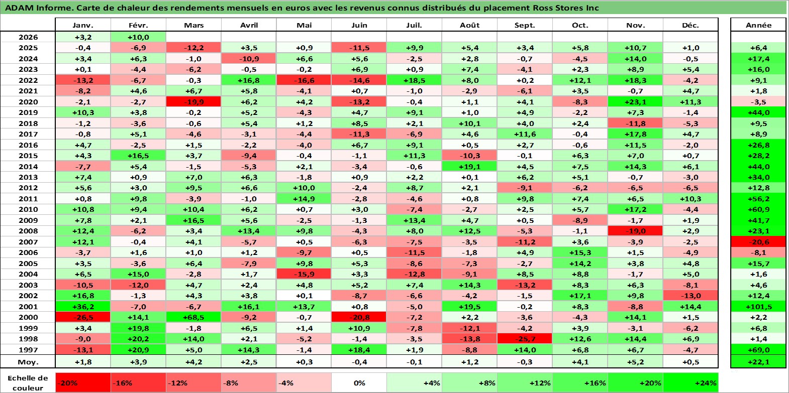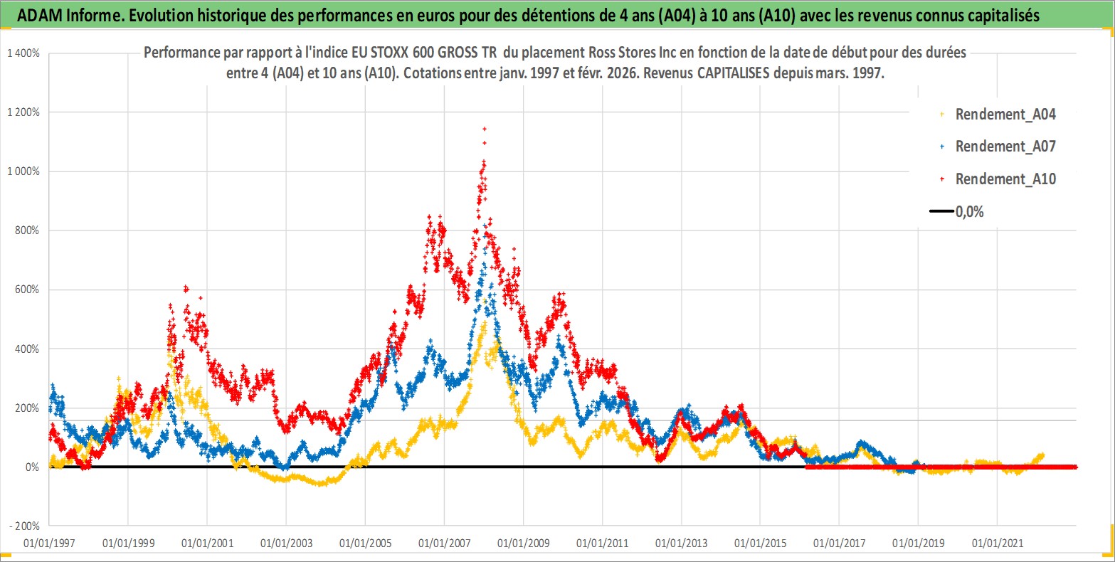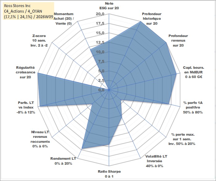 Site dédié aux investisseursPage dédiée sur site financeAnalyse des valorisations hebdomadaires de l'action Ross Stores Inc. Cet actif est cote en USD. Les valorisations sont en contrevaleur EURO et couvrent les semaines 1997W01 a 2026W09. Les revenus de cet actif financier sont pris en compte depuis la semaine 1997W10. La note globale ESG de cet actif est estimee a 13.0 (apres rebasage entre 0 et 20).