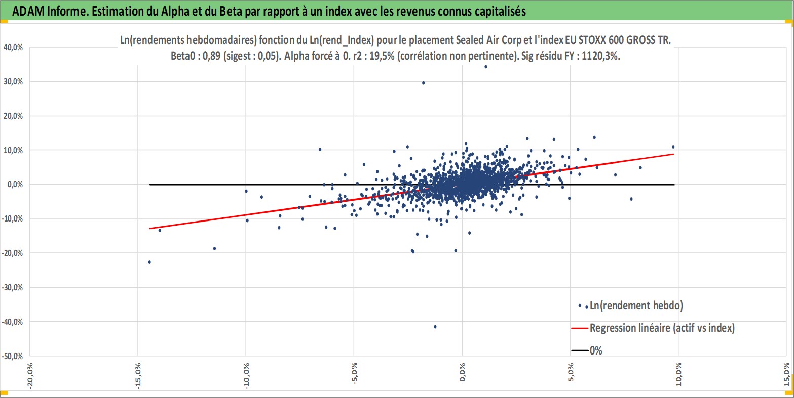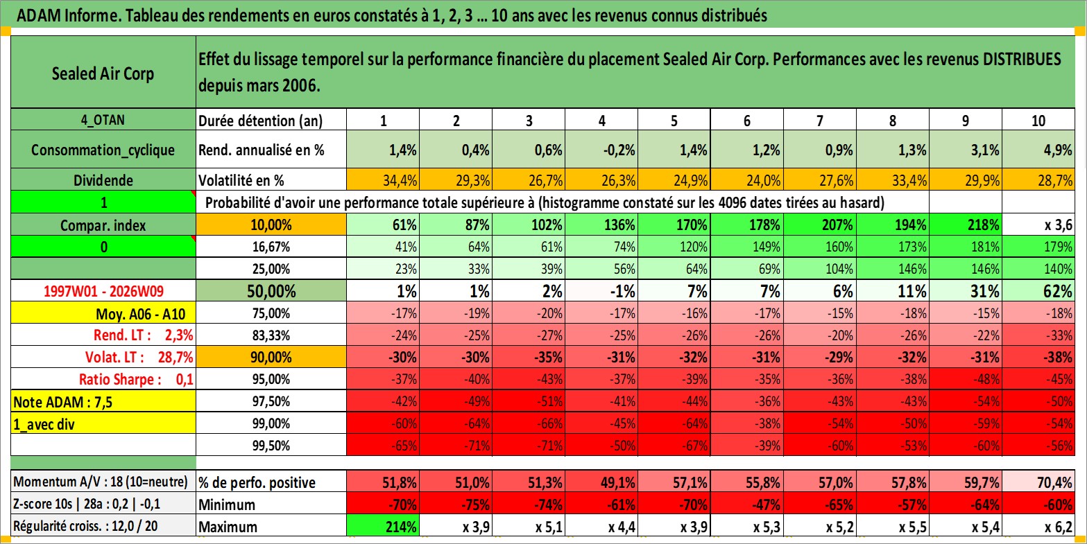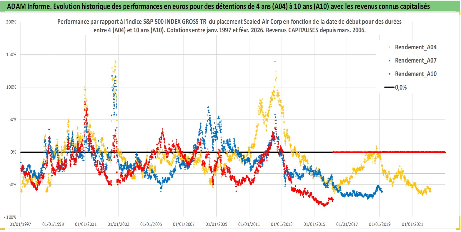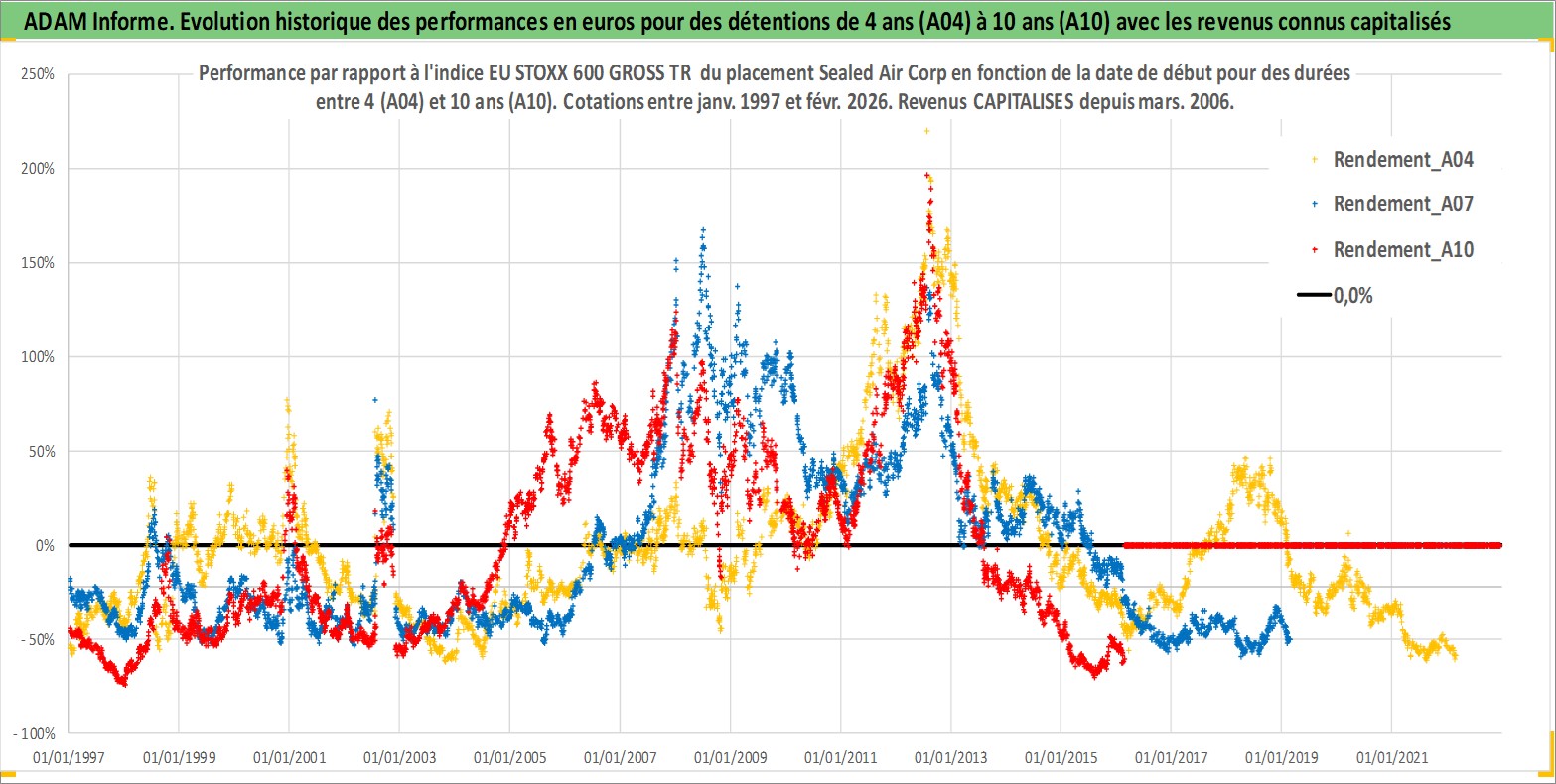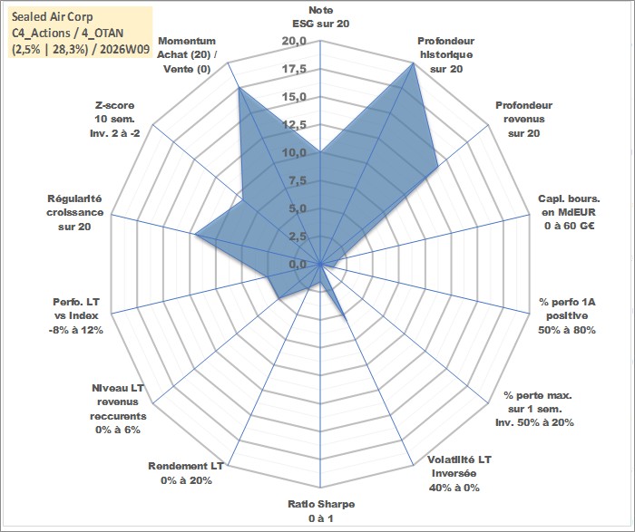 Site dédié aux investisseursPage dédiée sur site financeAnalyse des valorisations hebdomadaires de l'action Sealed Air Corp. Cet actif est cote en USD. Les valorisations sont en contrevaleur EURO et couvrent les semaines 1997W01 a 2026W09. Les revenus de cet actif financier sont pris en compte depuis la semaine 2006W09. La note globale ESG de cet actif est estimee a 10.0 (apres rebasage entre 0 et 20).