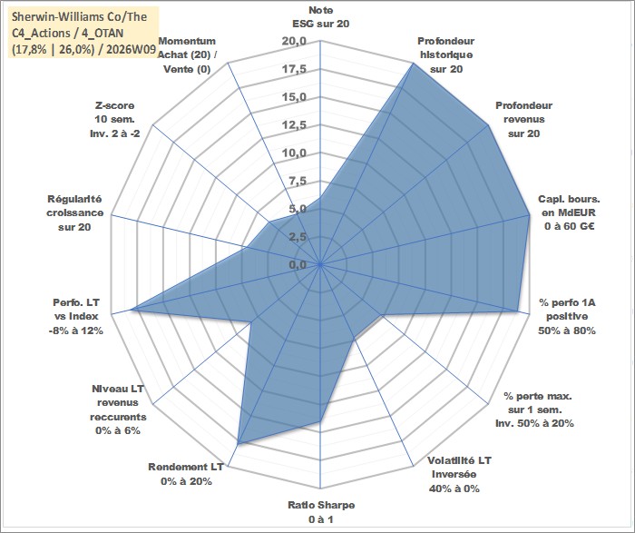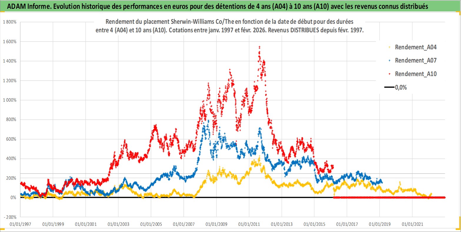 Site dédié aux investisseursPage dédiée sur site financeAnalyse des valorisations hebdomadaires de l'action Sherwin-Williams Co/The. Cet actif est cote en USD. Les valorisations sont en contrevaleur EURO et couvrent les semaines 1997W01 a 2026W09. Les revenus de cet actif financier sont pris en compte depuis la semaine 1997W09. La note globale ESG de cet actif est estimee a 6.0 (apres rebasage entre 0 et 20).