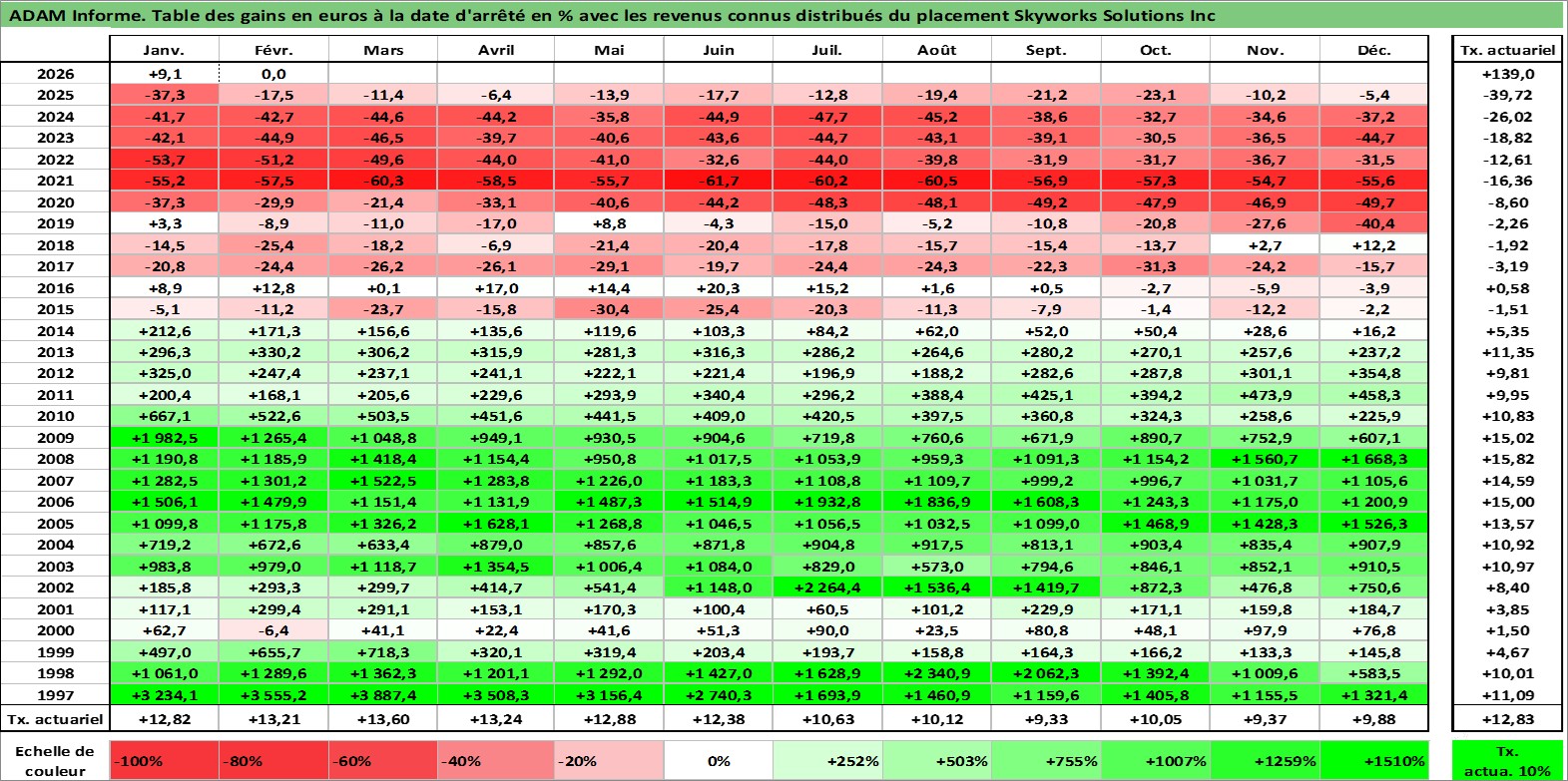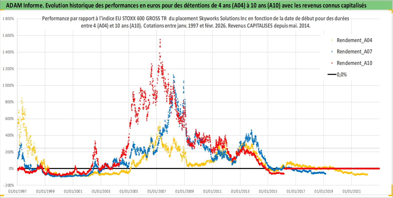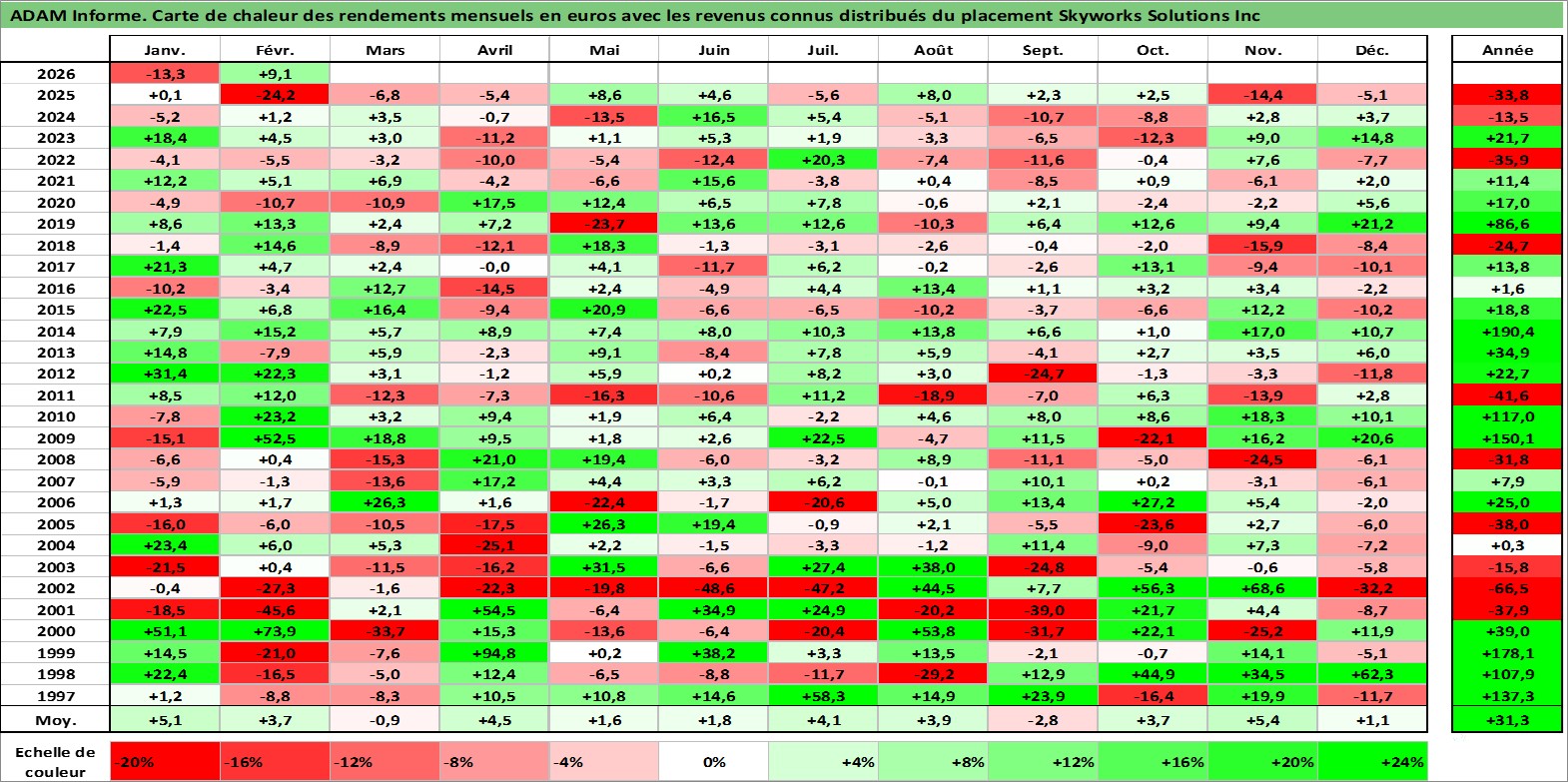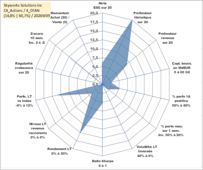 Site dédié aux investisseursPage dédiée sur site financeAnalyse des valorisations hebdomadaires de l'action Skyworks Solutions Inc. Cet actif est cote en USD. Les valorisations sont en contrevaleur EURO et couvrent les semaines 1997W01 a 2026W09. Les revenus de cet actif financier sont pris en compte depuis la semaine 2014W19. La note globale ESG de cet actif est estimee a 6.0 (apres rebasage entre 0 et 20).