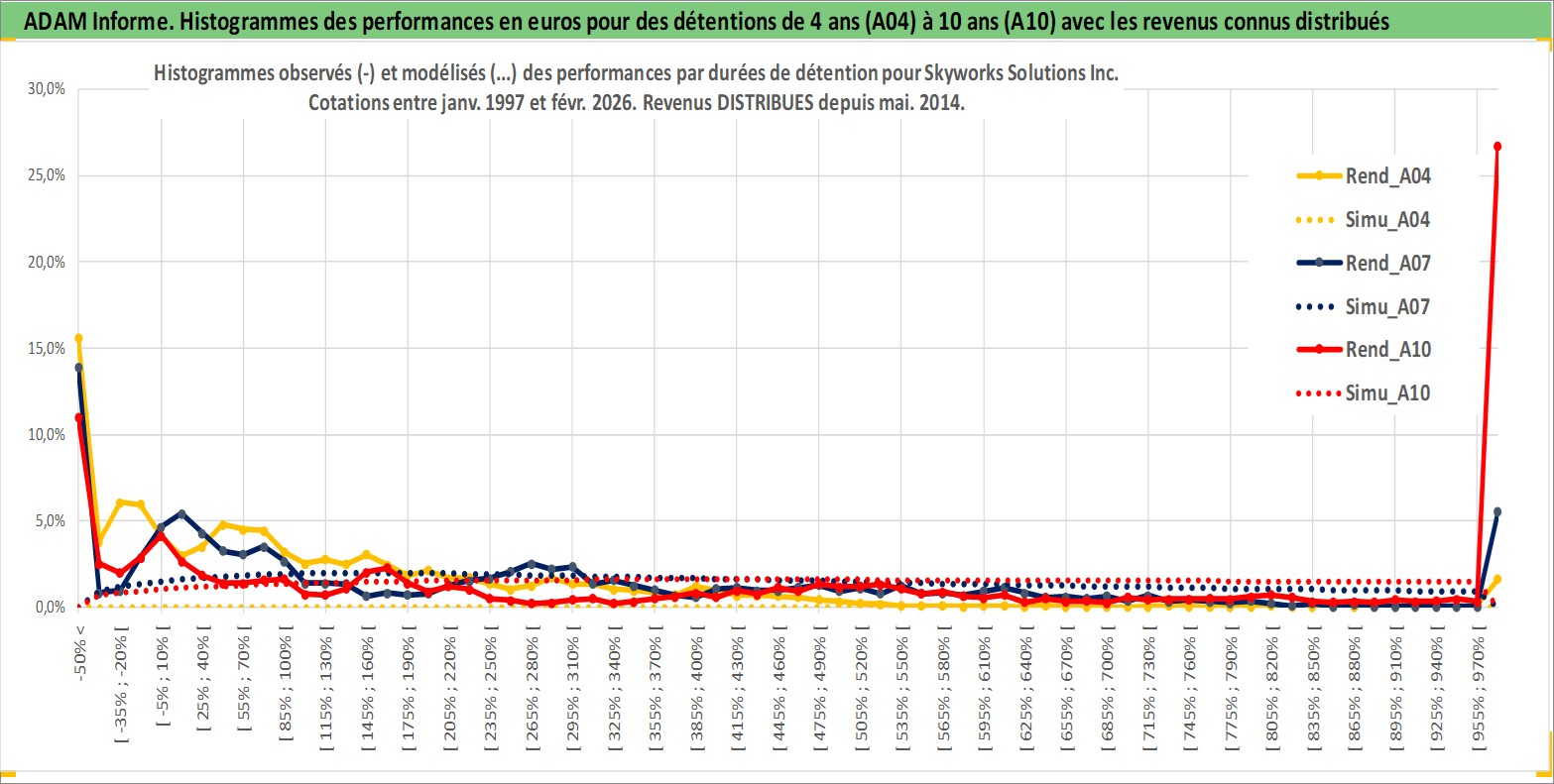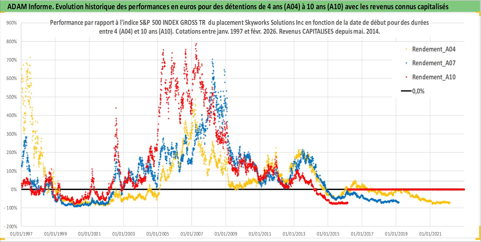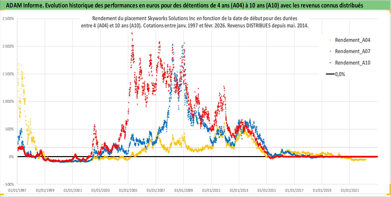 Site dédié aux investisseursPage dédiée sur site financeAnalyse des valorisations hebdomadaires de l'action Skyworks Solutions Inc. Cet actif est cote en USD. Les valorisations sont en contrevaleur EURO et couvrent les semaines 1997W01 a 2026W09. Les revenus de cet actif financier sont pris en compte depuis la semaine 2014W19. La note globale ESG de cet actif est estimee a 6.0 (apres rebasage entre 0 et 20).