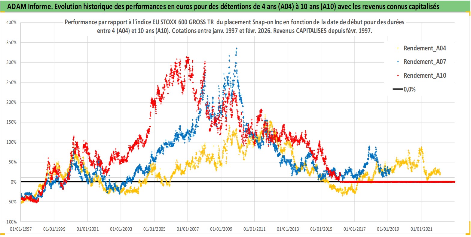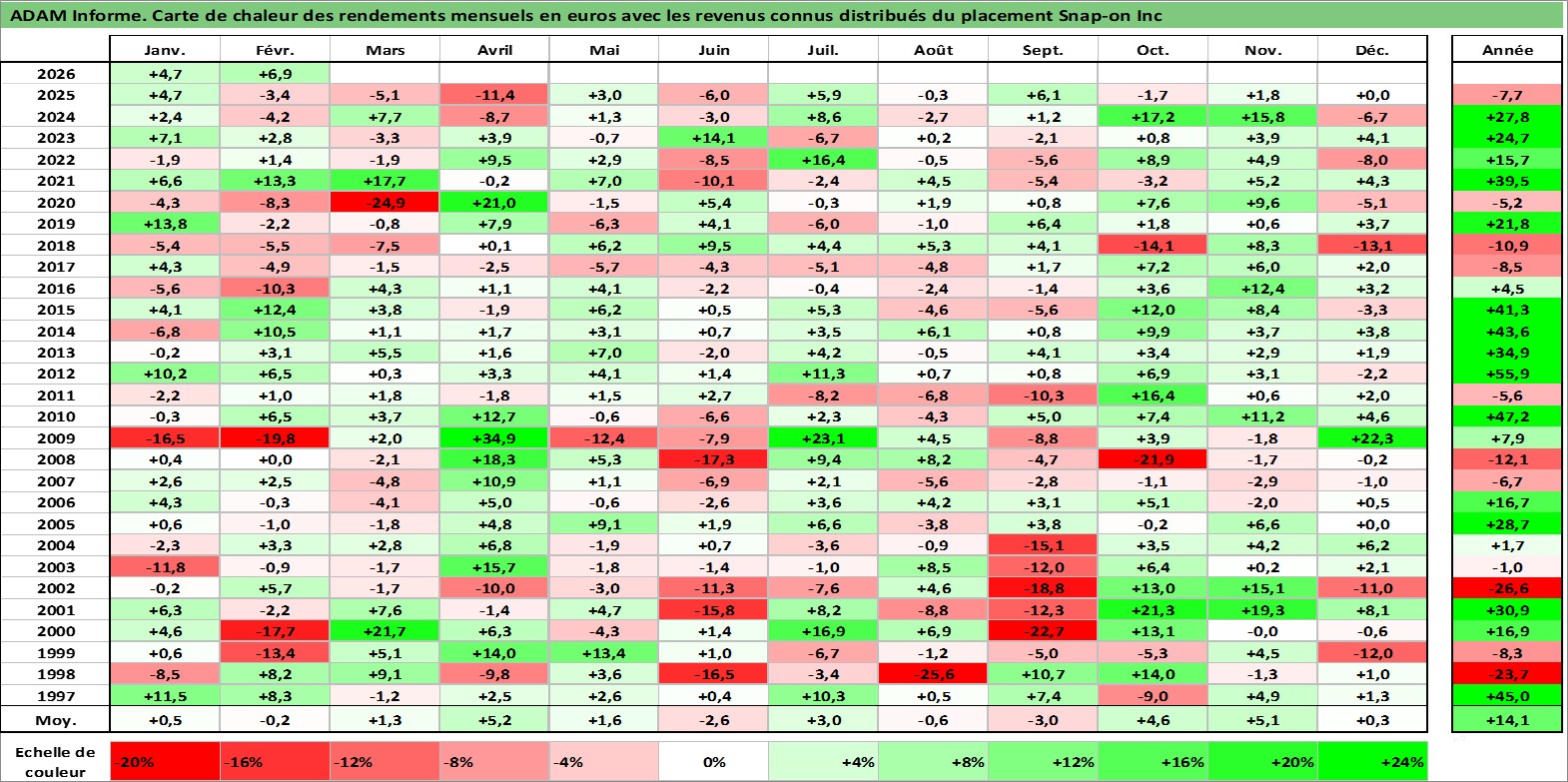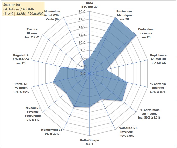 Site dédié aux investisseursPage dédiée sur site financeAnalyse des valorisations hebdomadaires de l'action Snap-on Inc. Cet actif est cote en USD. Les valorisations sont en contrevaleur EURO et couvrent les semaines 1997W01 a 2026W09. Les revenus de cet actif financier sont pris en compte depuis la semaine 1997W07. La note globale ESG de cet actif est estimee a 5.0 (apres rebasage entre 0 et 20).