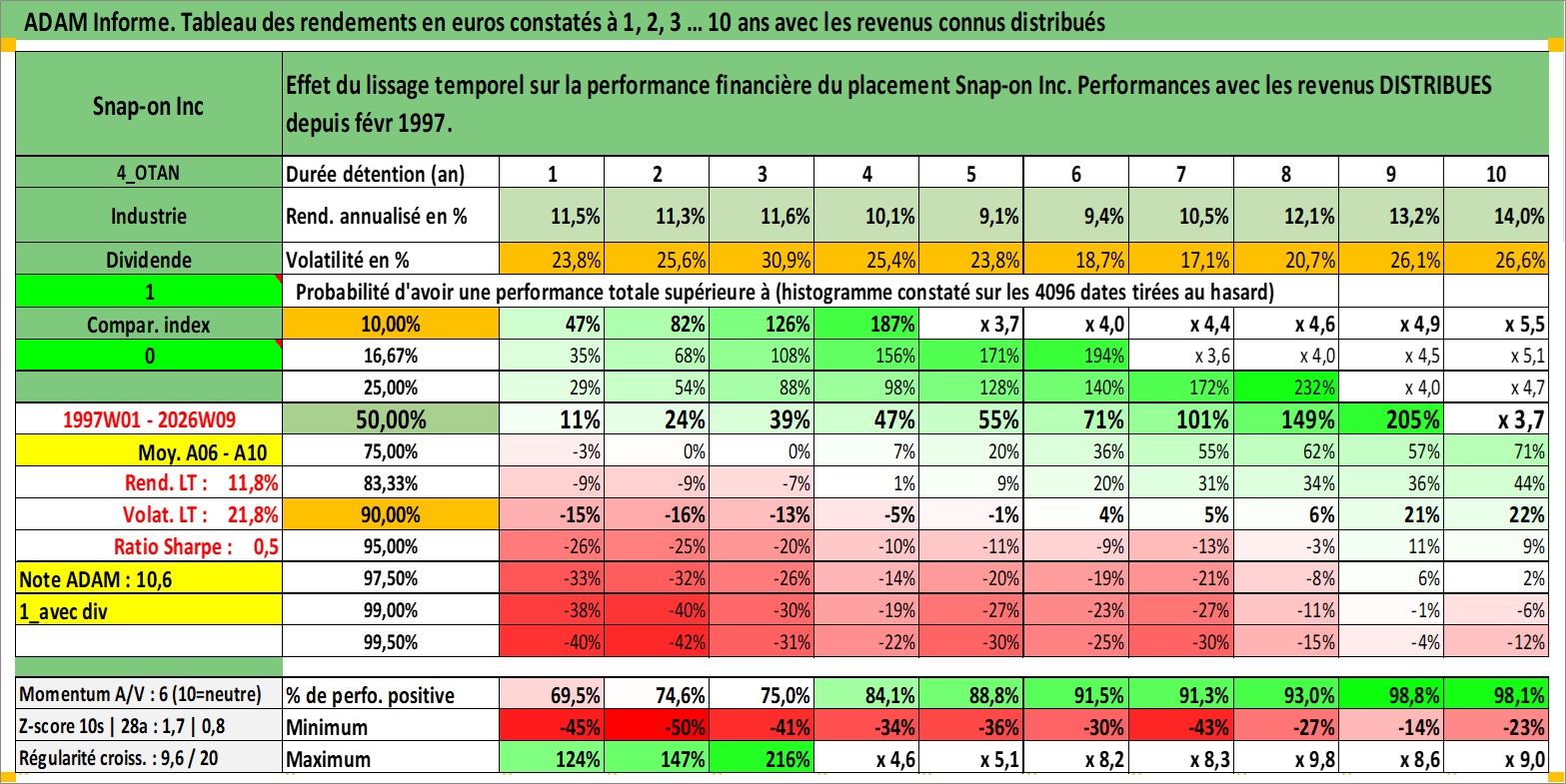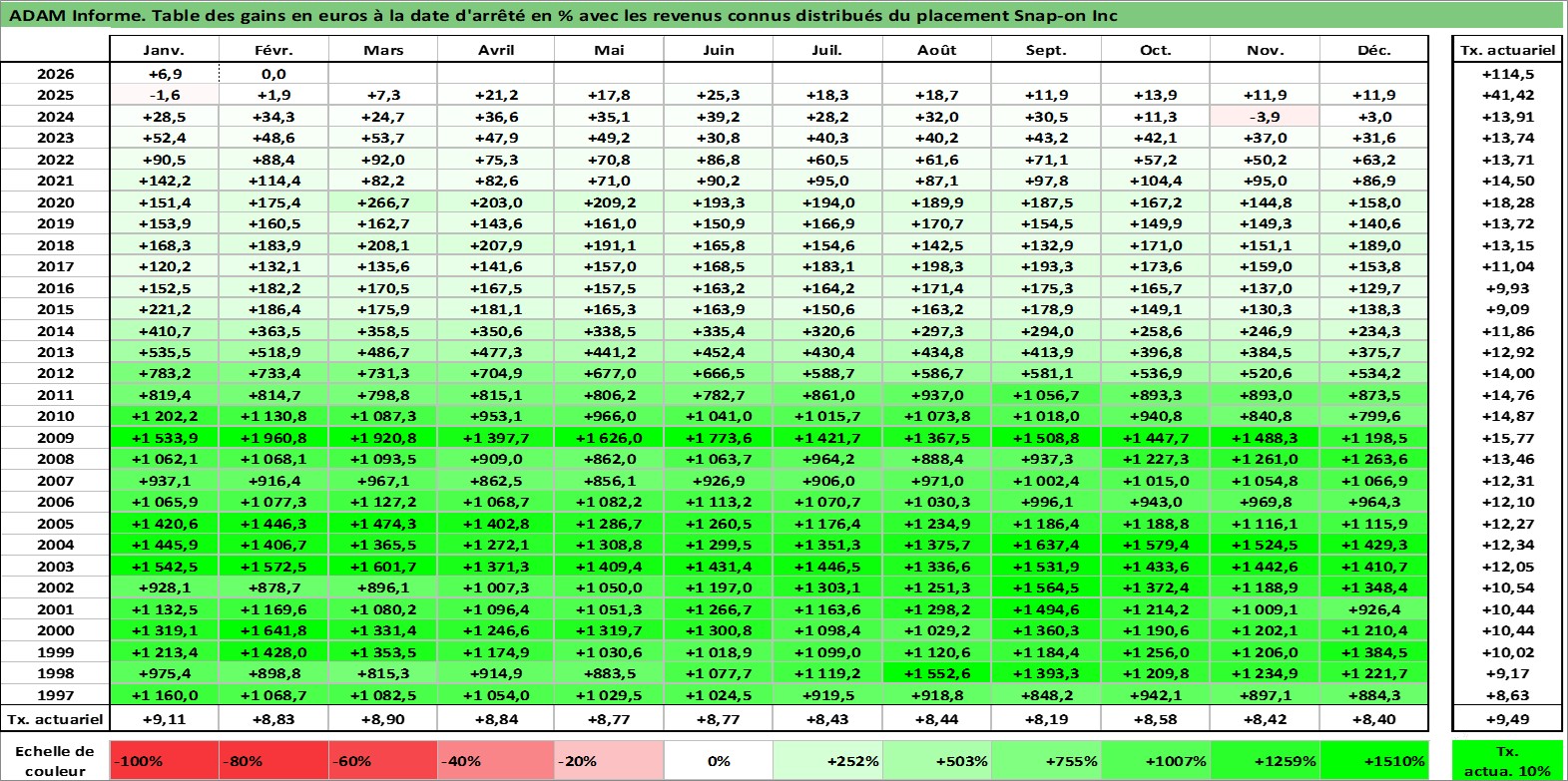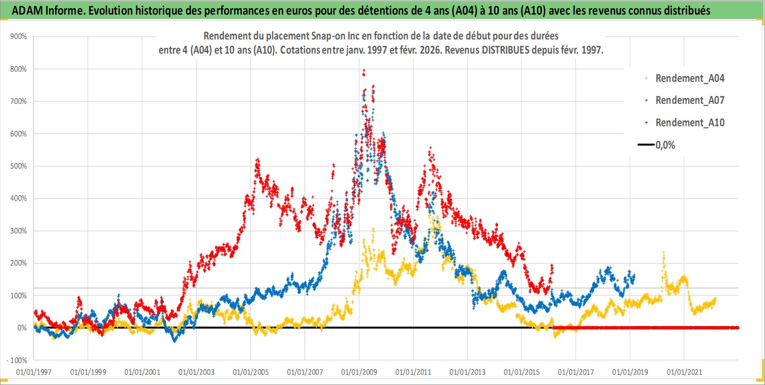 Site dédié aux investisseursPage dédiée sur site financeAnalyse des valorisations hebdomadaires de l'action Snap-on Inc. Cet actif est cote en USD. Les valorisations sont en contrevaleur EURO et couvrent les semaines 1997W01 a 2026W09. Les revenus de cet actif financier sont pris en compte depuis la semaine 1997W07. La note globale ESG de cet actif est estimee a 5.0 (apres rebasage entre 0 et 20).