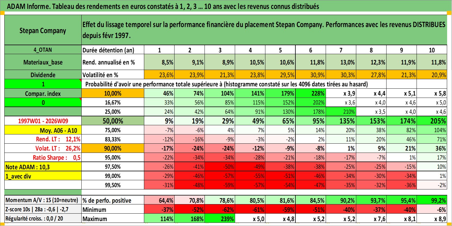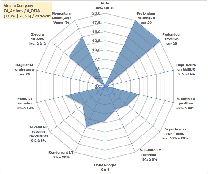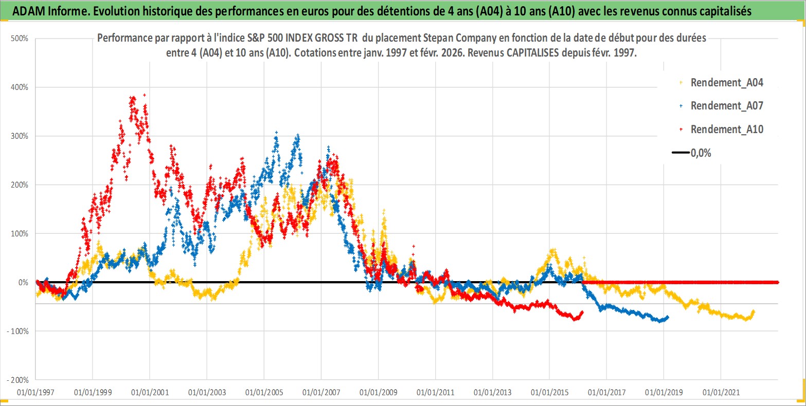 Site dédié aux investisseursPage dédiée sur site financeAnalyse des valorisations hebdomadaires de l'action Stepan Company. Cet actif est cote en USD. Les valorisations sont en contrevaleur EURO et couvrent les semaines 1997W01 a 2026W09. Les revenus de cet actif financier sont pris en compte depuis la semaine 1997W09. La note ESG de cet actif n'est pas connue.