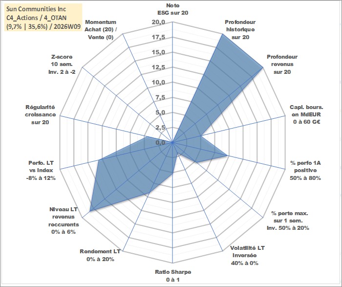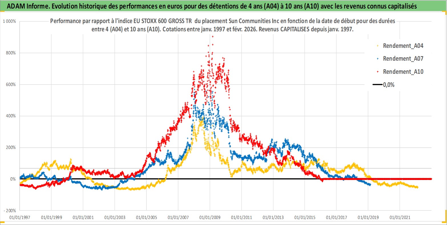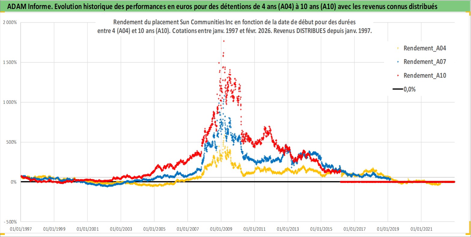 Site dédié aux investisseursPage dédiée sur site financeAnalyse des valorisations hebdomadaires de l'action Sun Communities Inc. Cet actif est cote en USD. Les valorisations sont en contrevaleur EURO et couvrent les semaines 1997W01 a 2026W09. Les revenus de cet actif financier sont pris en compte depuis la semaine 1997W02. La note ESG de cet actif n'est pas connue.