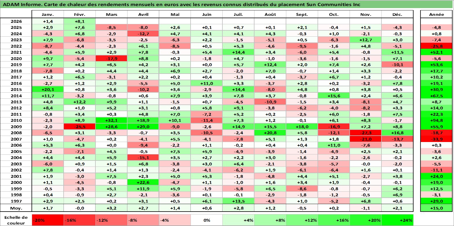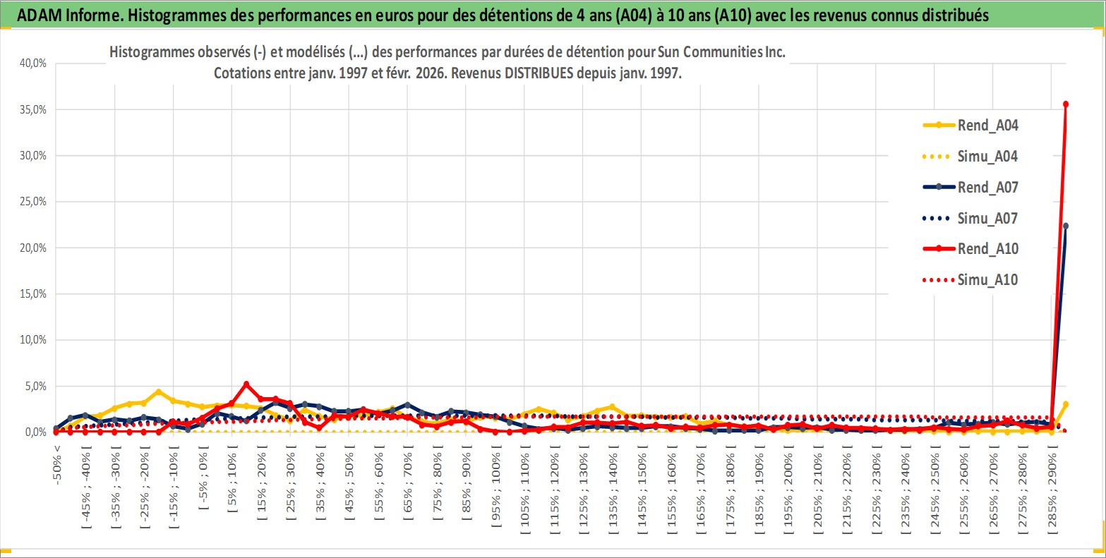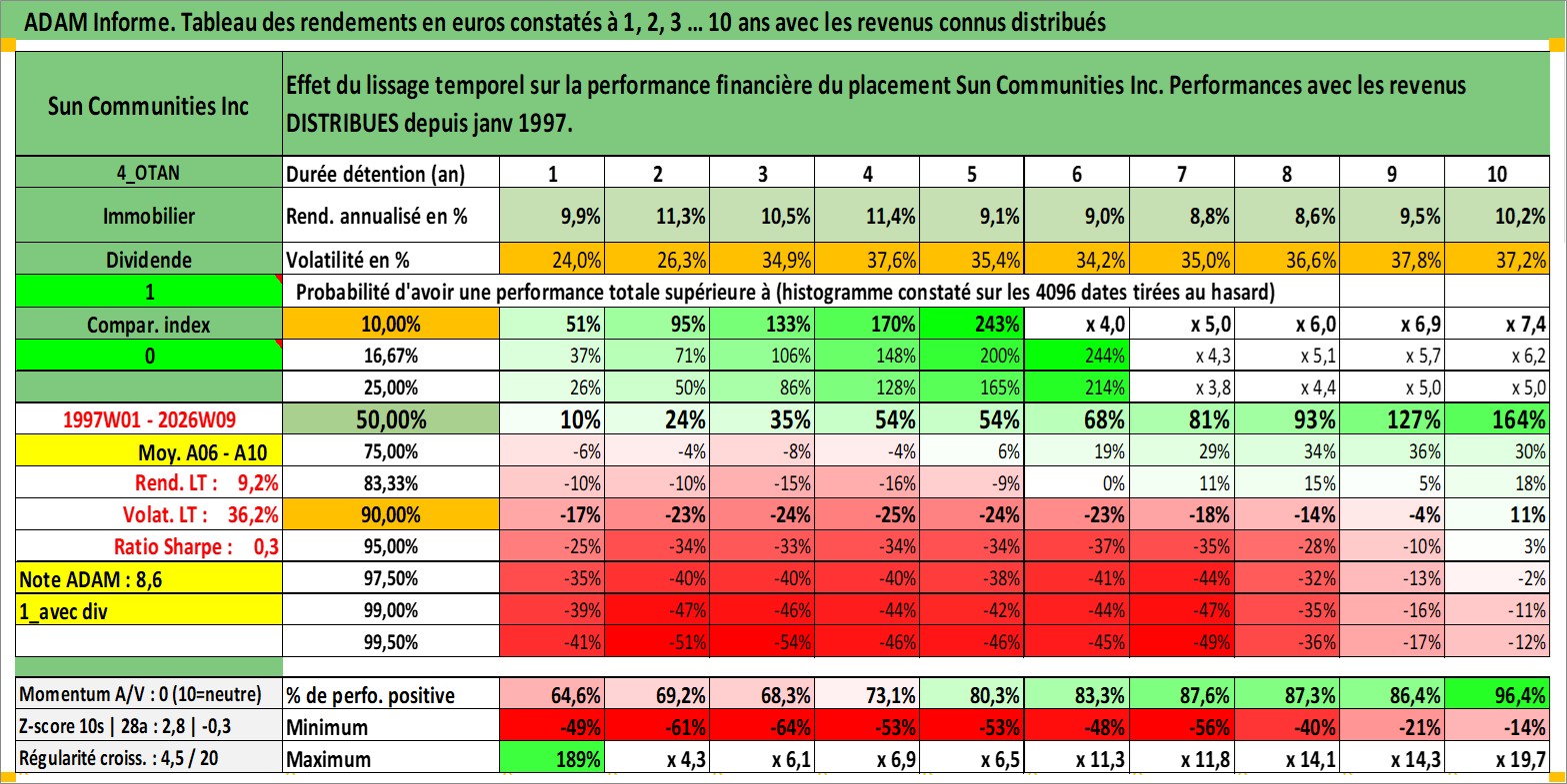 Site dédié aux investisseursPage dédiée sur site financeAnalyse des valorisations hebdomadaires de l'action Sun Communities Inc. Cet actif est cote en USD. Les valorisations sont en contrevaleur EURO et couvrent les semaines 1997W01 a 2026W09. Les revenus de cet actif financier sont pris en compte depuis la semaine 1997W02. La note ESG de cet actif n'est pas connue.