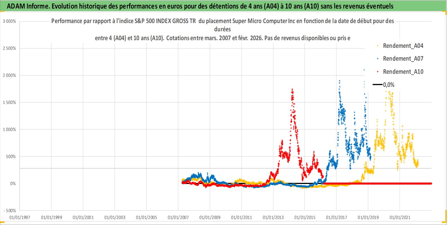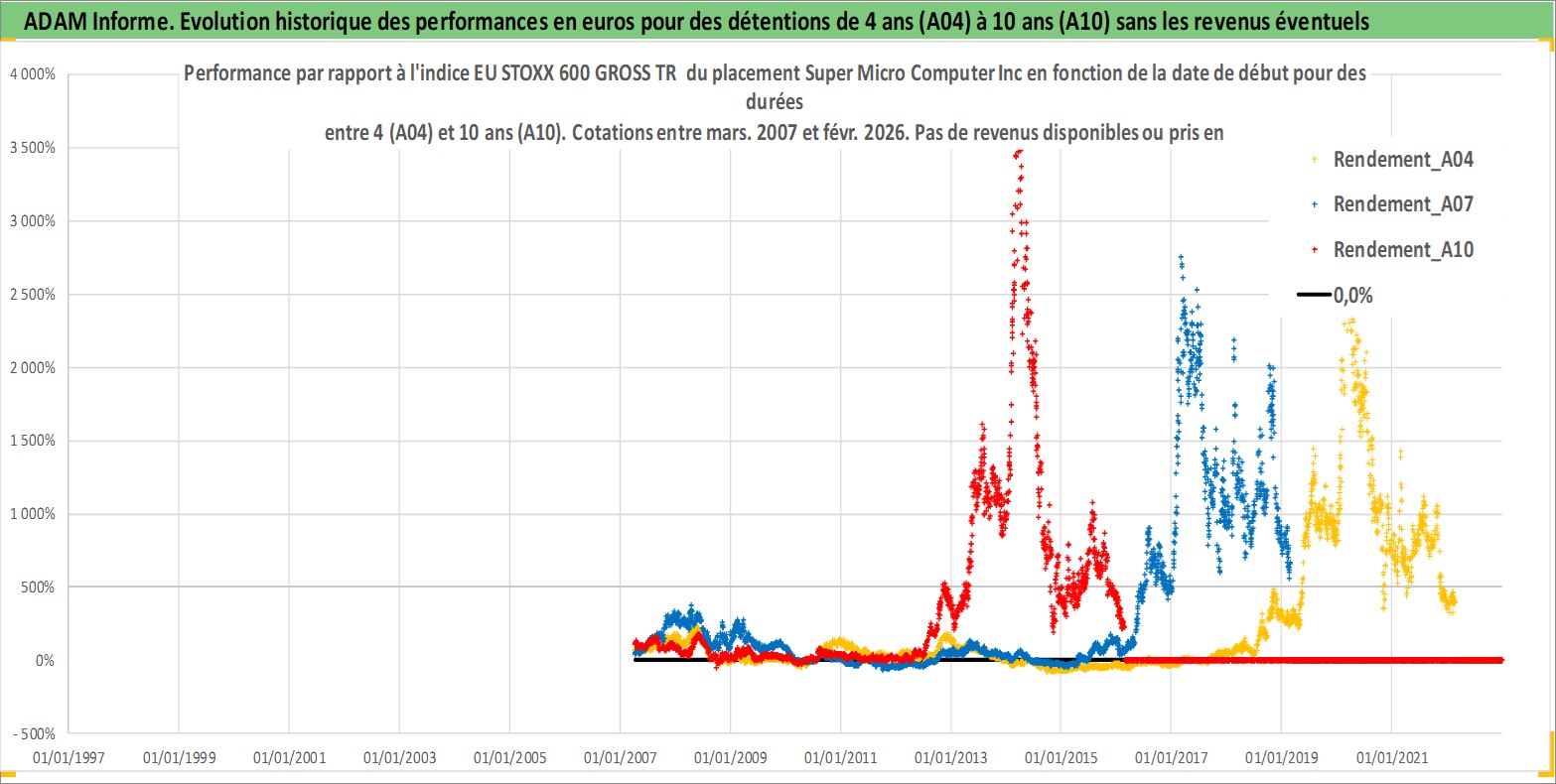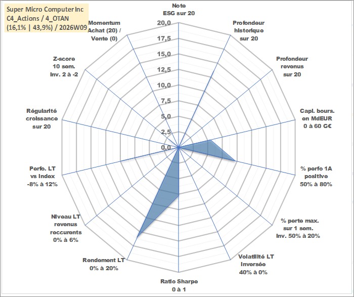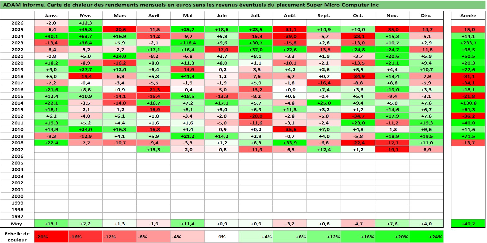 Site dédié aux investisseursPage dédiée sur site financeAnalyse des valorisations hebdomadaires de l'action Super Micro Computer Inc. Cet actif est cote en USD. Les valorisations sont en contrevaleur EURO et couvrent les semaines 2007W13 a 2026W09. Les revenus de cet actif financier ne sont pas connus car non existants ou non disponibles sur le site Yahoo Finance. La note ESG de cet actif n'est pas connue.
